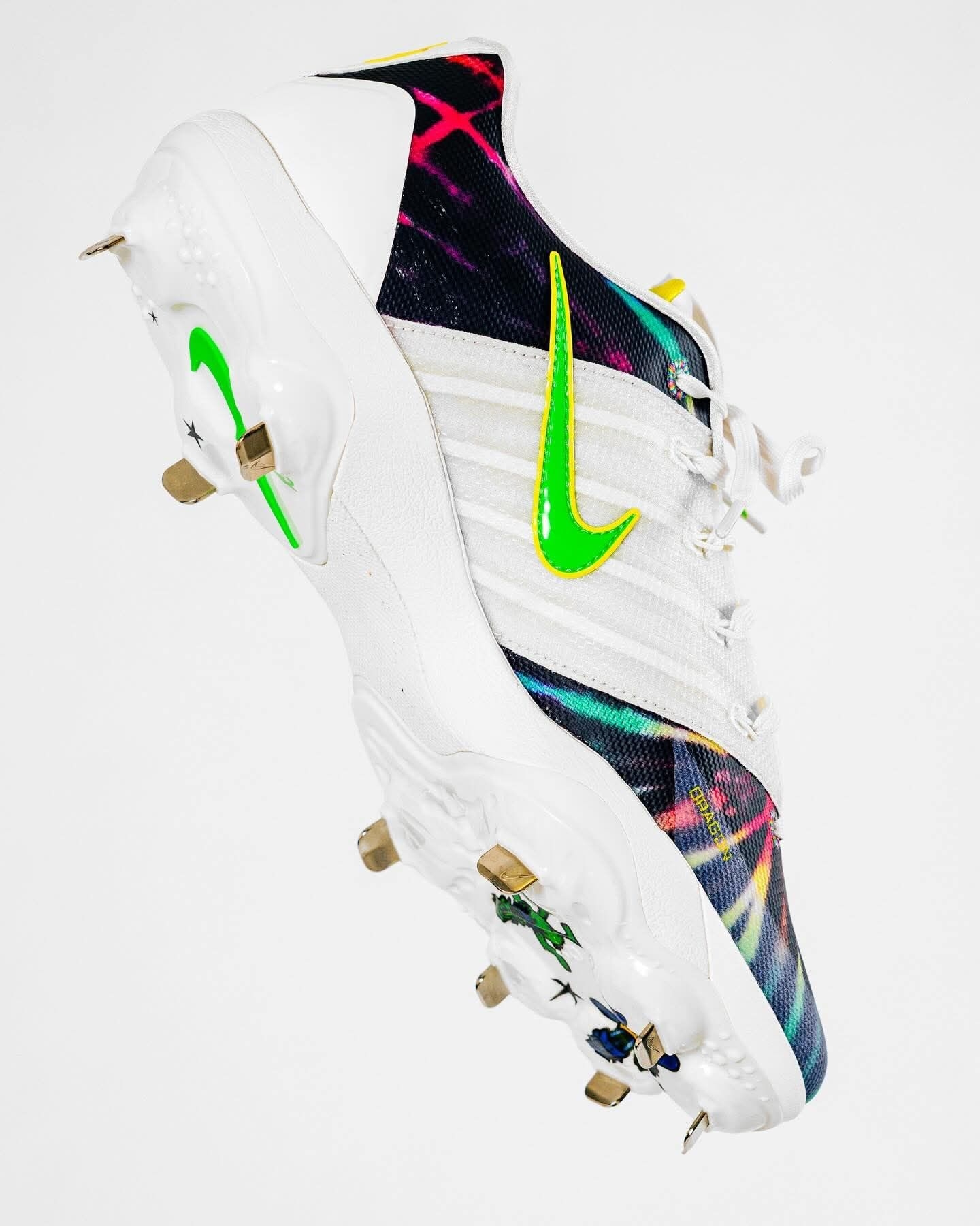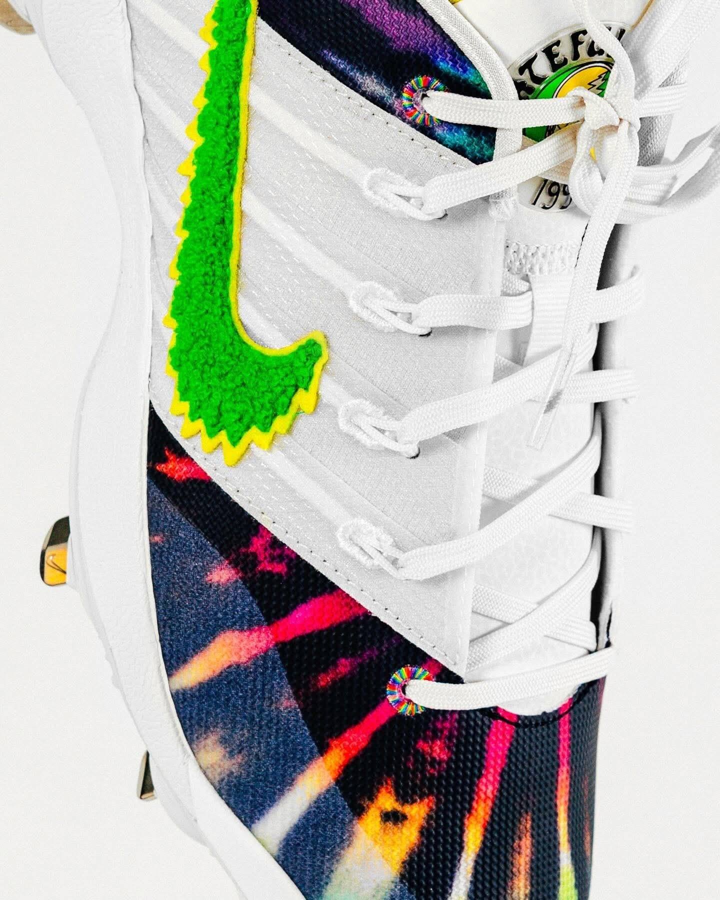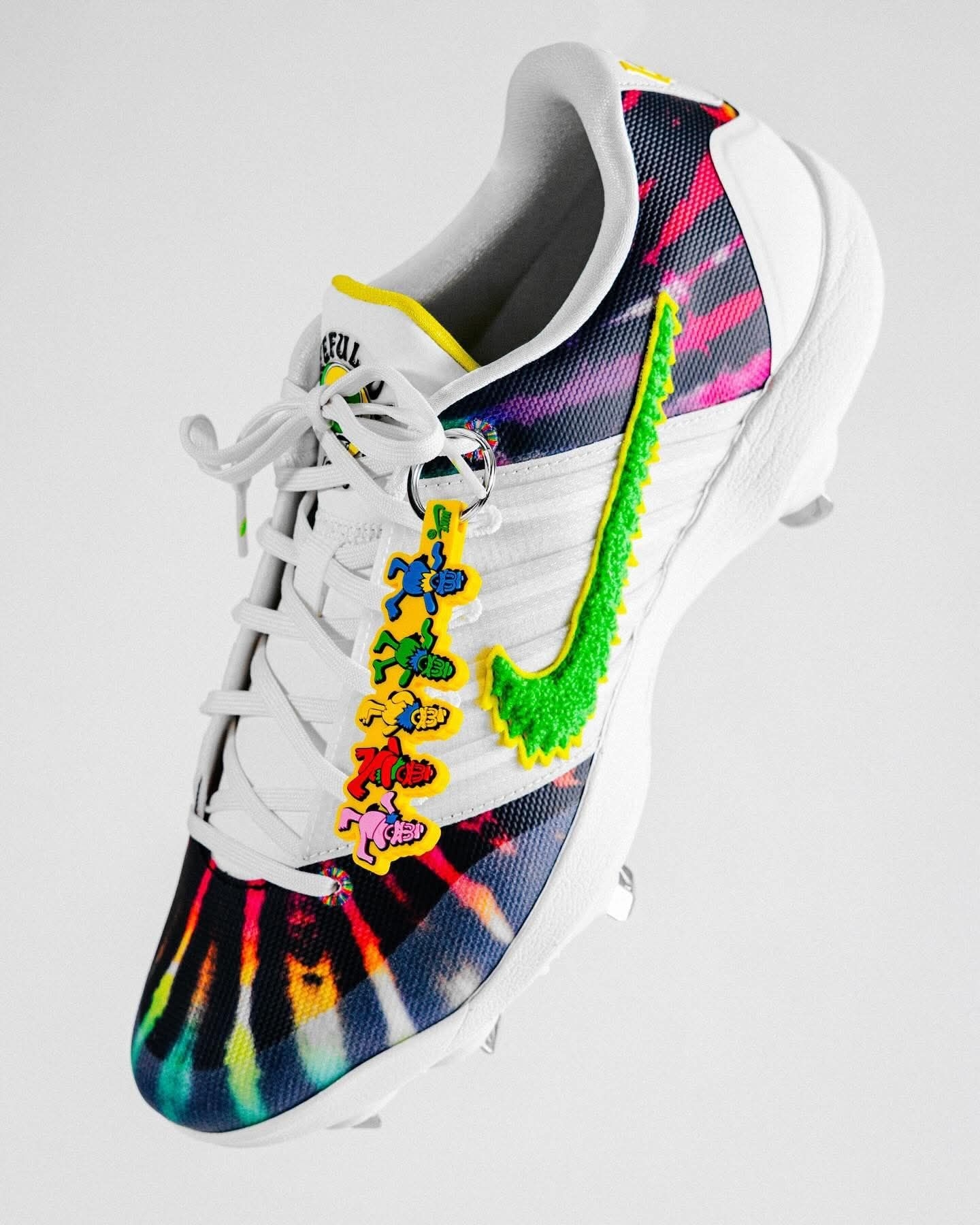 家人们谁懂啊!俄勒冈鸭队这波直接把Grateful Dead的迷幻灵魂焊在了Sabrina 3棒球钉鞋上! 白鞋身打底,鞋头鞋跟的扎染渐变直接把嬉皮氛围拉满,鞋侧的绿色Swoosh自带俄勒冈的DNA,鞋带扣上的彩色跳舞熊挂饰更是戳中摇滚迷的DNA动了! 还有“Grateful Ducks 1990”的专属标识,纪念1990年乐队在俄勒冈大学的经典演出,连配套的打击手套都做了同款扎染和闪电鸭标,细节...
