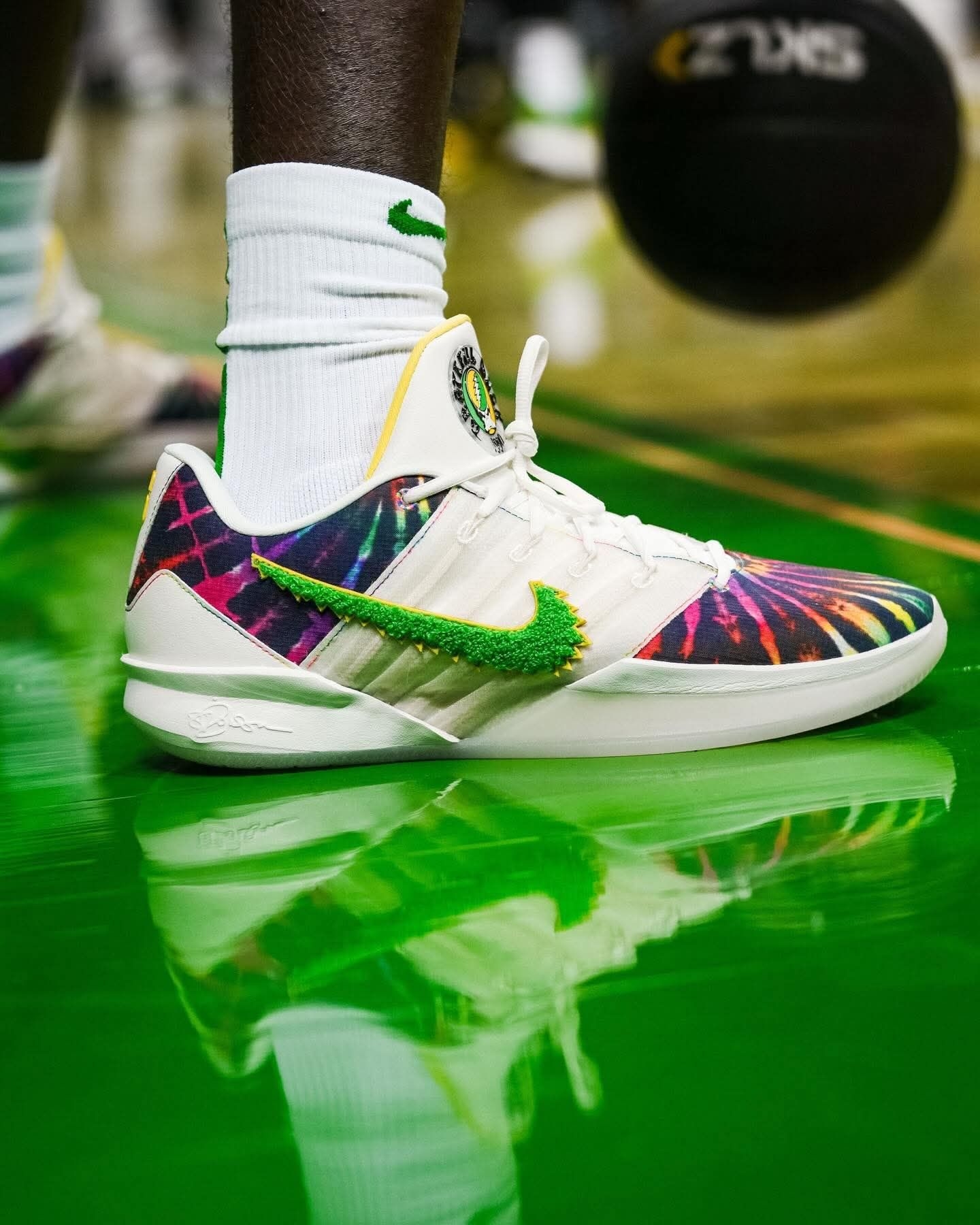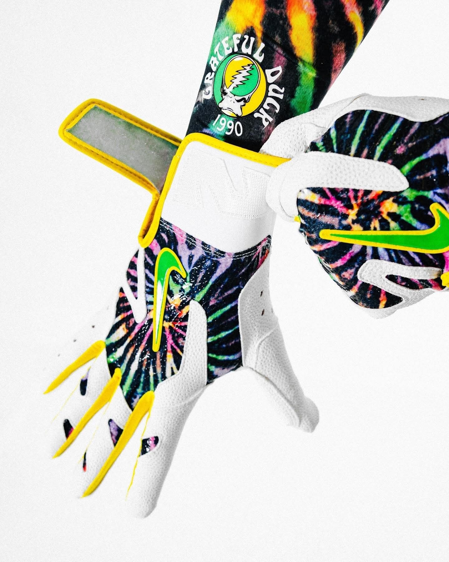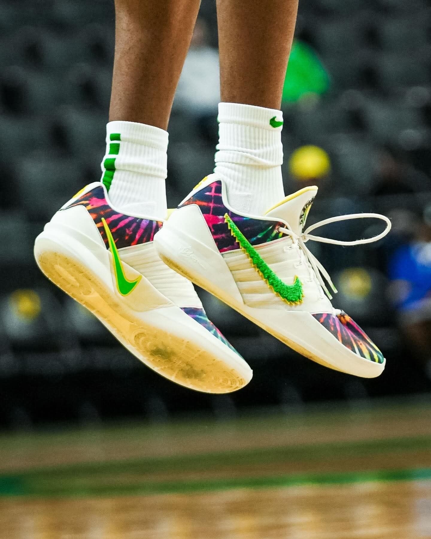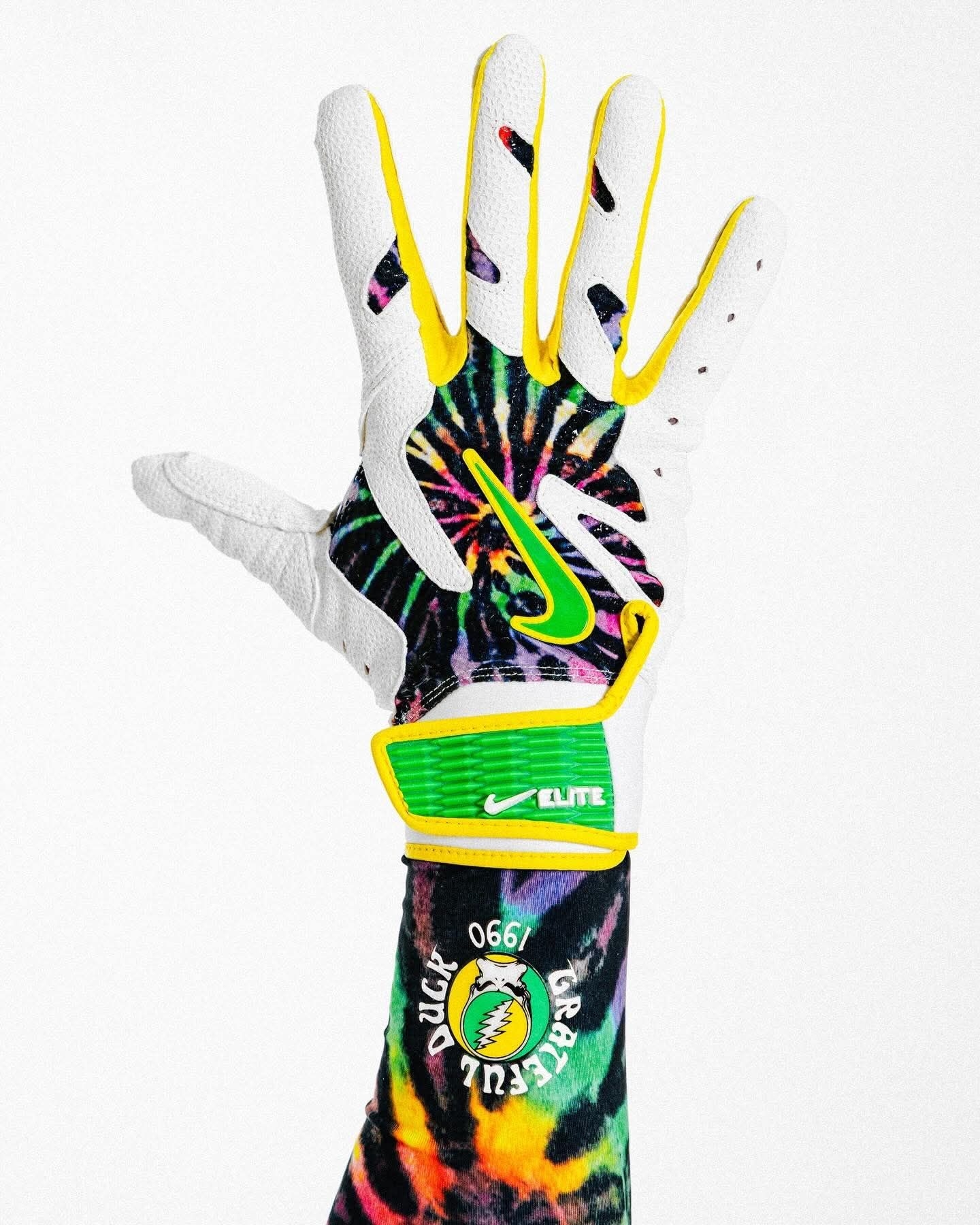 家人们谁懂啊!俄勒冈鸭队这波直接把Grateful Dead的迷幻灵魂焊在了Sabrina 3棒球钉鞋上! 白鞋身打底,鞋头鞋跟的扎染渐变直接把嬉皮氛围拉满,鞋侧的绿色Swoosh自带俄勒冈的DNA,鞋带扣上的彩色跳舞熊挂饰更是戳中摇滚迷的DNA动了! 还有“Grateful Ducks 1990”的专属标识,纪念1990年乐队在俄勒冈大学的经典演出,连配套的打击手套都做了同款扎染和闪电鸭标,细节...