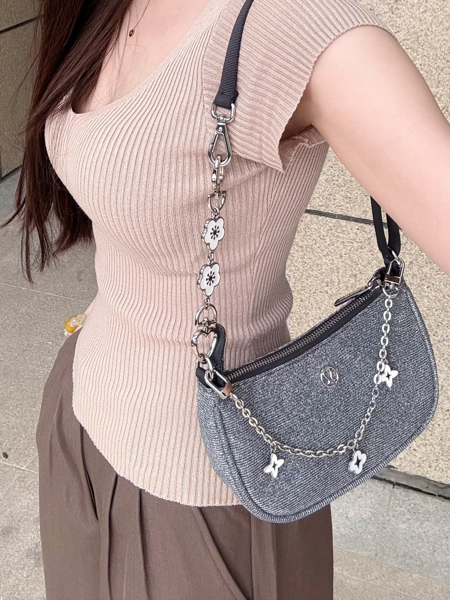 谁懂呀 本来平平无奇的lulu腋下包 加了 兰宝梵 精致链条小配饰 背出去直接被问了八百次链接 改造成本低到离谱 直接告别了单调普通的原版样式 链条⛓️百搭又耐看与包包无色差 自带温柔精致滤镜 出门回头率直接拉满 运动风秒变潮流时尚 质感瞬间翻倍升级 旧包也背出新氛围感哦~