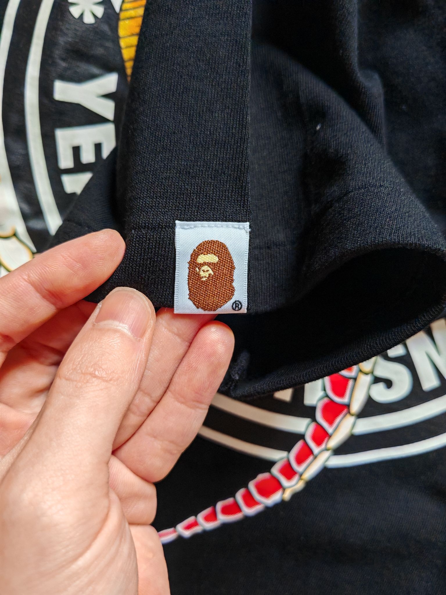 这款Bape的蛇年限定短袖偏修身。S码只适合55kg的兄弟以下穿,体重再大一点的话就得买M码了。算是不厚不薄的厚度,猿人头的印花也很耐造,袖子有型不塌。仔细检查了T恤,没有发现什么瑕疵,算是符合原价699的品控标准。