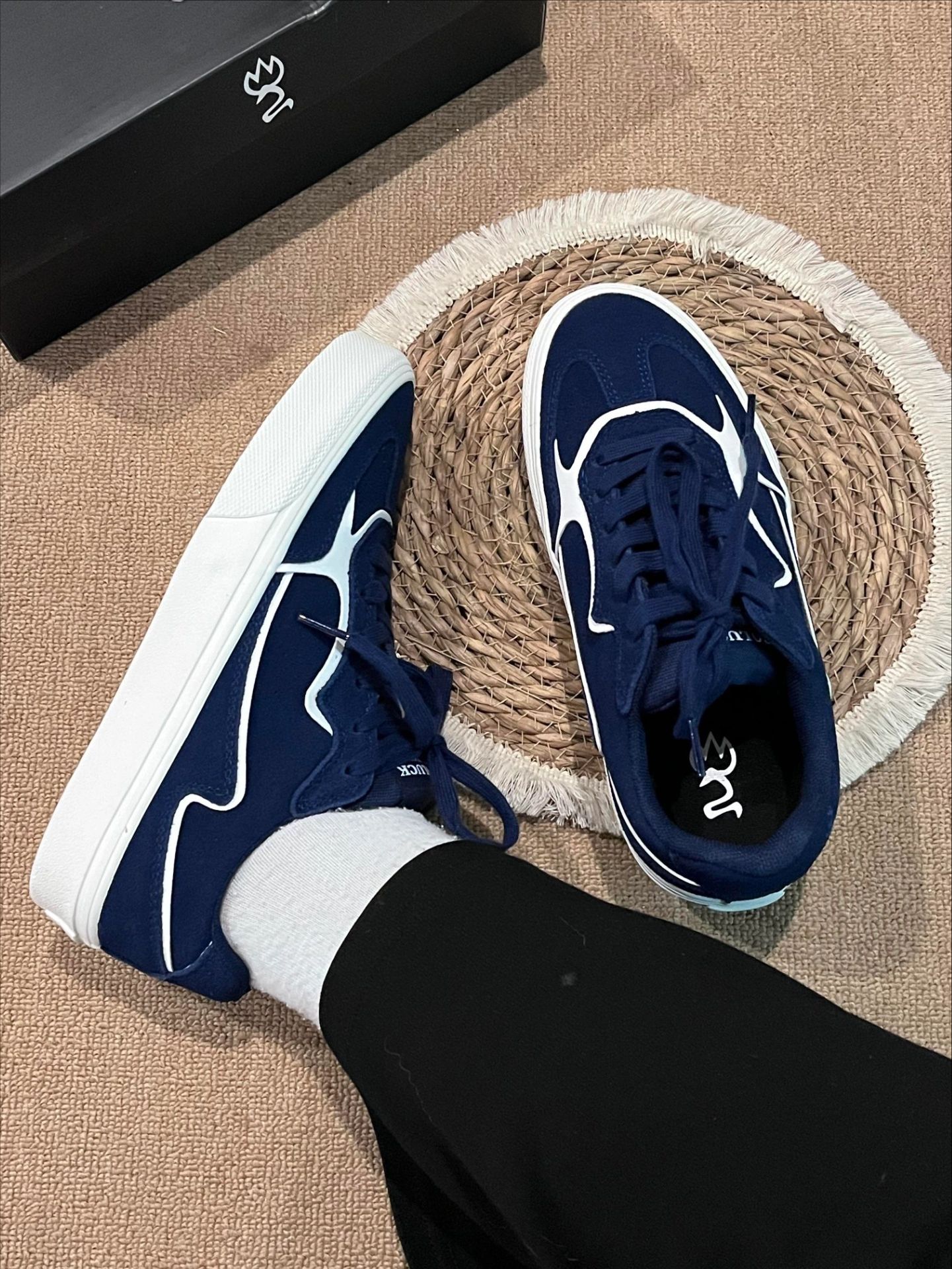 谁能拒绝一双自带氛围感的藏蓝色板鞋啊💙 磨砂麂皮质感高级又软糯,低调的藏青色超耐看 侧边白色闪电图案设计小众又吸睛,不会烂大街 简约小白边拼接,中和深色沉闷感,层次感拉满 上脚脚感软糯舒服,鞋底柔软不磨脚 日常搭牛仔裤、运动裤、阔腿裤都超适配 复古休闲风拿捏,通勤、约会、出行穿都合适 平价百搭宝藏鞋,秋冬穿搭氛围感全靠它~
