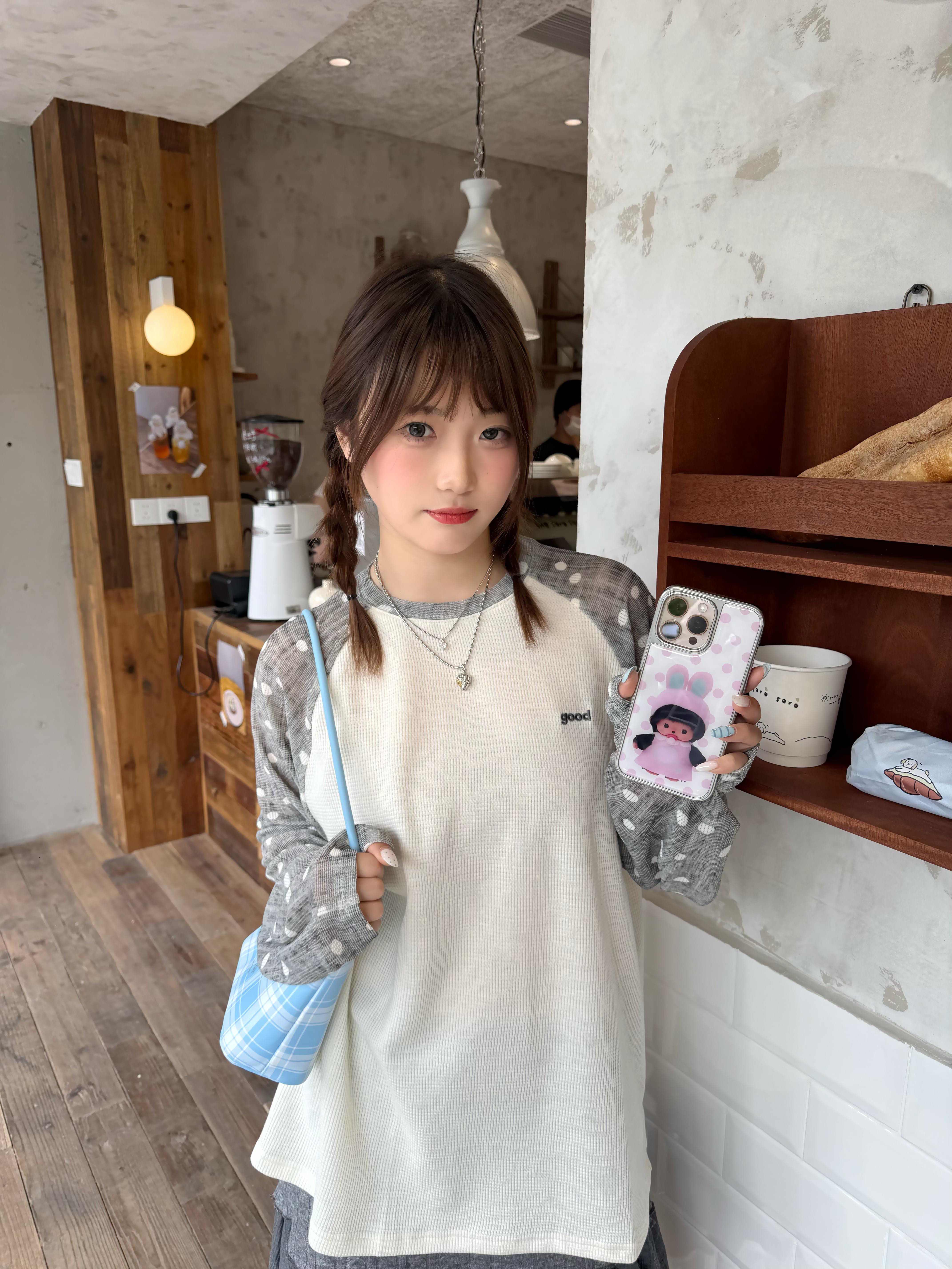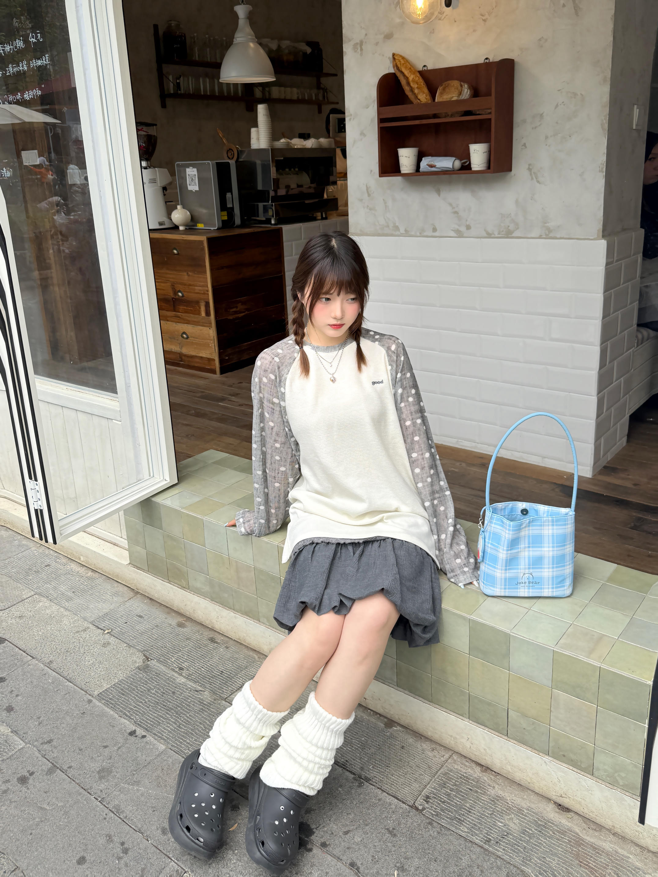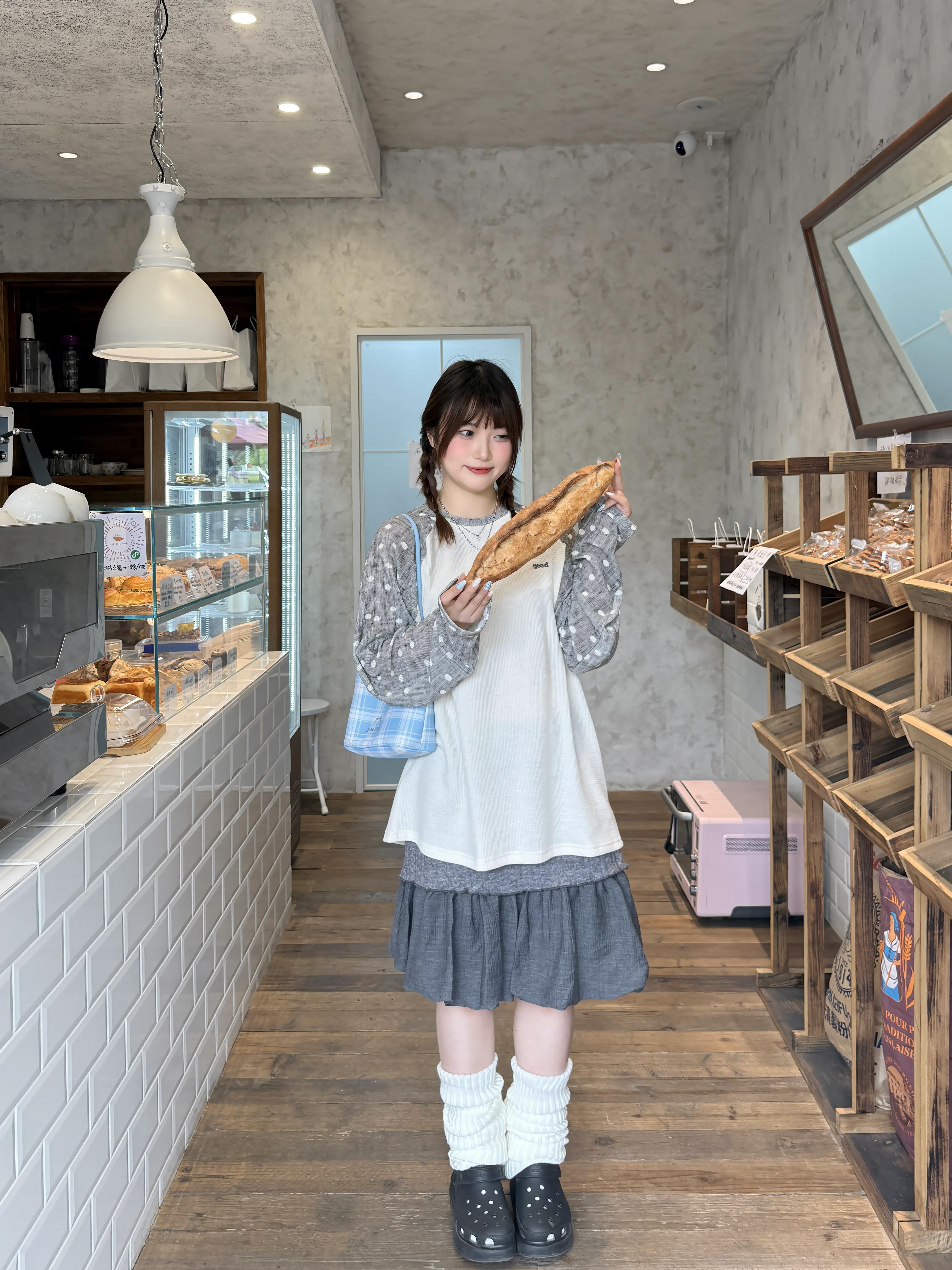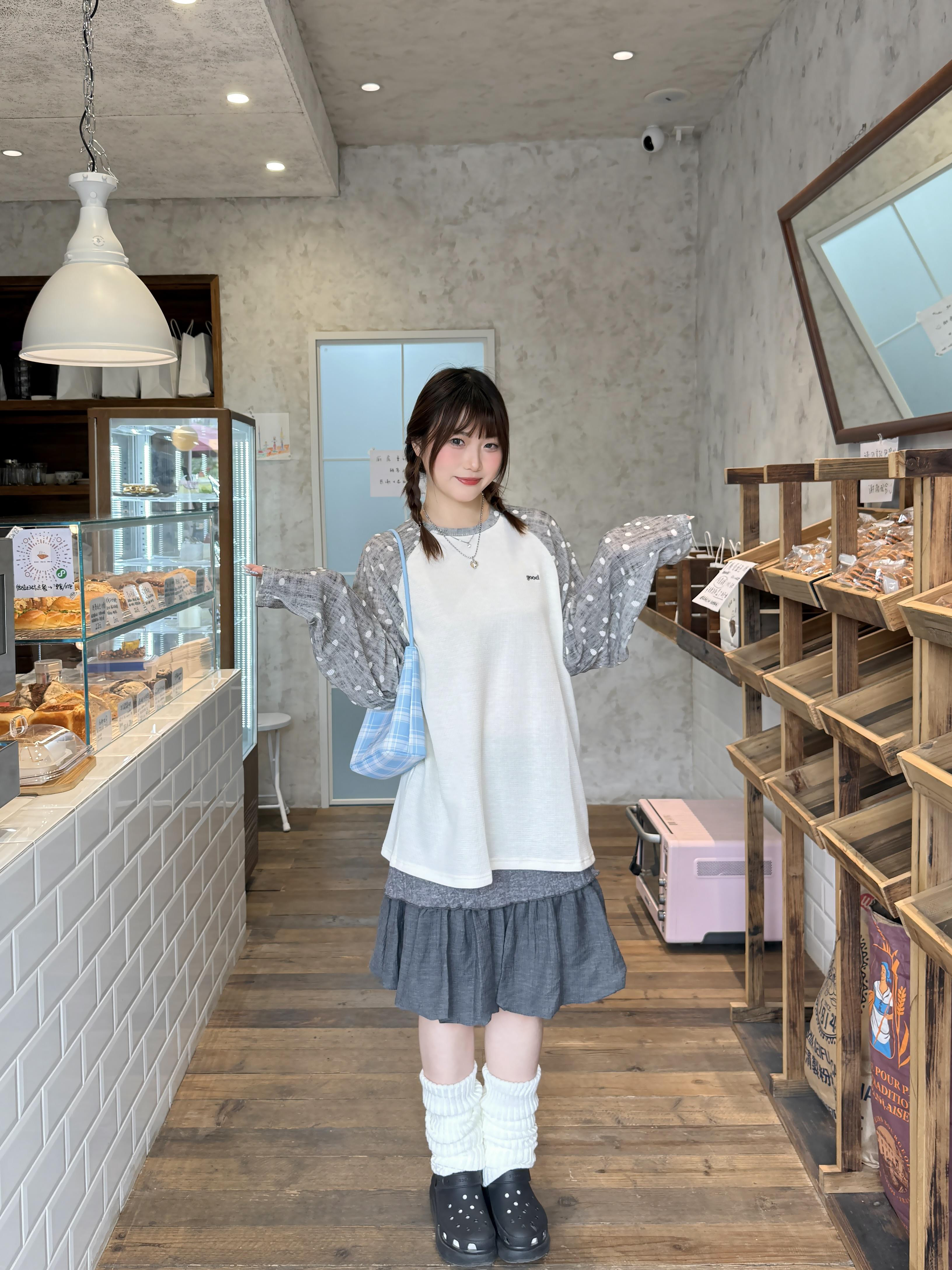 周末直接扎进面包店的松弛时刻✨ 波点插肩袖长袖T恤+灰色拼接蛋糕裙,把舒服好看焊在身上,不用费力也能拿捏的off duty精致感