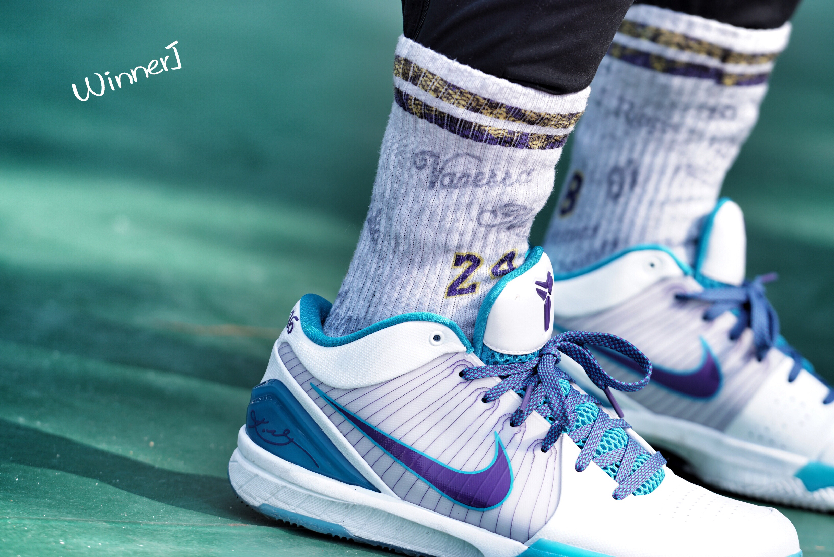 选秀日配色,科比4复刻系列的首发色,非常好搭配的黄蜂配色。球鞋细节丰富,打球上街都很好看。