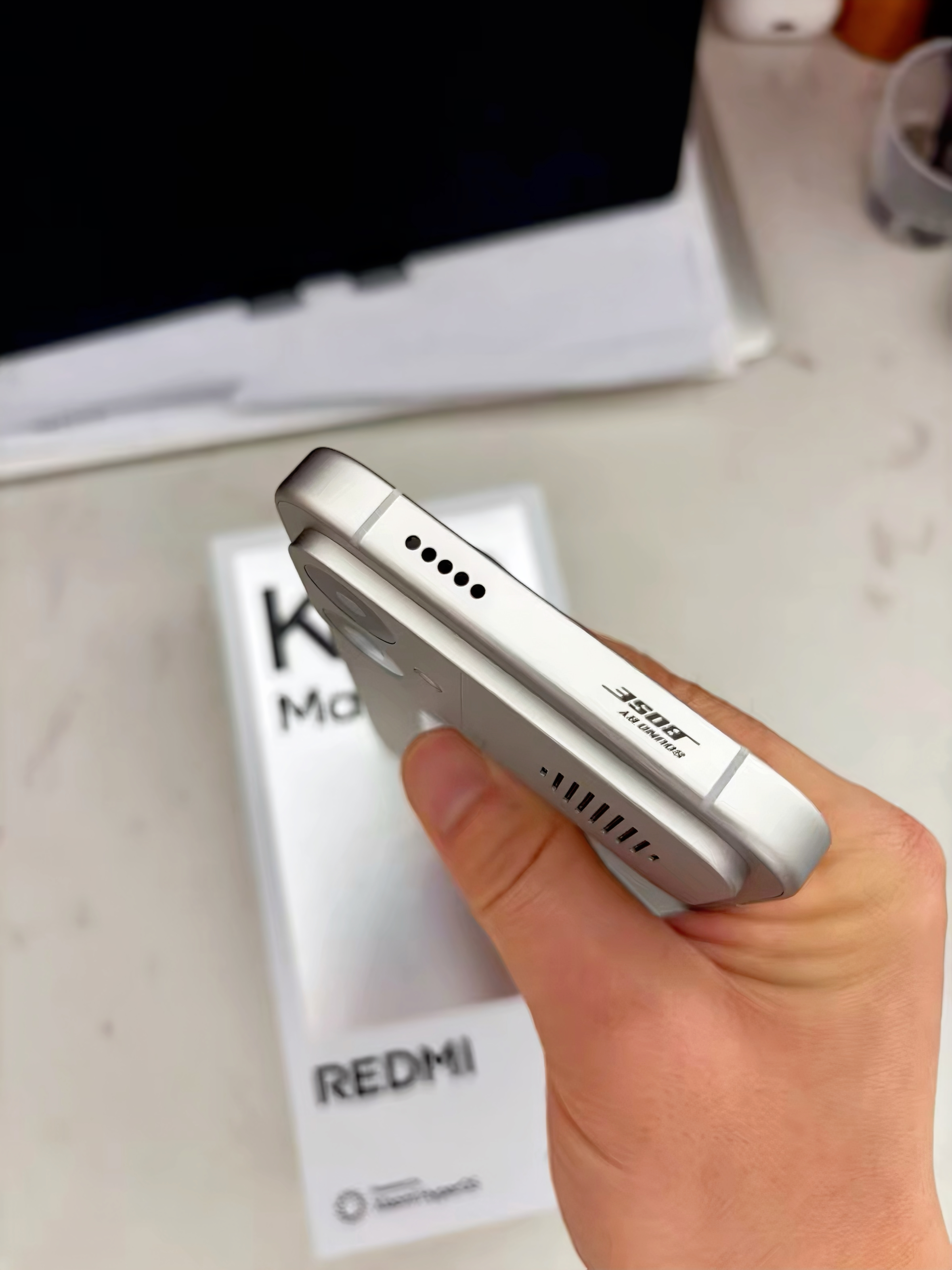 上手体验Redmi K90 Max 太空银,整体设计风格一改红米以往的质感,外观简约克制,线条利落,结合几何结构与格栅元素,带有简约的德系设计风格,整体颜值辨识度很高。 这款机型最大的设计亮点,在于机身镜头侧边与底部的开孔结构,内置18.1毫米大直径散热风扇,搭载风冷散热系统,专门针对高负载游戏场景优化散热性能。 定位游戏机型的同时,外观设计兼顾日常使用审美,造型简约大方,不会有过度的电竞化设计,...