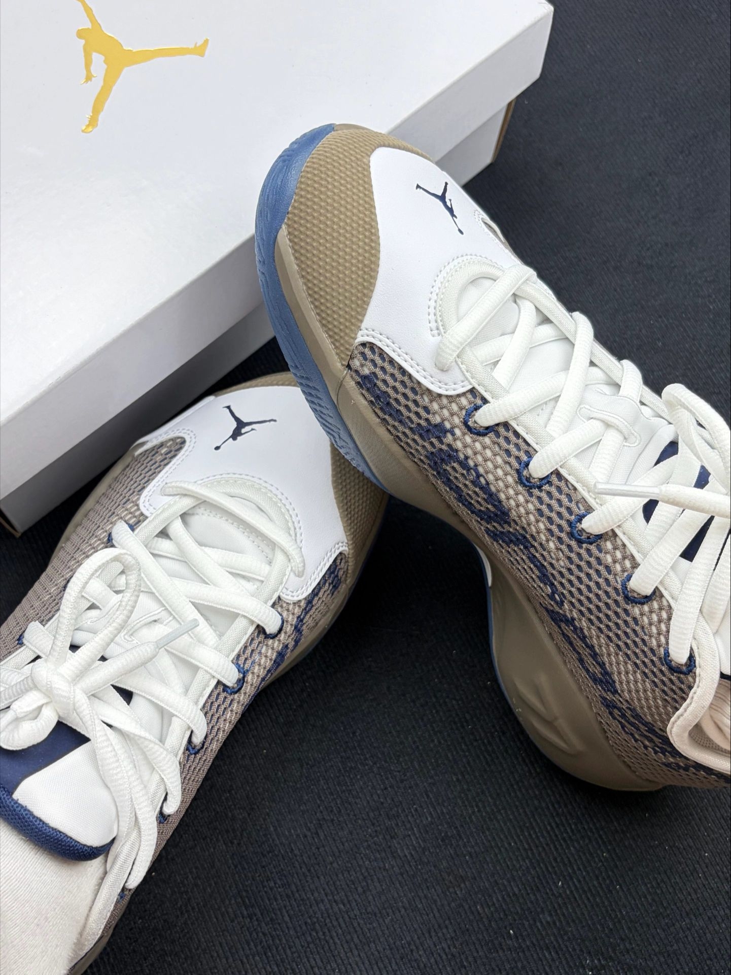 【Jordan复古篮球鞋】越穿越顺手的实战日常两栖款 🎨米白+卡其+藏蓝,低调耐看 打球穿不突兀,日常搭牛仔裤也完全OK。 🌬️网面鞋面很透气,夏天打全场脚不闷汗 包裹感刚好,不挤脚也不晃。 🦶中底脚感很稳,缓震实在 落地不震脚,急停变向也不拖沓。 🔲水晶底纹路深,抓地力够稳 木地板、橡胶地都hold住。 ⚠️尺码参考 鞋型偏窄,宽脚建议买大半码,亲测刚刚好。 ✅一句话总结 越穿越顺手...