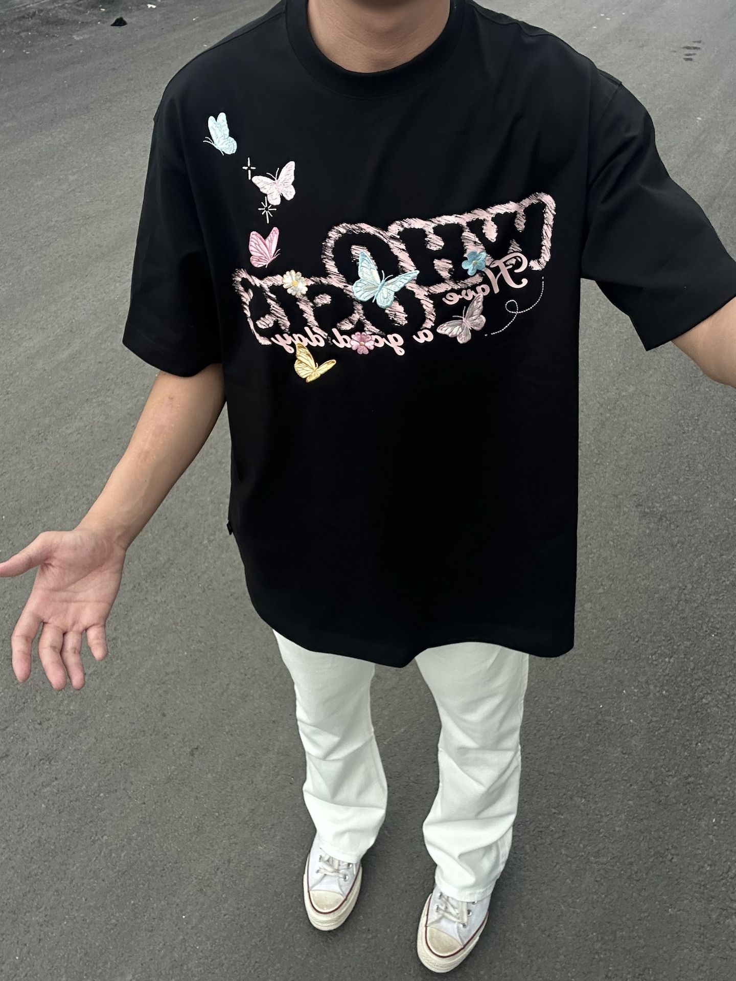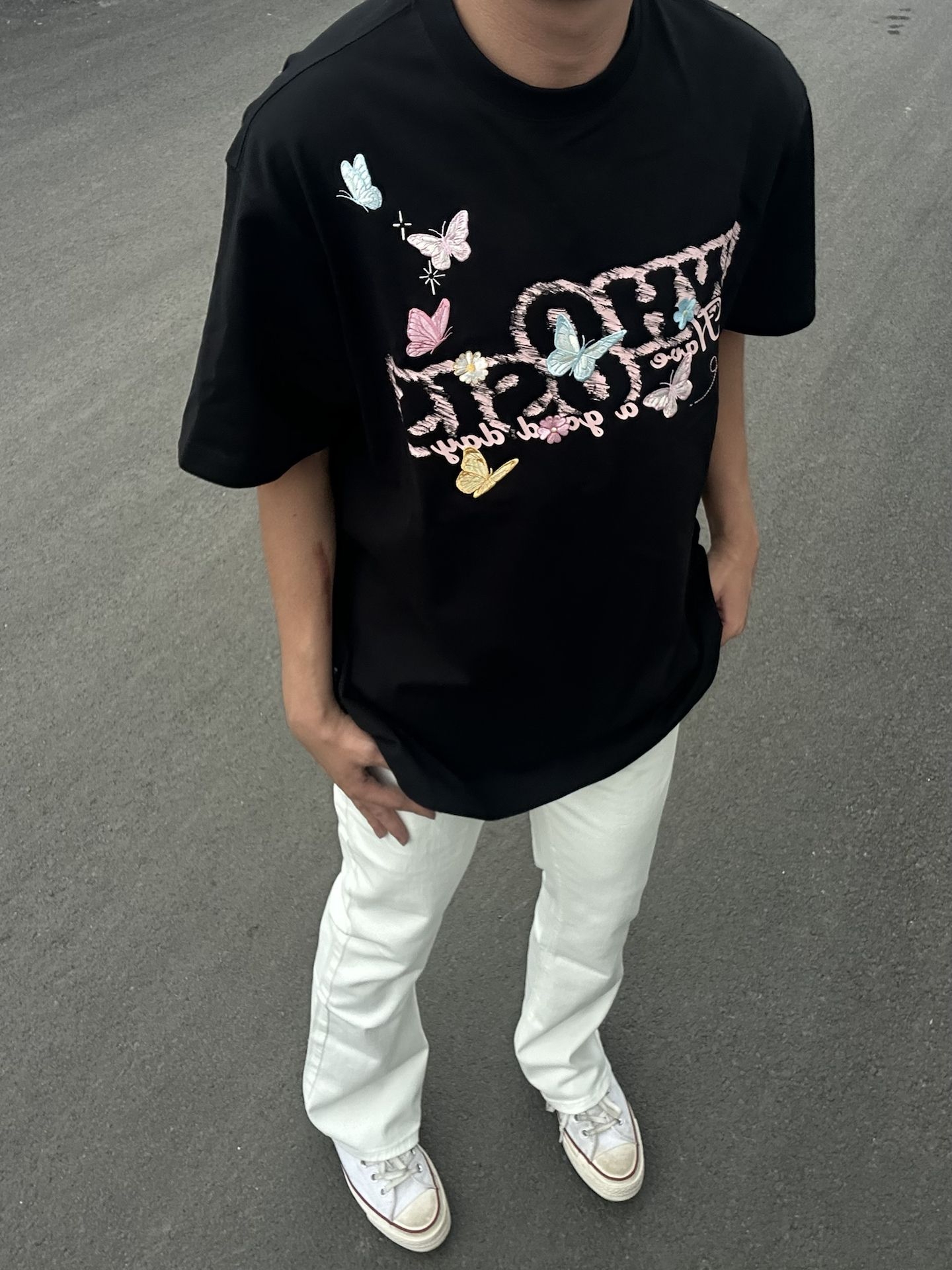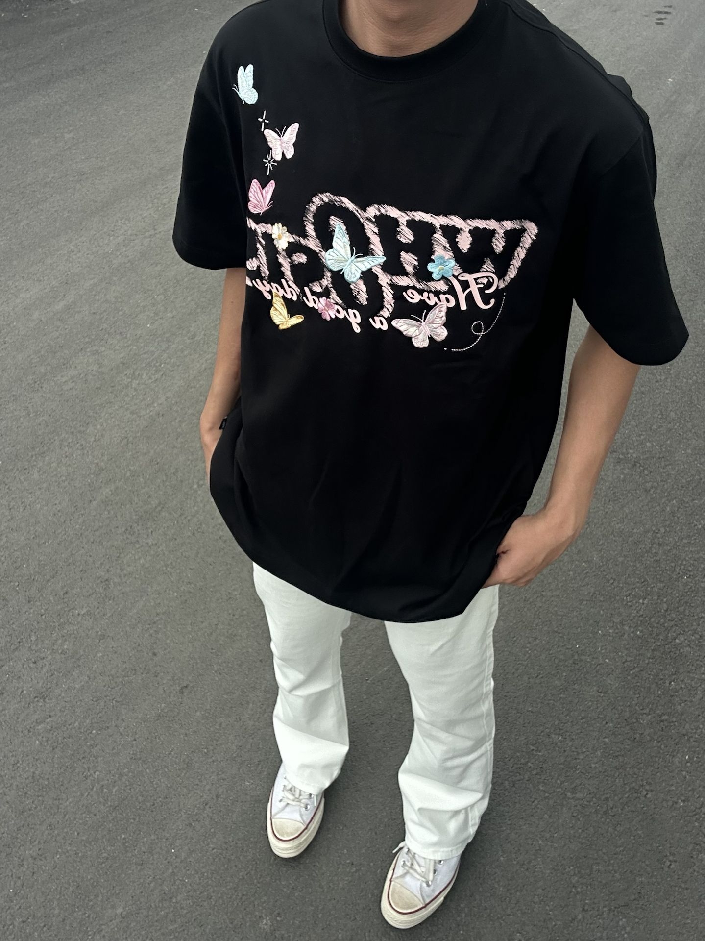 蝴蝶落在衣摆,风里都是松弛的信号✨ 黑T配白裤,把夏天的清爽和甜酷焊在身上 愿日子像这只蝴蝶,自在轻盈,也愿你,每天都有好心情