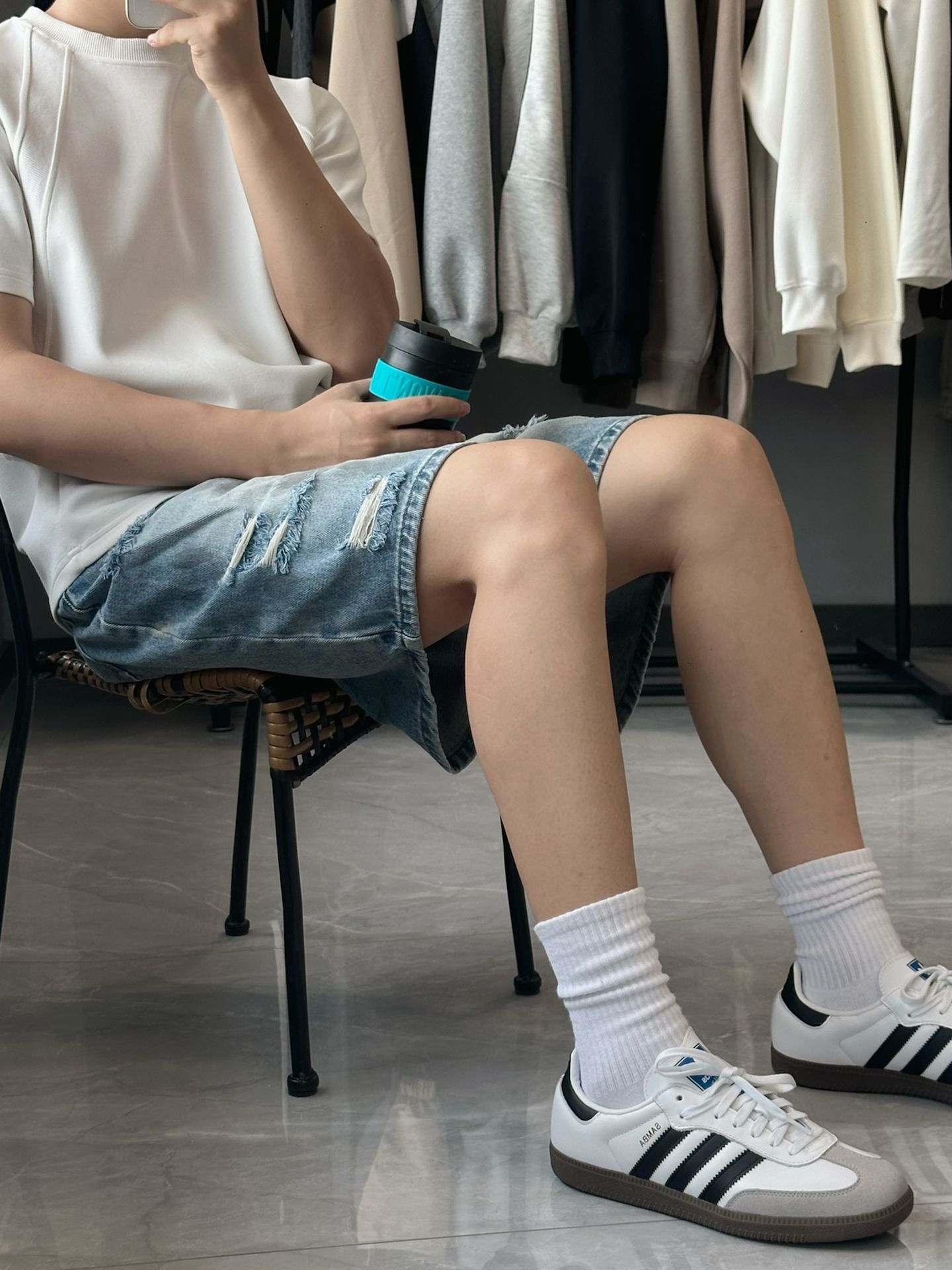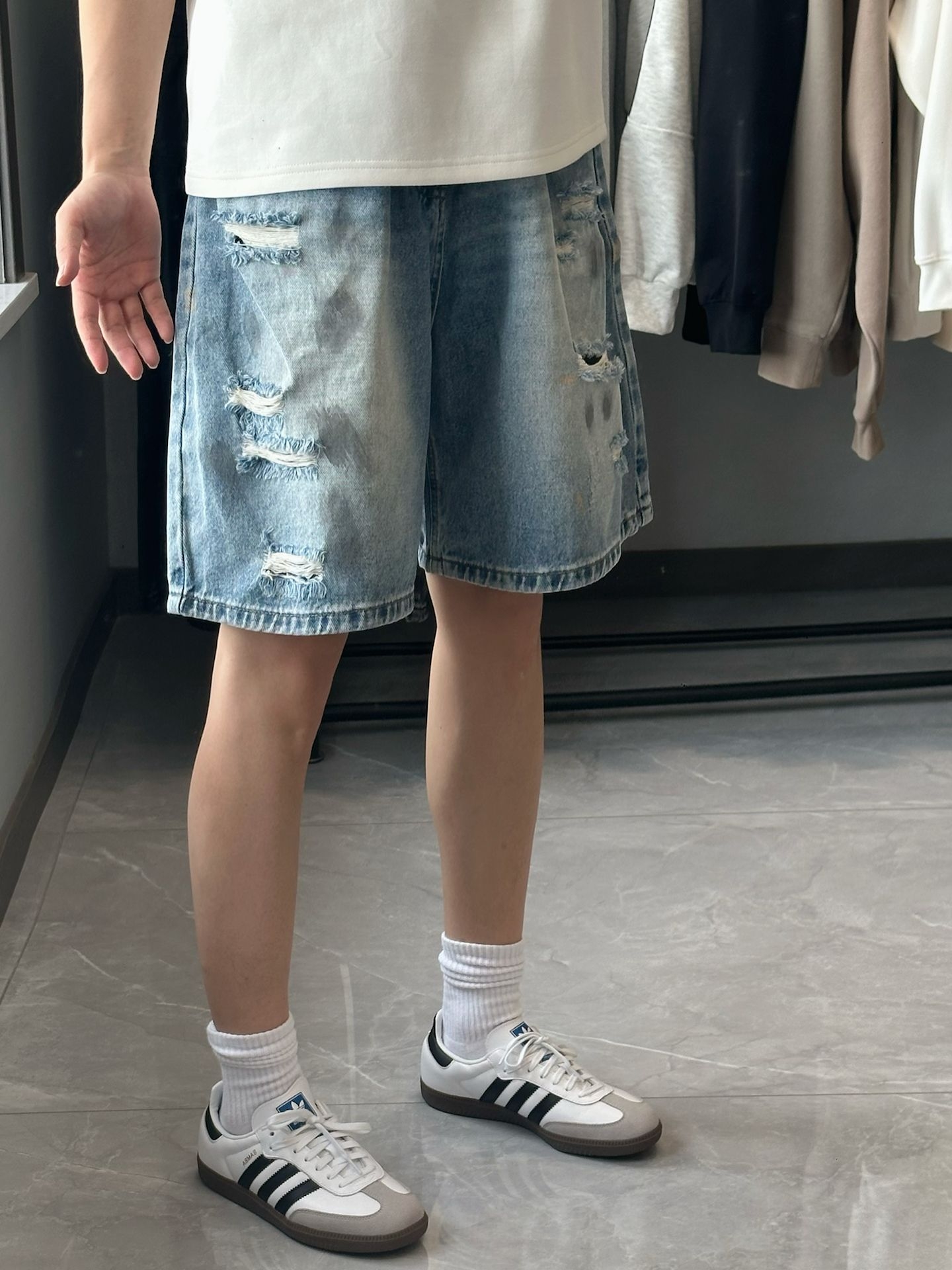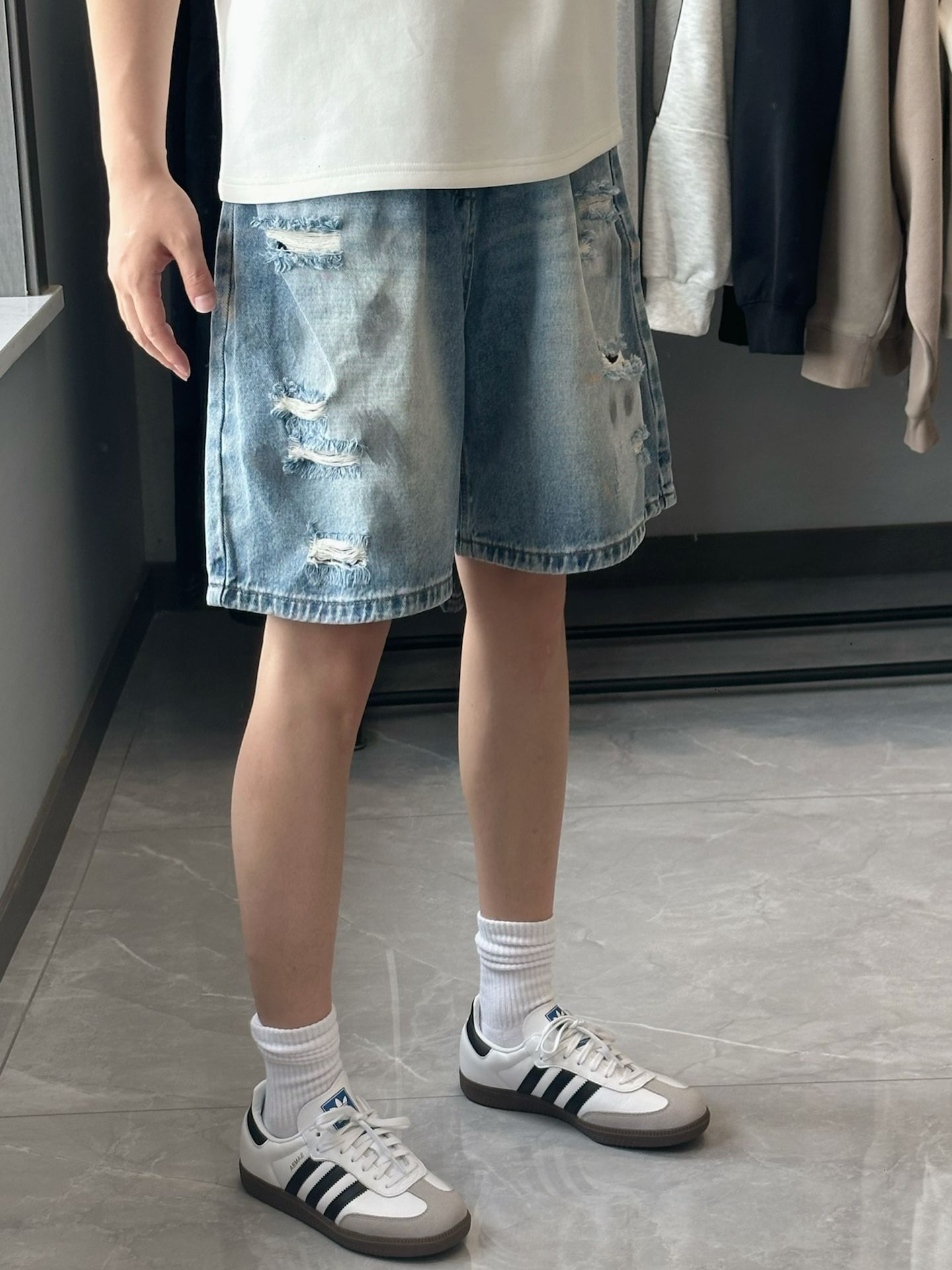 ootd|做旧破洞牛仔短裤+德训鞋穿搭来啦!宝子们今天给大家分享一条百搭牛仔短裤! 🌈🌈🌈 🩳:来自 #MARK ROBERTSON 家的! 短裤版型宽松舒适非常百搭好看! 什么有做旧的痕迹搭配上破洞设计! 裤子整体的做工用料质感很好! ✨✨✨ 👔:白色修身短袖! 👟:阿迪达斯德训板鞋! 本人175cm 65kg 🩳尺码:L(穿上偏宽松) #宝藏破洞牛仔短裤 #夏日混搭计划 #重建穿搭思维 #...