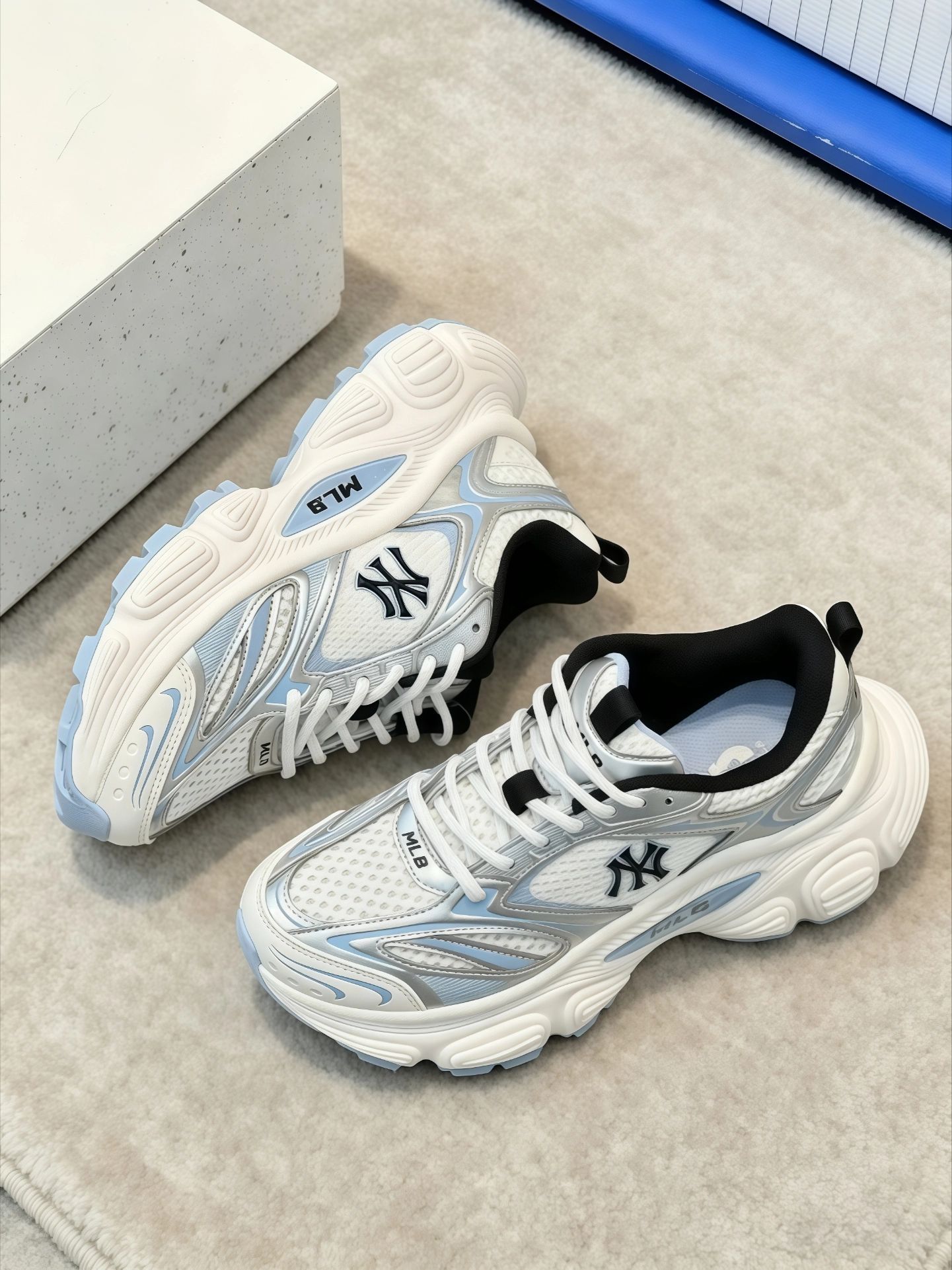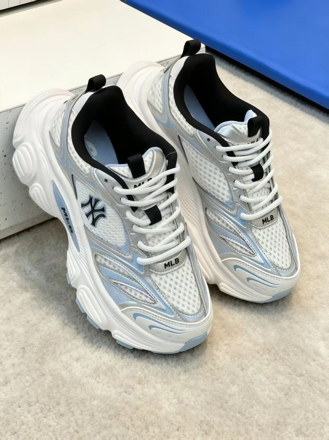 挖到宝藏神仙老爹鞋✨MLB银蓝配色美到犯规 极简银灰撞色浅蓝,高级又清爽,自带清冷韩系滤镜,颜值直接戳在心巴上💙 轻量化厚底设计,上脚舒服不压脚,暴走一整天毫无压力,悄悄拉长腿部线条 复古运动风拉满,细节质感在线,不管是日常休闲还是潮流穿搭都能完美适配,春夏百搭刚需款,闭眼入不踩雷!