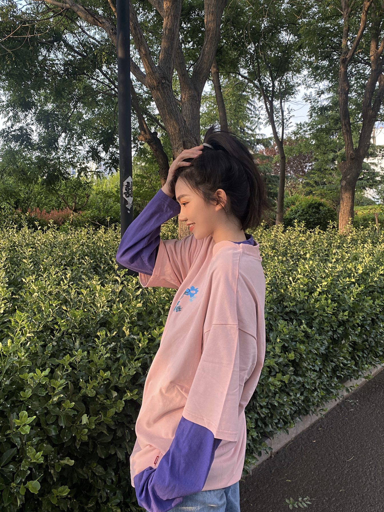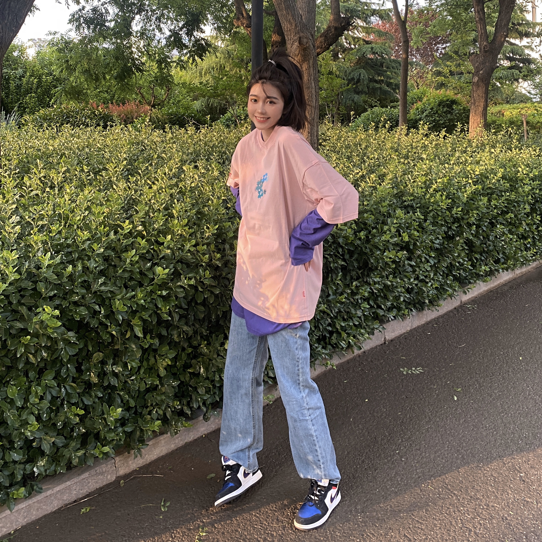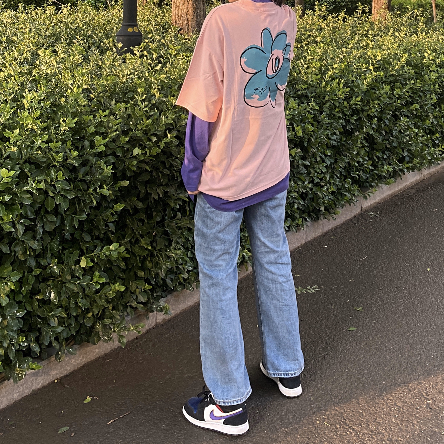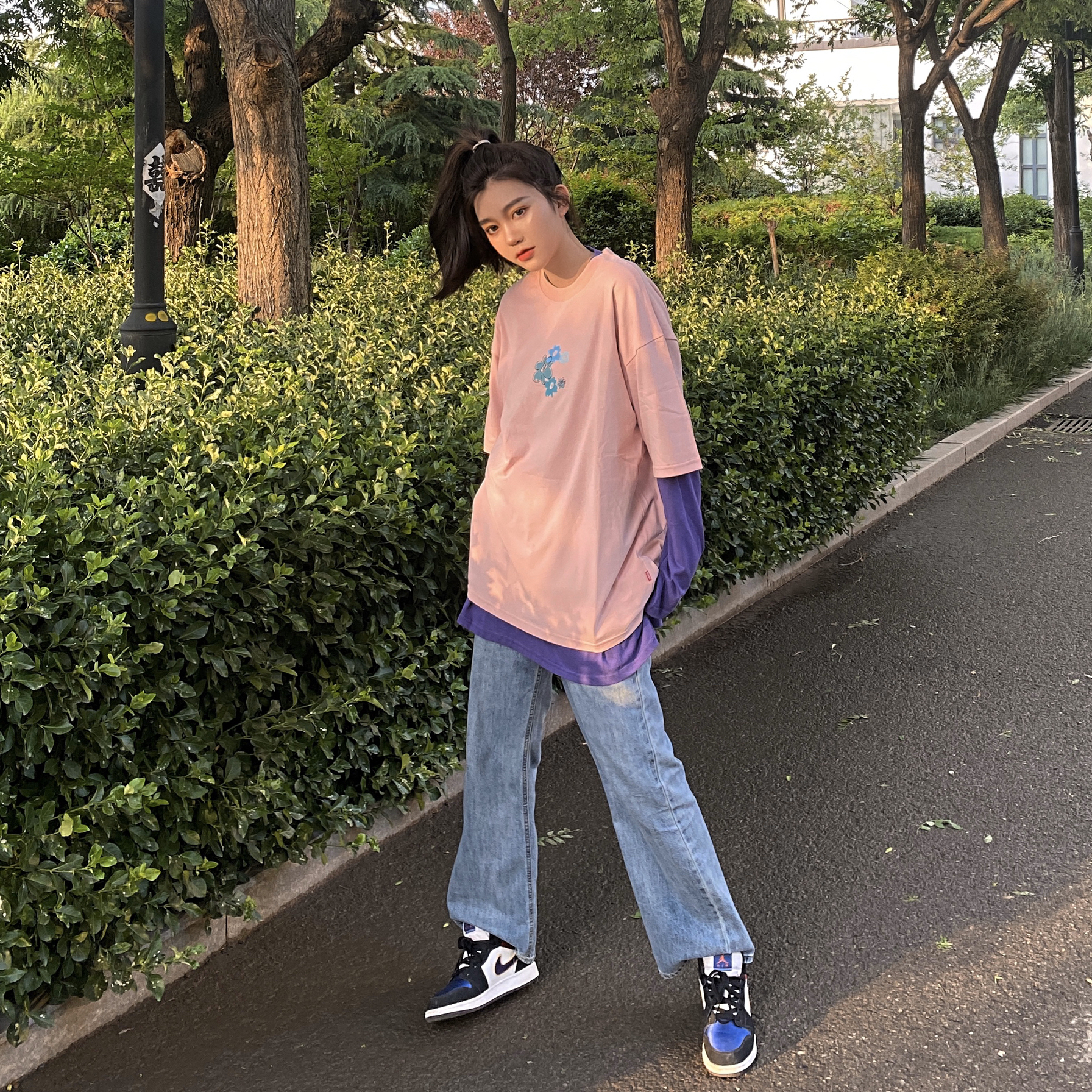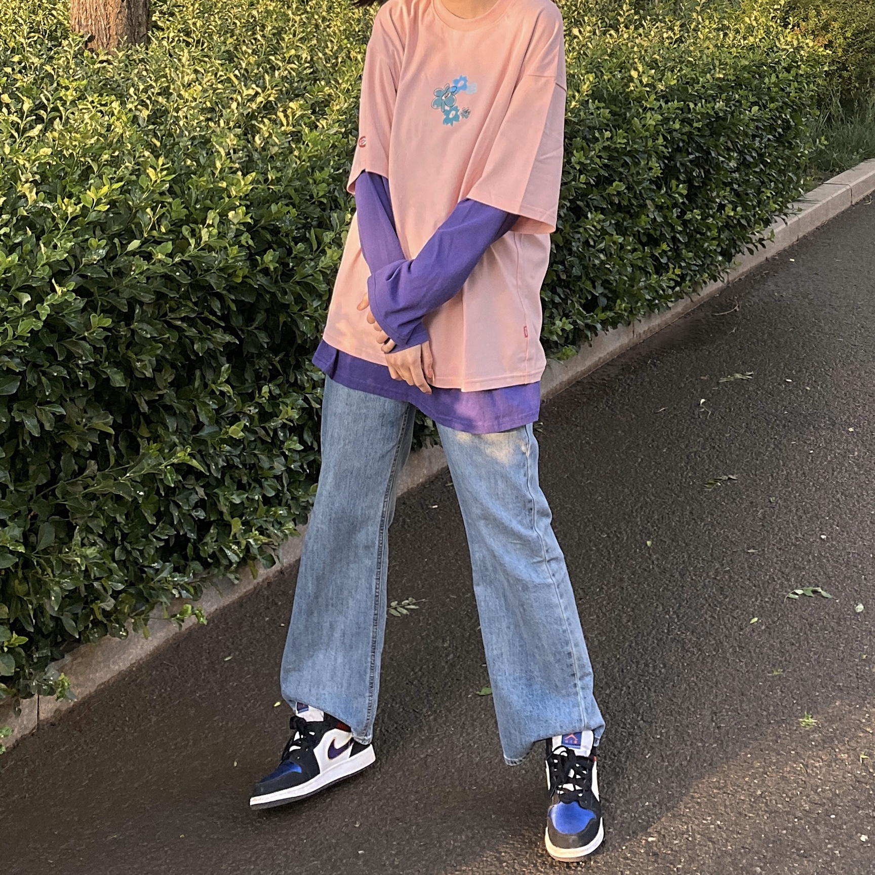 👔:FYP国潮嘻哈潮牌 印花纯棉花卉T恤花朵短袖T 👟:AJ1 湖人红蓝 夏天配一个粉色T再搭一双AJ超有活力哦 长袖跟半袖叠穿很有层次感 扎一个马尾拉长身材比例 快选择一个粉粉的半袖来度过夏天吧~