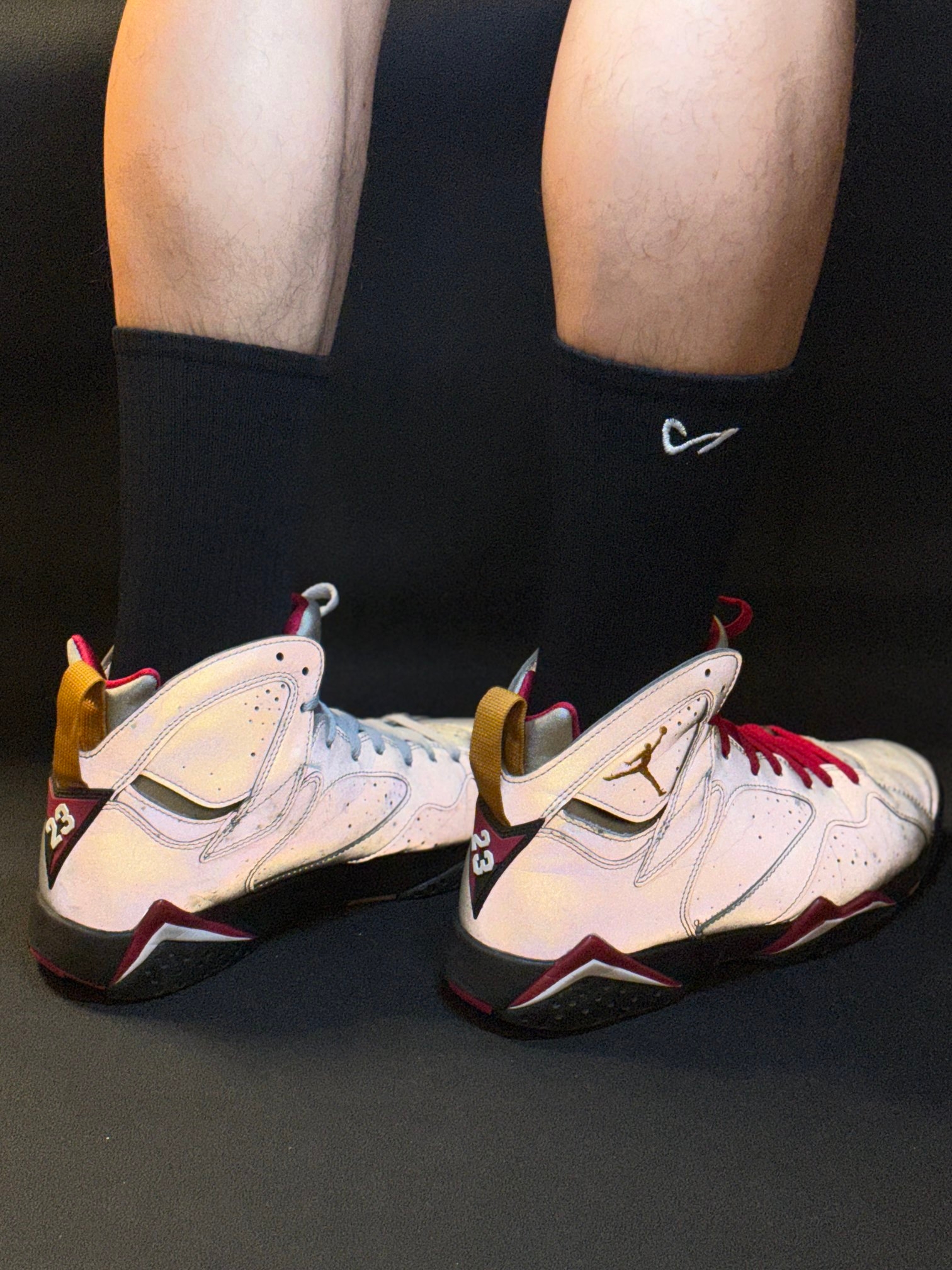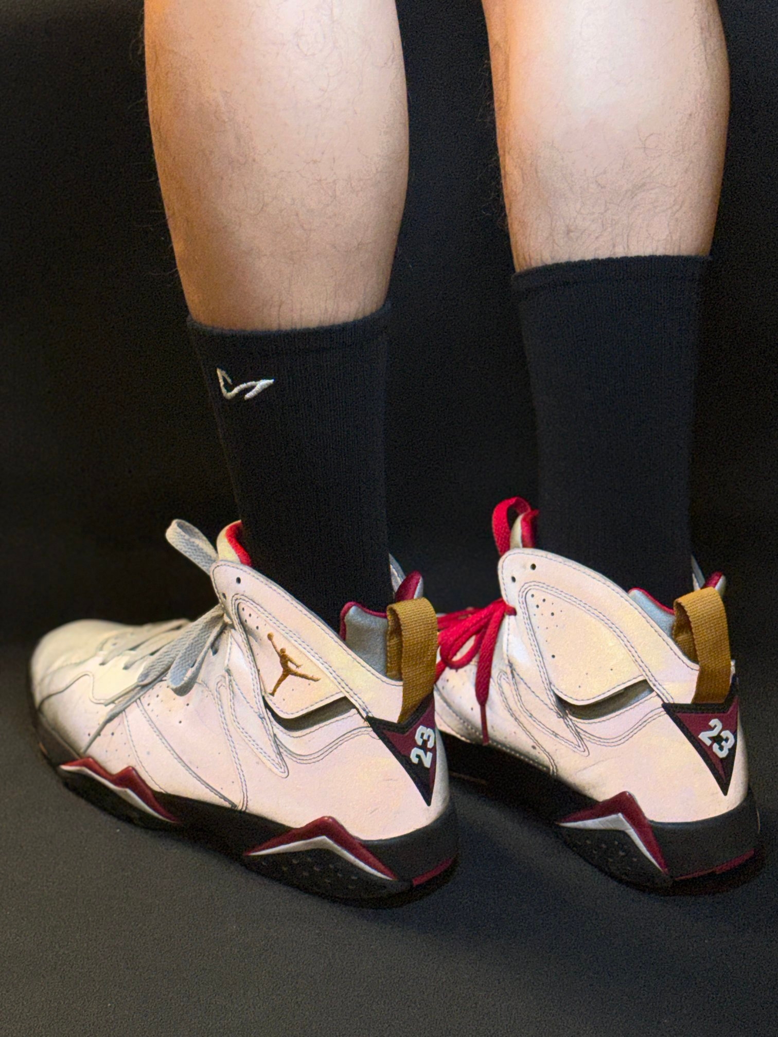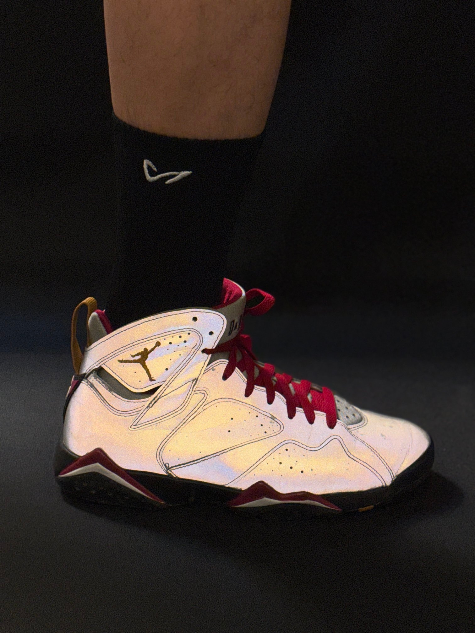 维动翼系列纯色袜搭配AJ7 3M反光鞋,简约黑袜利落百搭,袜身微压包裹贴合不滑跟,和鞋身的镭射反光形成低调呼应。夜晚灯光下鞋面流光溢彩,纯黑袜面更衬出鞋款质感,上脚清爽利落,复古又有细节。