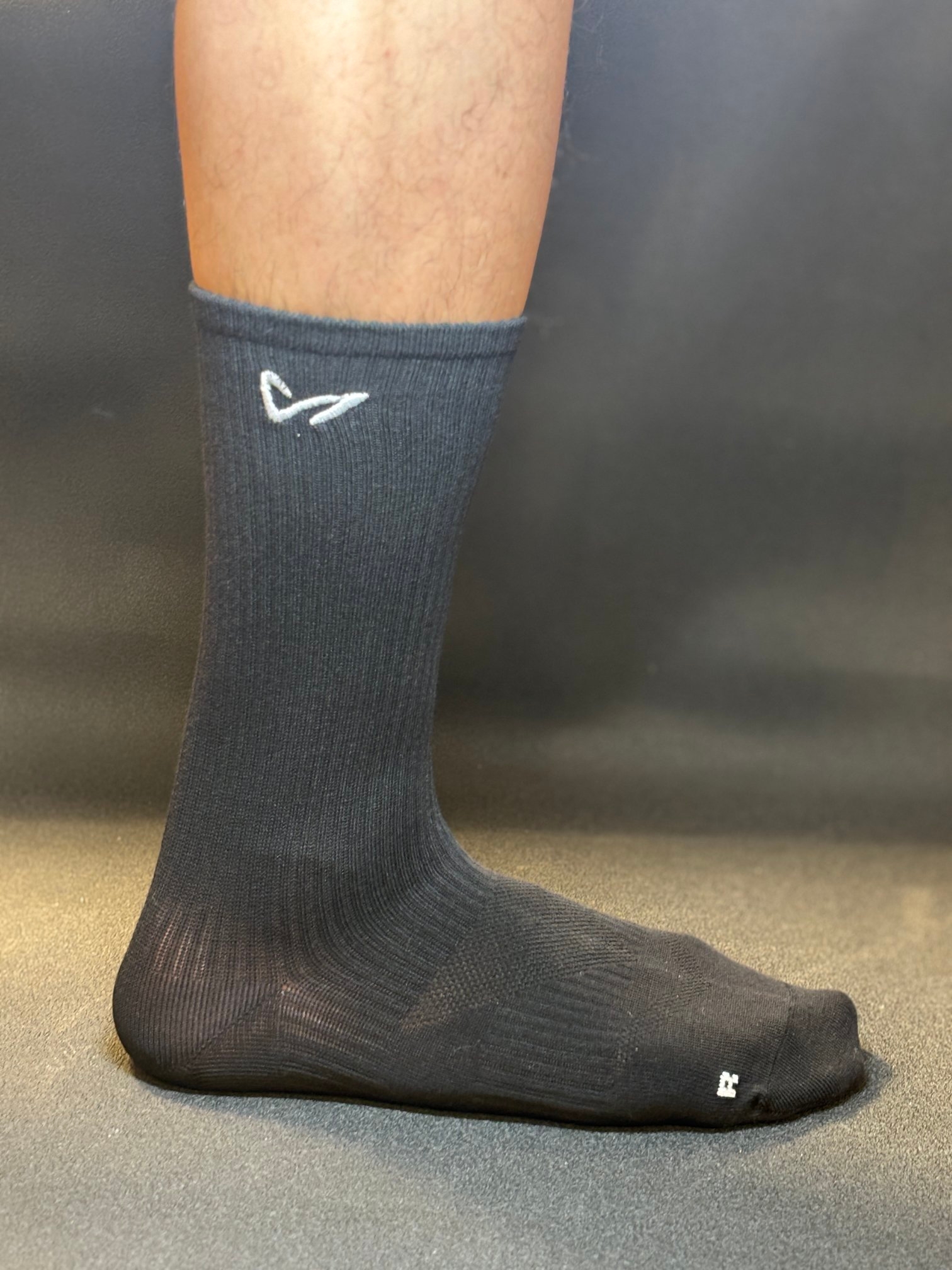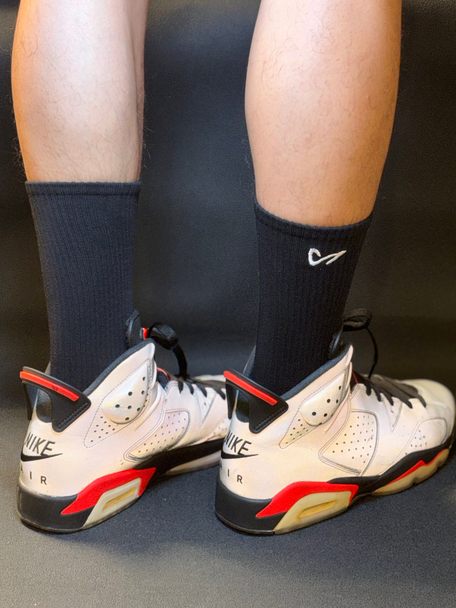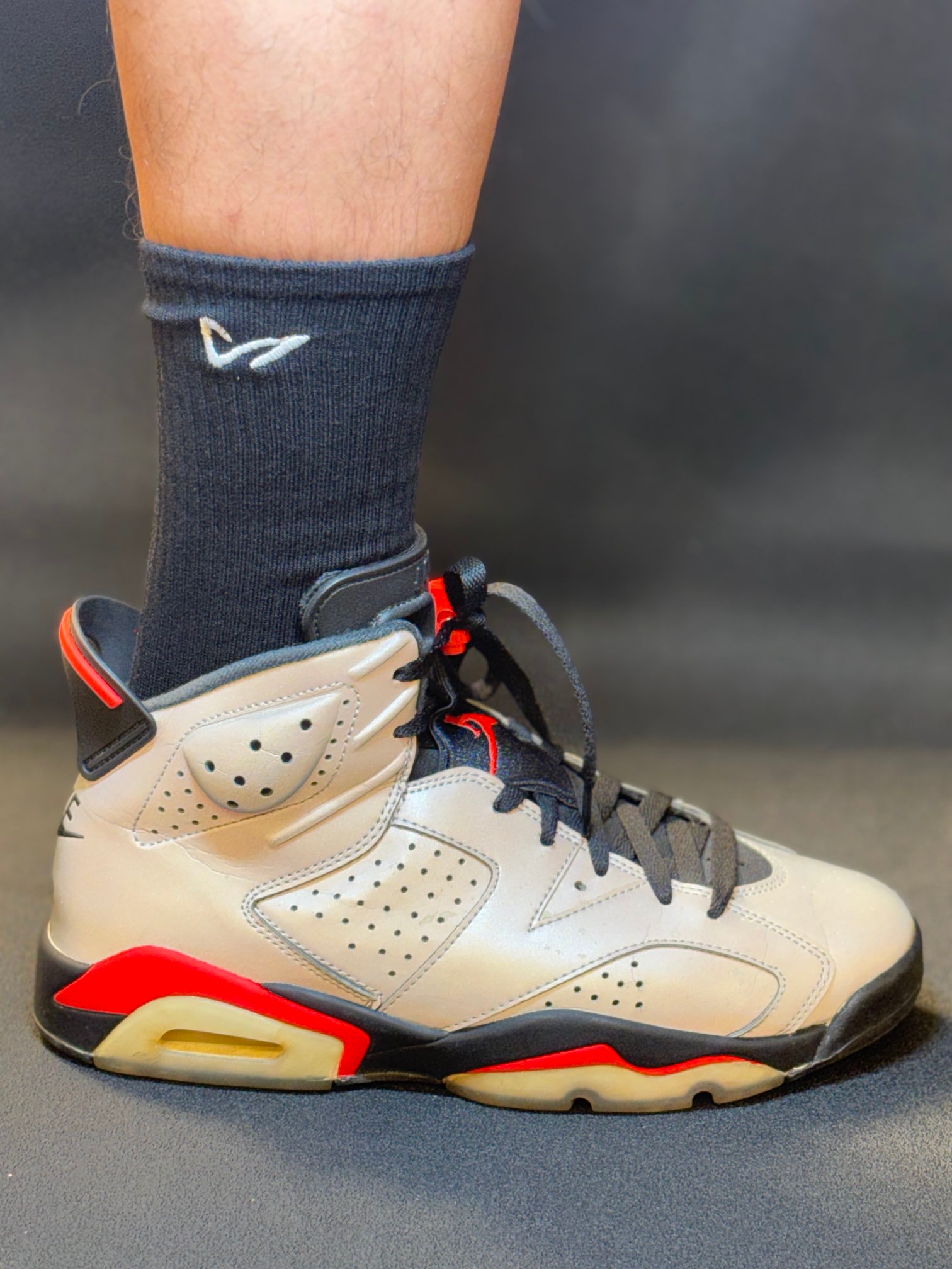 维动翼系列纯色袜搭配AJ7 3M反光鞋,简约黑袜利落百搭,袜身微压包裹贴合不滑跟,和鞋身的镭射反光形成低调呼应。夜晚灯光下鞋面流光溢彩,纯黑袜面更衬出鞋款质感,上脚清爽利落,复古又有细节。