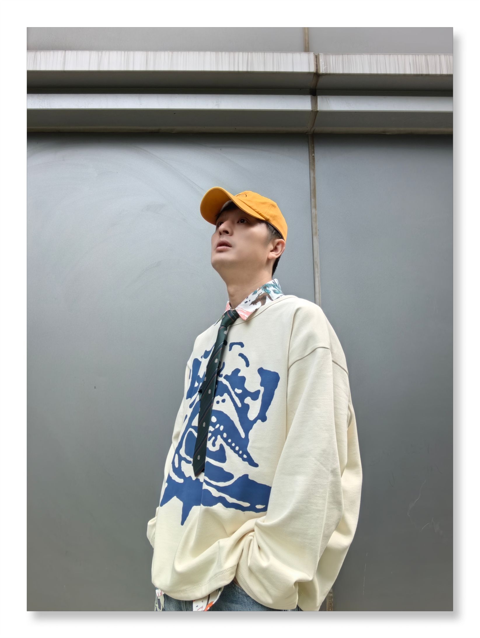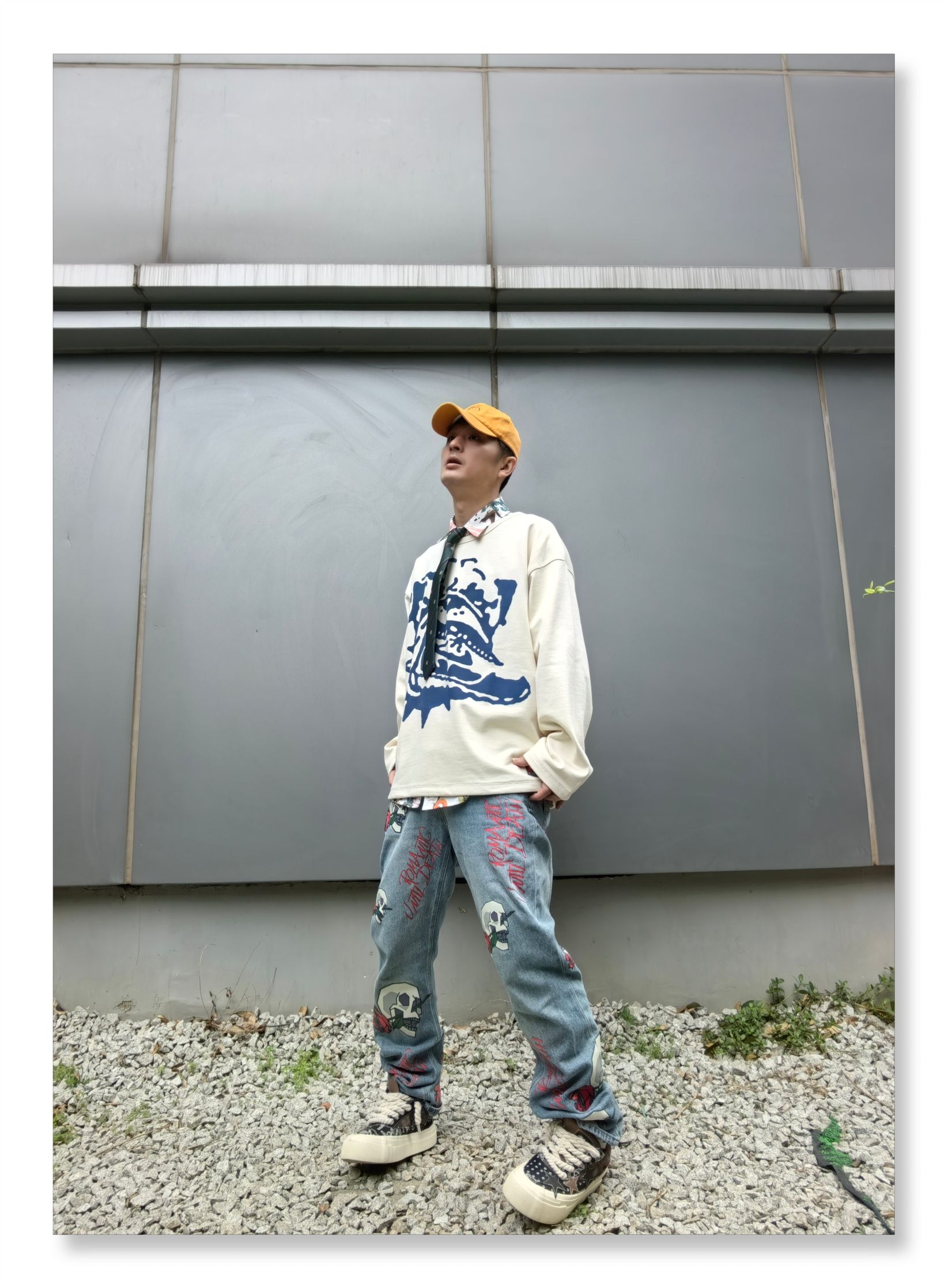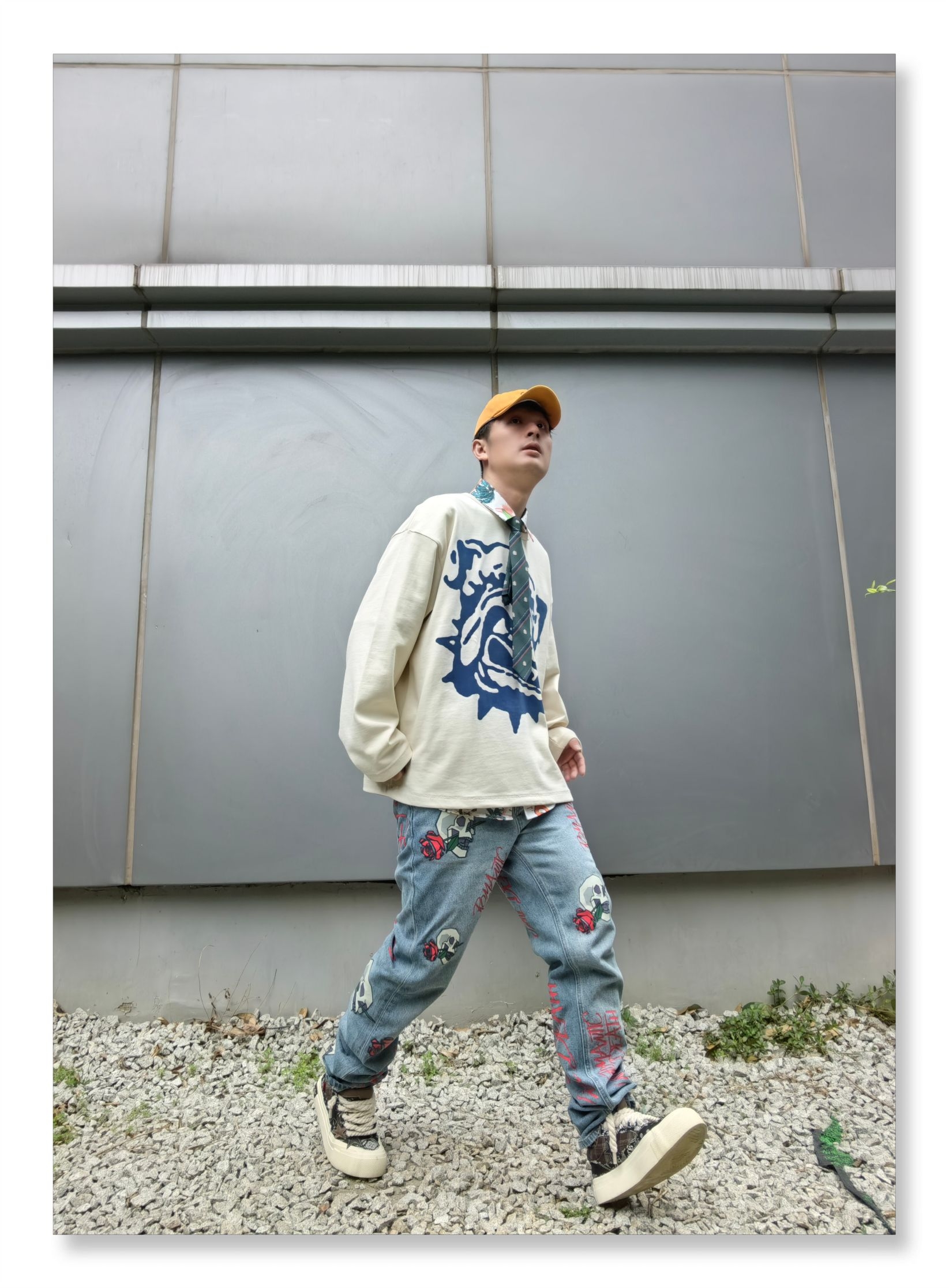 米白斗牛犬印花卫衣叠穿花衬衫,搭配领带打造松弛学院感;S45骷髅涂鸦牛仔裤与厚底星星鞋呼应,街头氛围拉满。亮眼的黄色棒球帽点亮全身,复古撞色搭配,把美式街头的随性与少年气穿进日常,春日出街吸睛又自在。