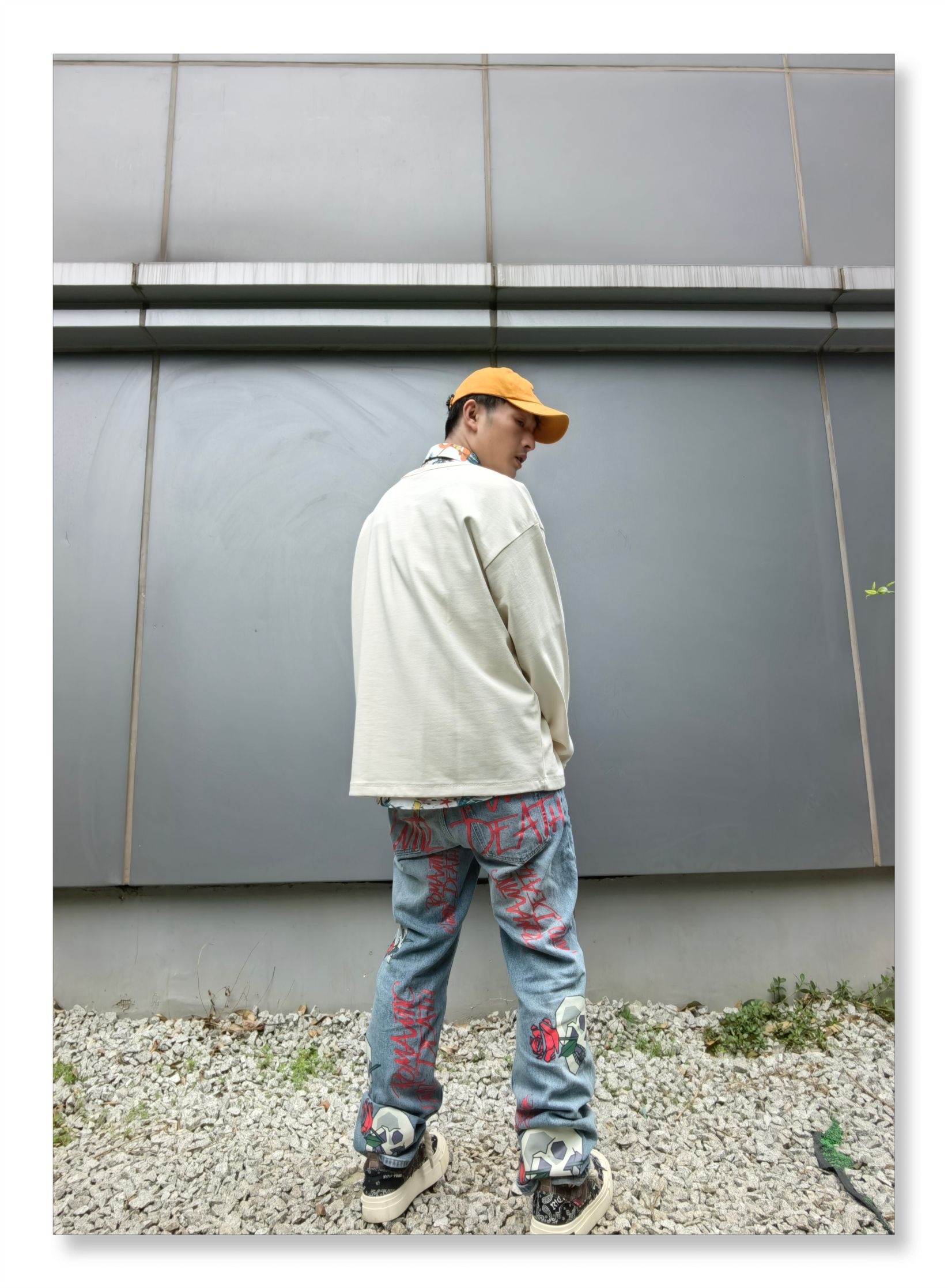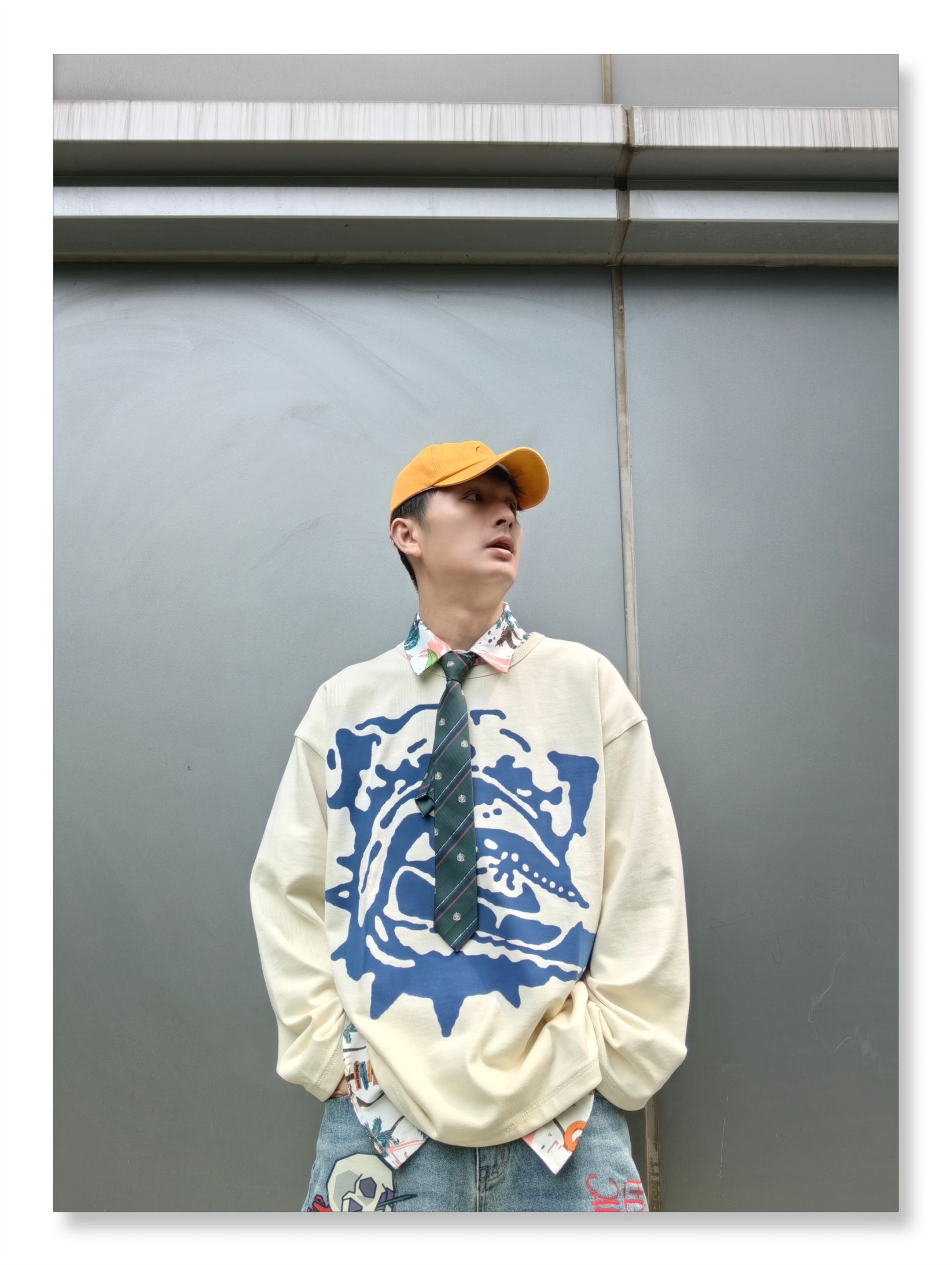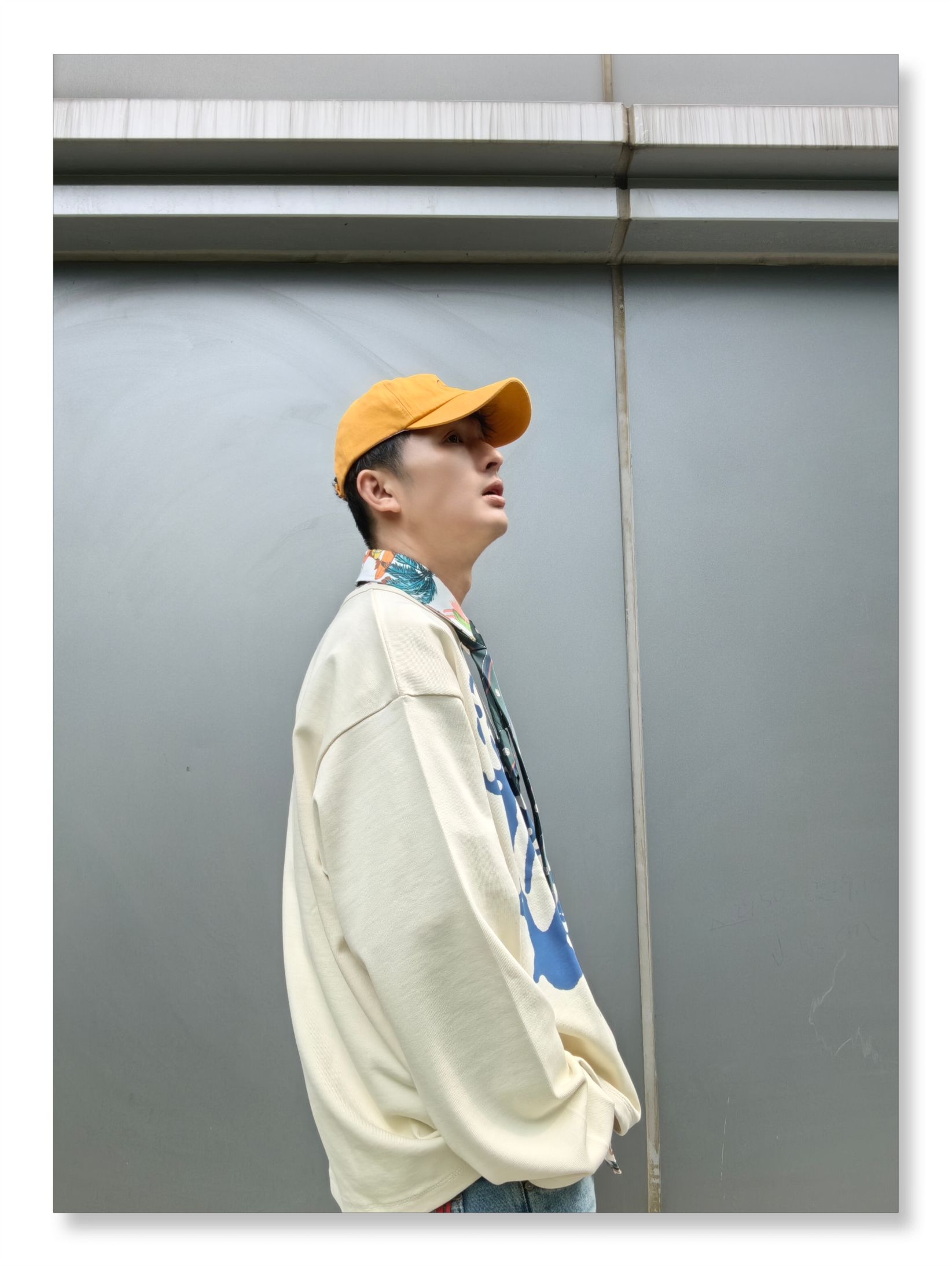米白斗牛犬印花卫衣叠穿花衬衫,搭配领带打造松弛学院感;S45骷髅涂鸦牛仔裤与厚底星星鞋呼应,街头氛围拉满。亮眼的黄色棒球帽点亮全身,复古撞色搭配,把美式街头的随性与少年气穿进日常,春日出街吸睛又自在。