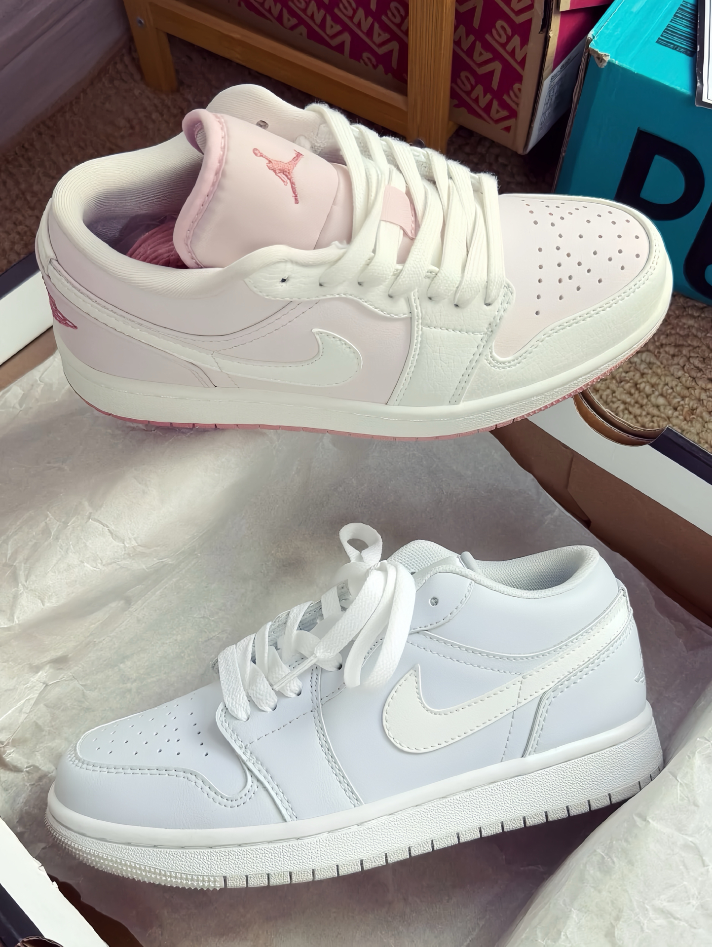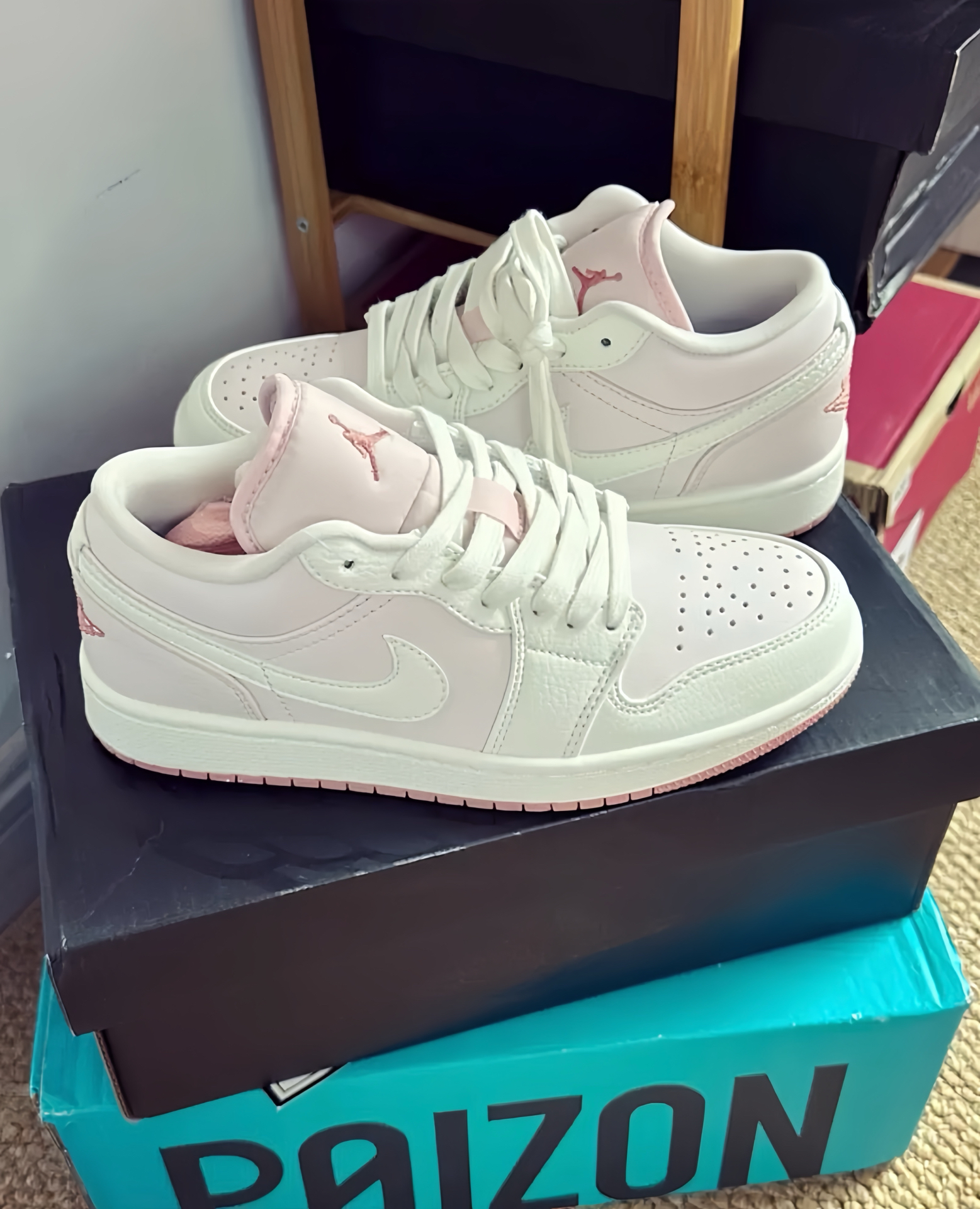 等了好久啦 这双浅粉AJ1 Low拿到手第一感觉还行,皮料是那种软乎乎的头层皮,不是硬邦邦那种,指腹按下去能感觉到些许回弹。鞋身的颜色我也挺中意,不是那种齁甜的粉色,带点奶呼呼的调调,看着不扎眼。鞋舌上的飞人标做成了玫瑰金色,这点小细节瞅着挺有质感,没那种廉价感 谁会拒绝粉色鞋