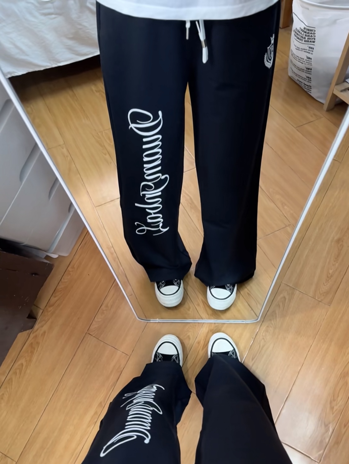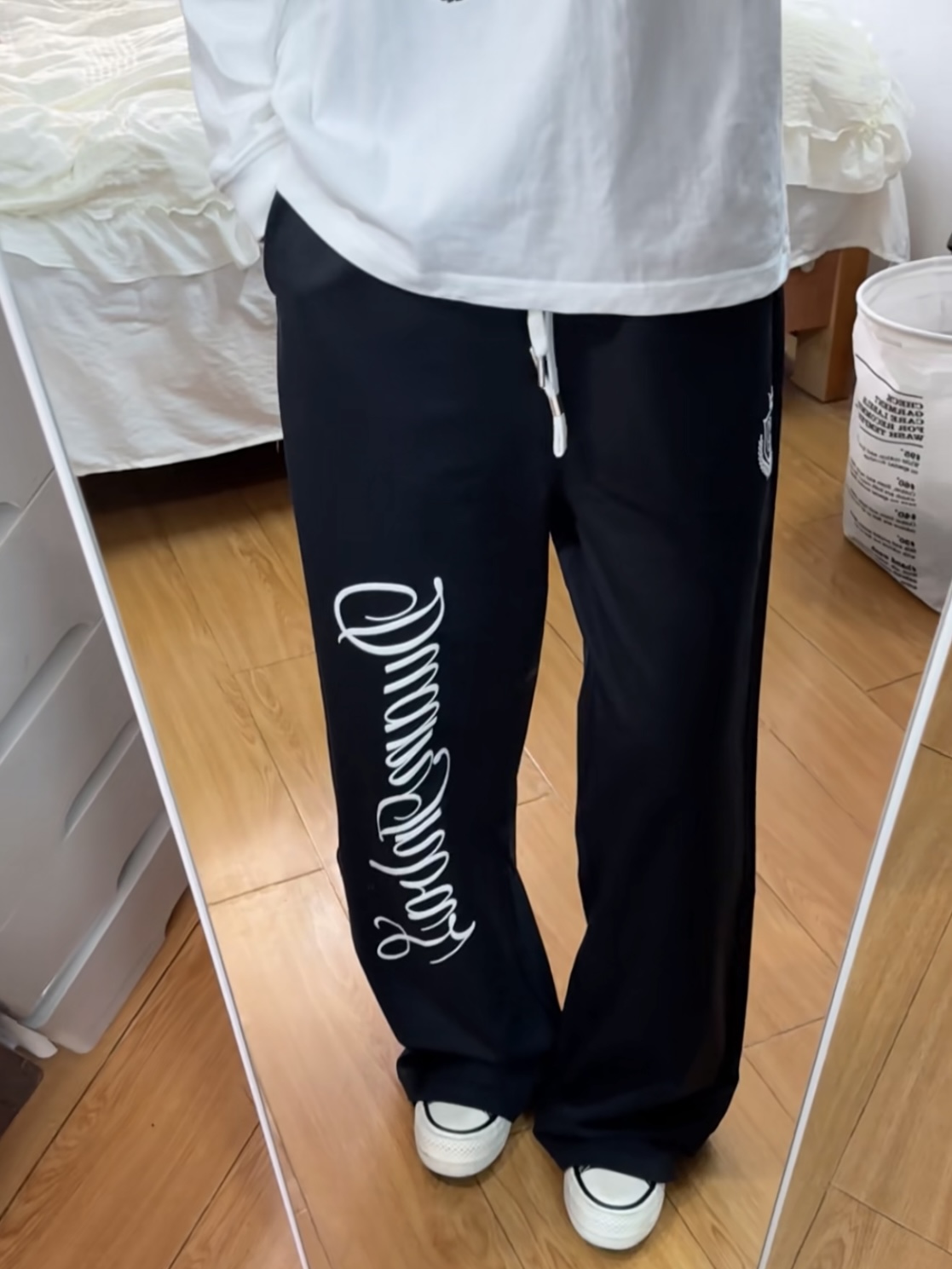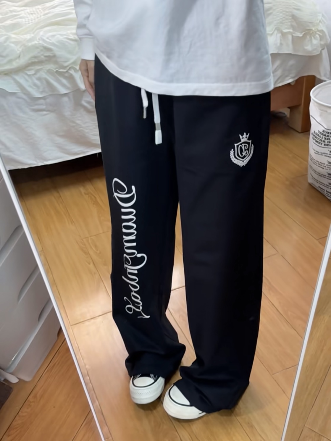 谁懂啊家人们!这条美式卫裤直接焊在我身上了! 垂坠感真的绝了,完全不贴腿,梨形、腿粗、腿不直的姐妹闭眼冲! 侧边的花体字母+皇冠刺绣设计,复古学院风直接拉满, 搭配简单的白T+帆布鞋,慵懒又有高街感, 日常上学、逛街穿都超合适,黑白色系怎么搭都不会出错! 宽松的裤型还特别藏肉,显瘦效果直接拉满, 穿上就是那种随性又带点酷感的美式校园辣妹!