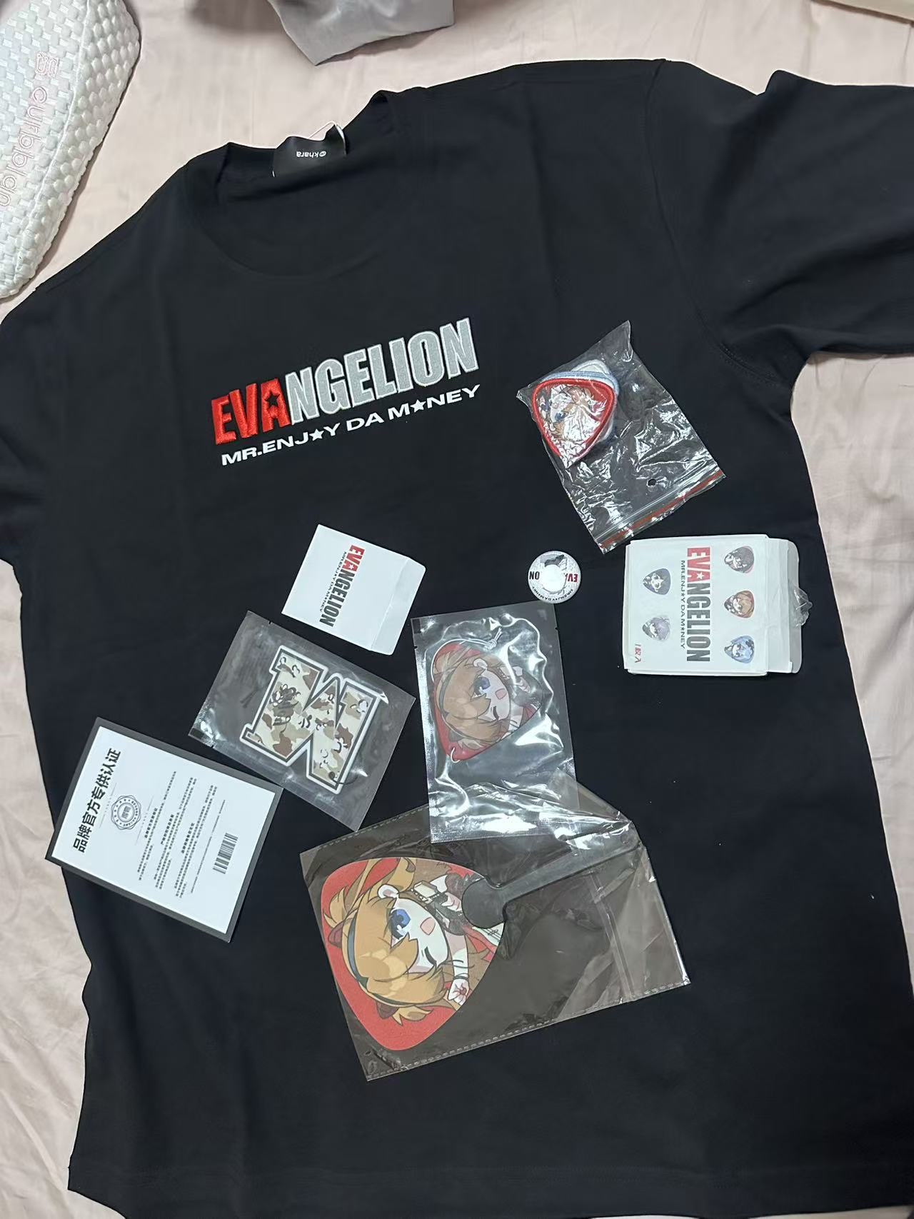 我入手的这件联名短袖,面料厚实挺括,胸前刺绣精致不扎肤😎。收到时附赠了徽章、贴纸等一堆周边,性价比拉满!美中不足的是直筒版型对小个子不太友好,得搭配腰带调整比例🤏,适合二次元潮人日常出街穿~