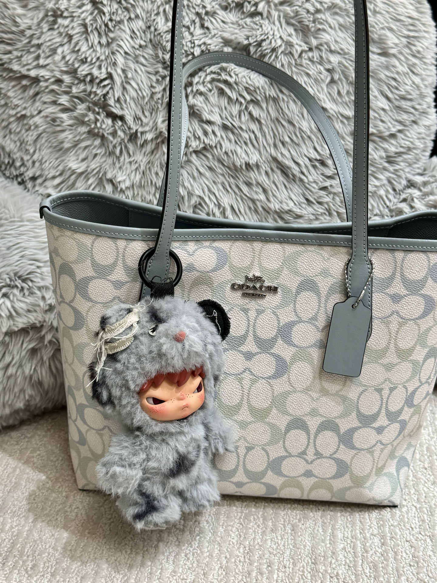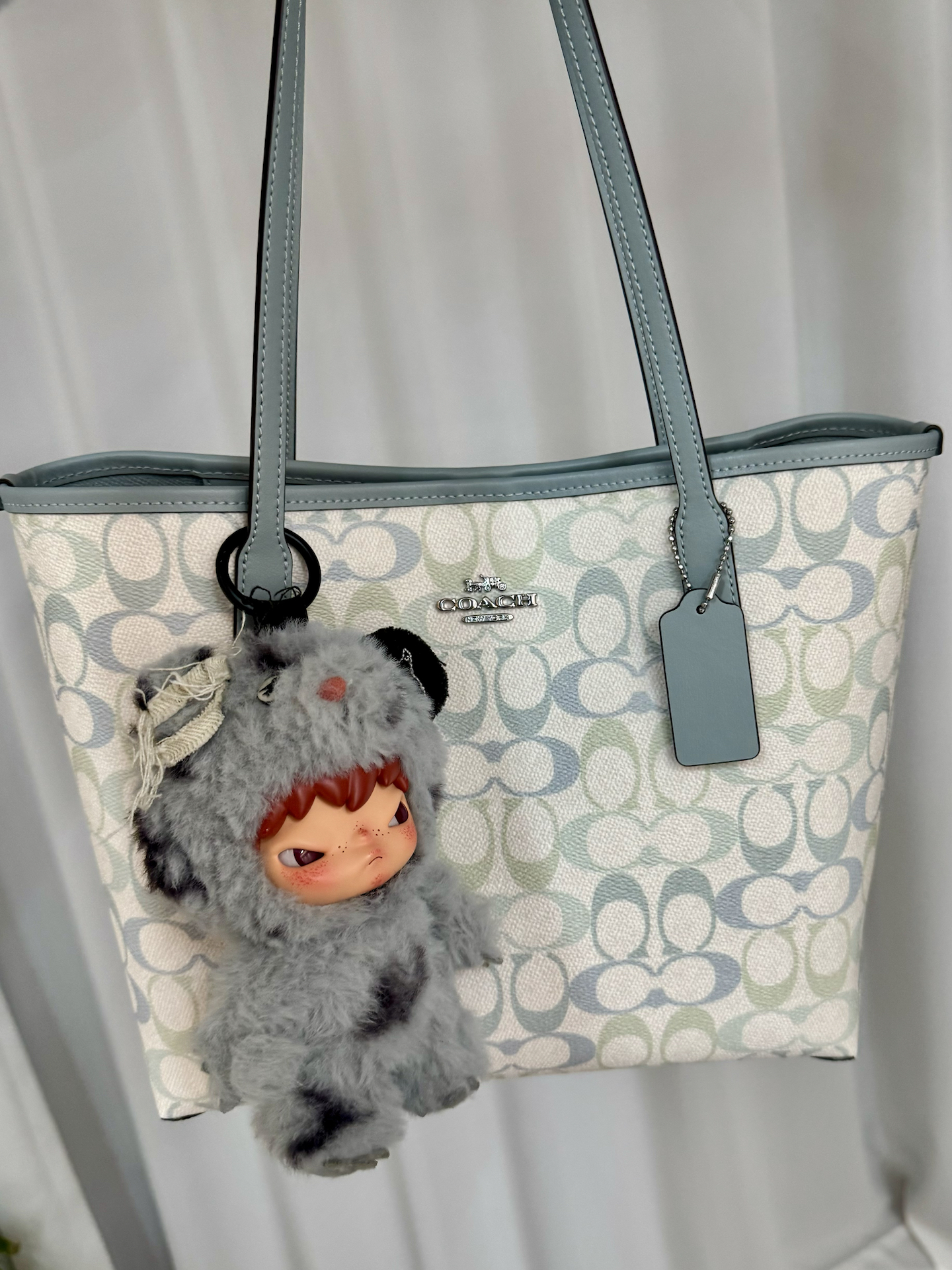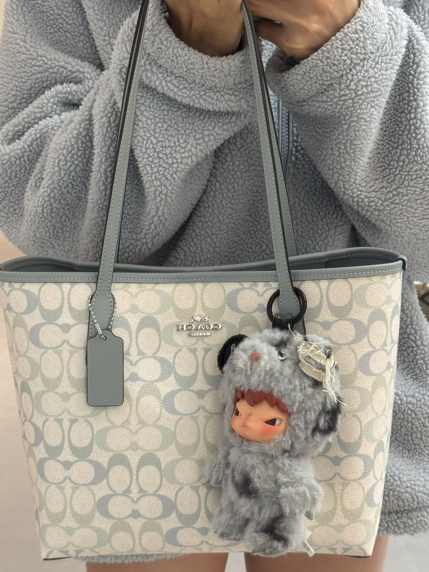 我入手的这款托特包,灰蓝配奶白的色调真的戳中我,温柔又高级,和我的小野挂件意外适配,混搭出不一样的趣味😎。容量够大,装得下通勤的笔记本和补妆品,约会背也不笨重。唯一小缺点是包身没有内袋,找小物件得翻半天,不过整体还是很值!