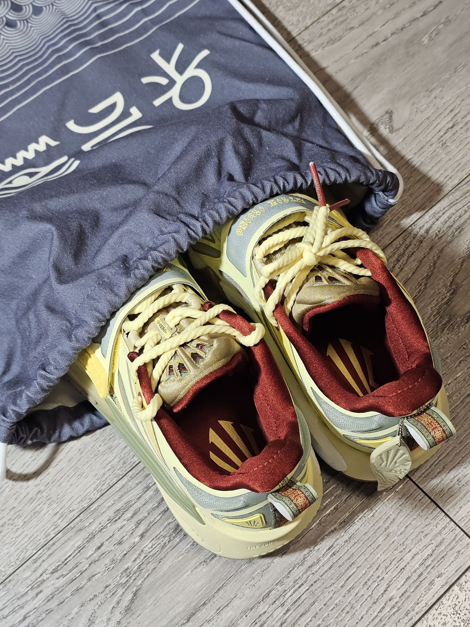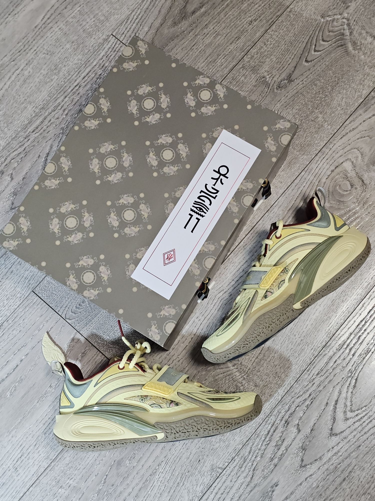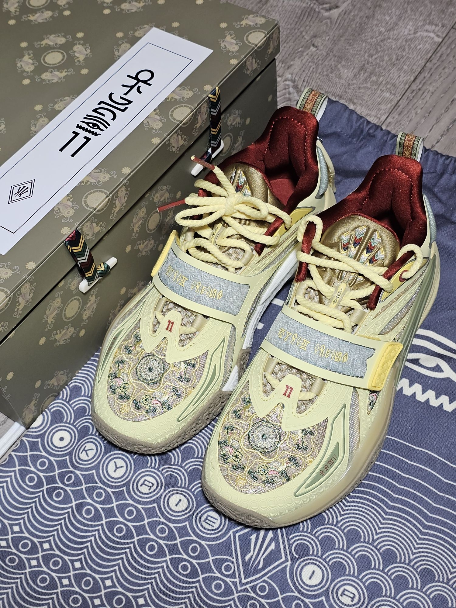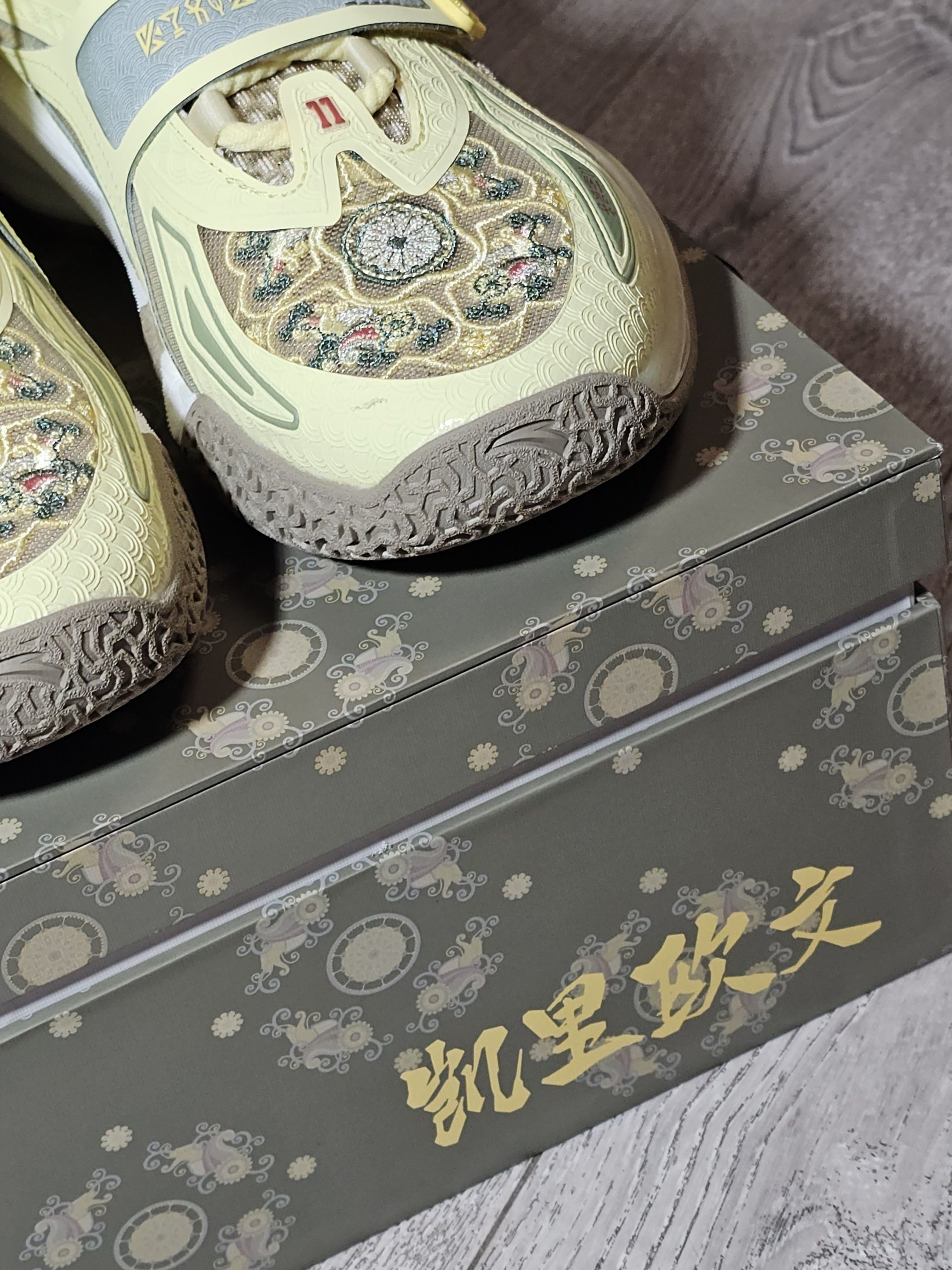 国风质感拉满的欧文一代凯风配色,奶黄底色搭配青灰、酒红点缀,鞋身刺绣花纹精致,搭配特殊鞋盒,整体像一件古色古香的艺术品,对于学生党来说,无论打球还是压马路都很帅气哦! 全掌氮科技中底+中足贯穿碳板+魔术贴绑带,缓震、抗扭和包裹都很顶,对新手和对抗党都很友好!水泥克星外底纹路深硬度高,水泥地实战后磨损轻微,高频外场也能撑很久,很适合学生党在学校球场用!