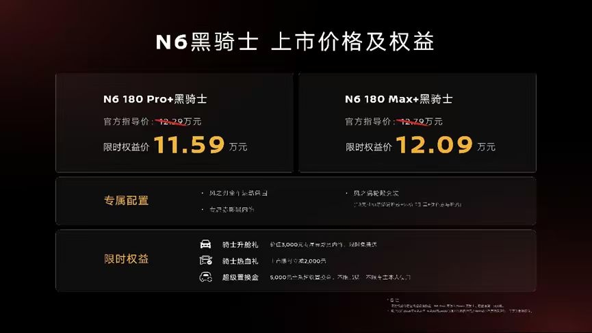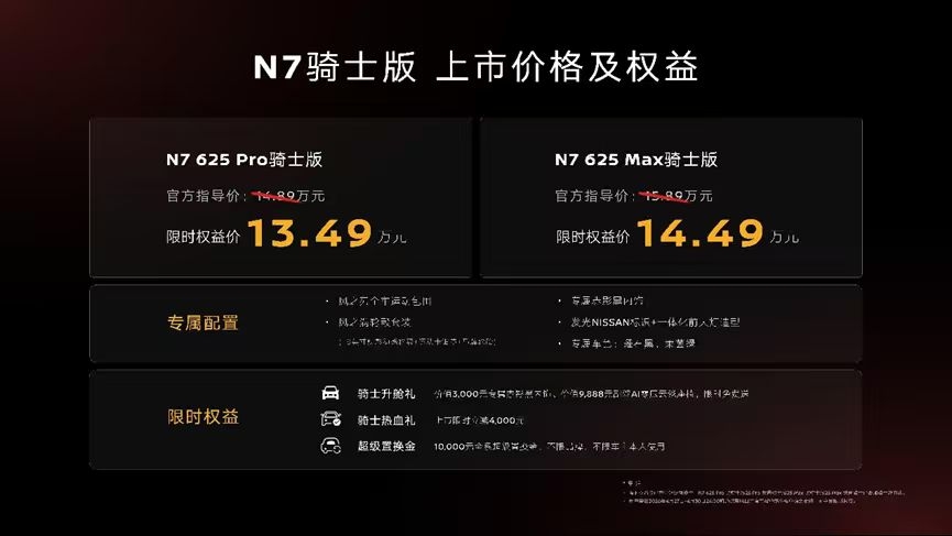 专属配置方面,东风日产N7骑士版套装提供给625Max和625Pro版本选装,套装包含:发光NISSAN标识,夜间点亮气场全开;风之刃全车运动包围,低趴姿态破风前行;风之涡轮毂套装,19英寸疾影动感轮毂搭配抓地力、静音性兼顾的高品质轮胎,操控自如;专属赤影黑内饰,深灰为底、赛道红为魂,落座瞬间格调尽显;专属车色,曜石黑沉稳深邃,莱茵绿质感高级,自带凌厉锋芒。