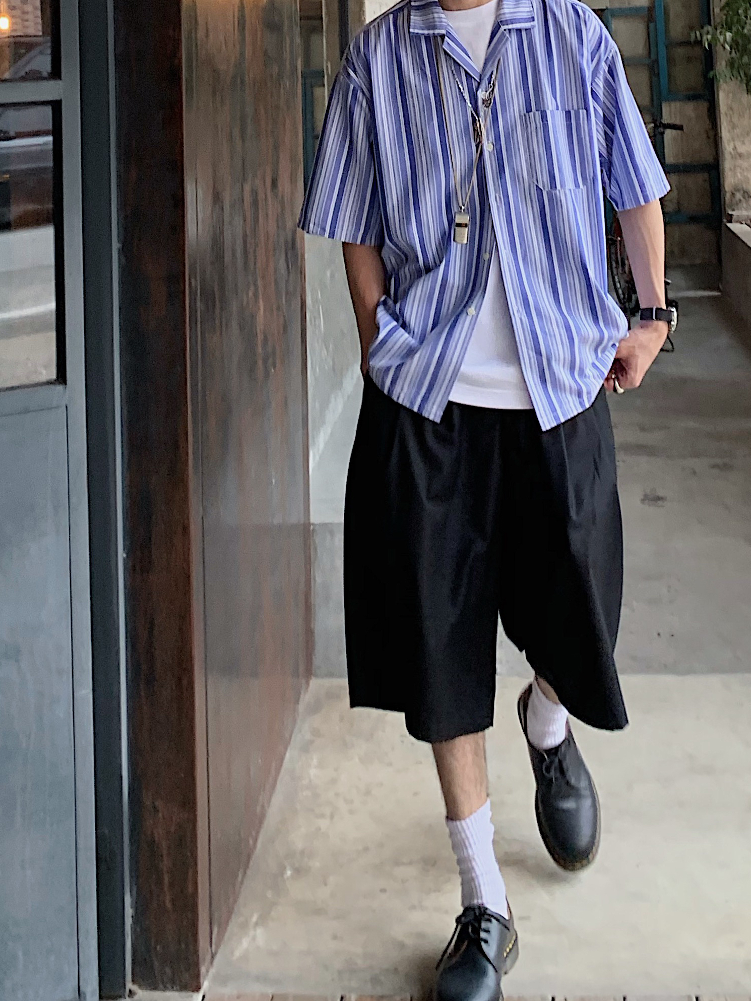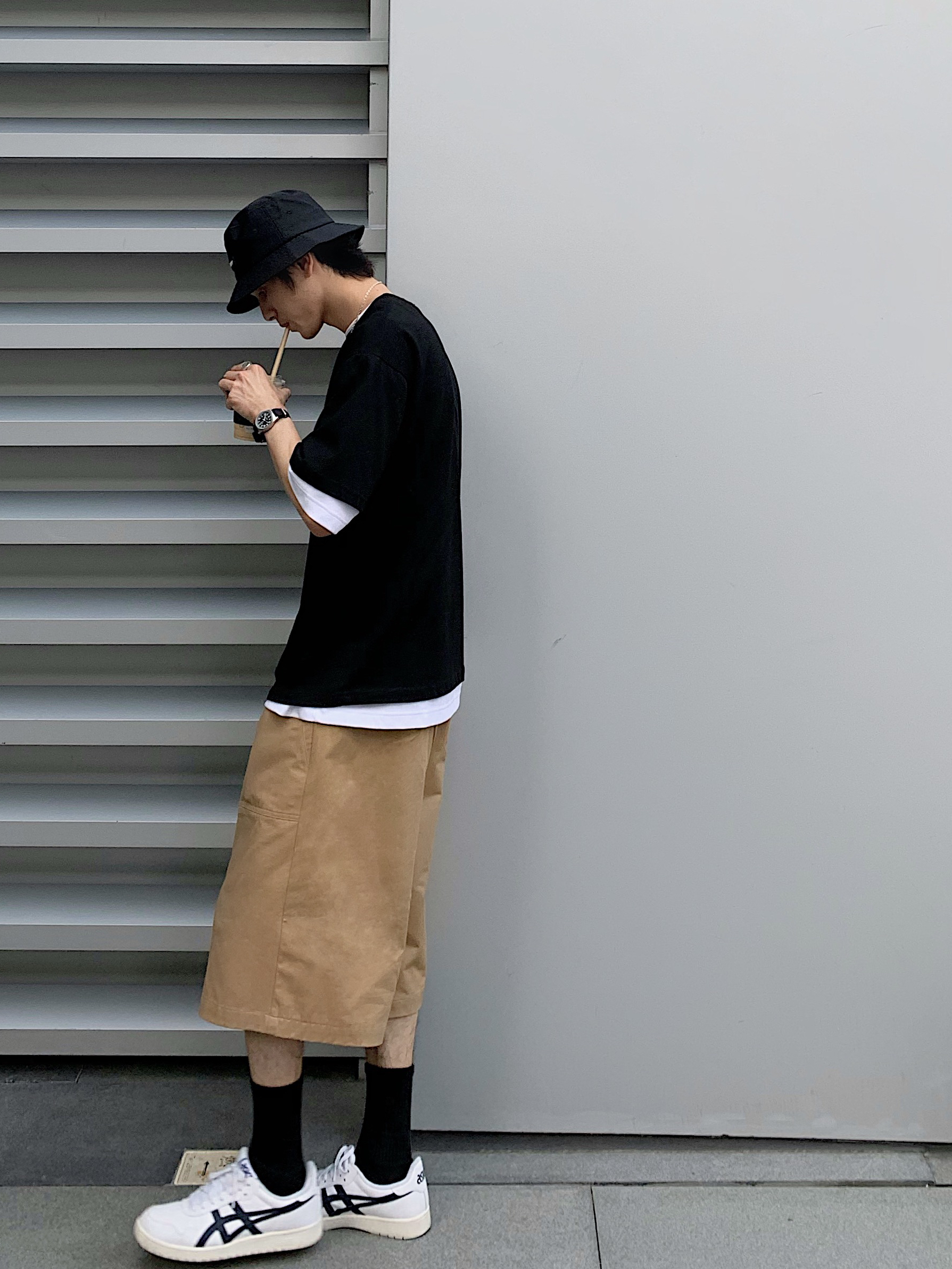👕T恤:BNTUB 黑色手绘图案T恤夏日穿搭特别适合夏天,里面可以再叠穿一件白t增加层次感 - 🩳七分裤:BNTUB 穿腻了五分裤,七分裤也可以尝试搭配一下,个人很喜欢卡其色系的裤子,特别日系复古,宽松版型夏季穿搭特别舒适 - 👟鞋子:Asics tiger 白黑色系板鞋 可搭配多种风格 搭配日系复古风格超级合适 男生夏天穿小白鞋特别减龄 - 搭配思路:主要是黑白色与卡其色系的搭配,黑白百搭色为基...