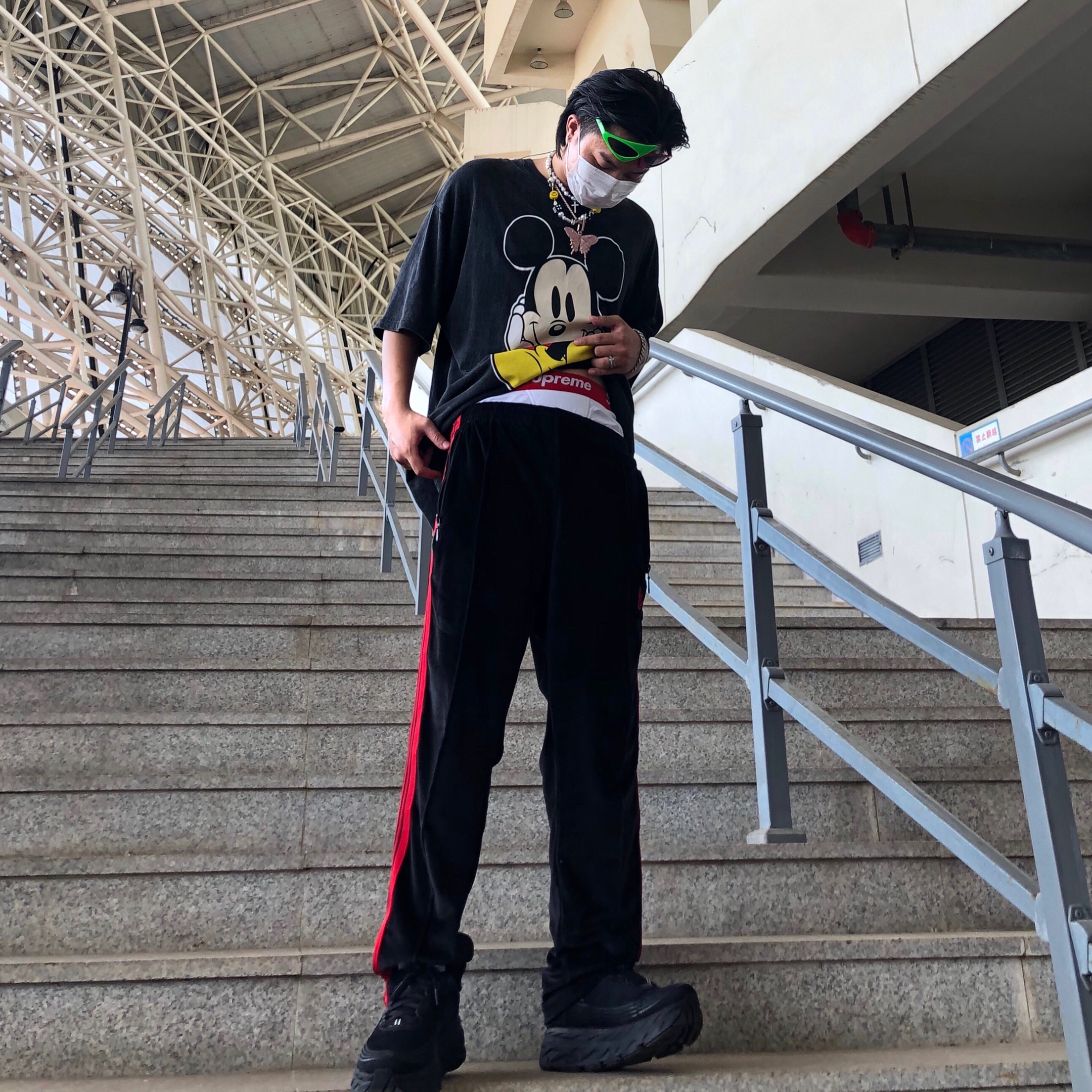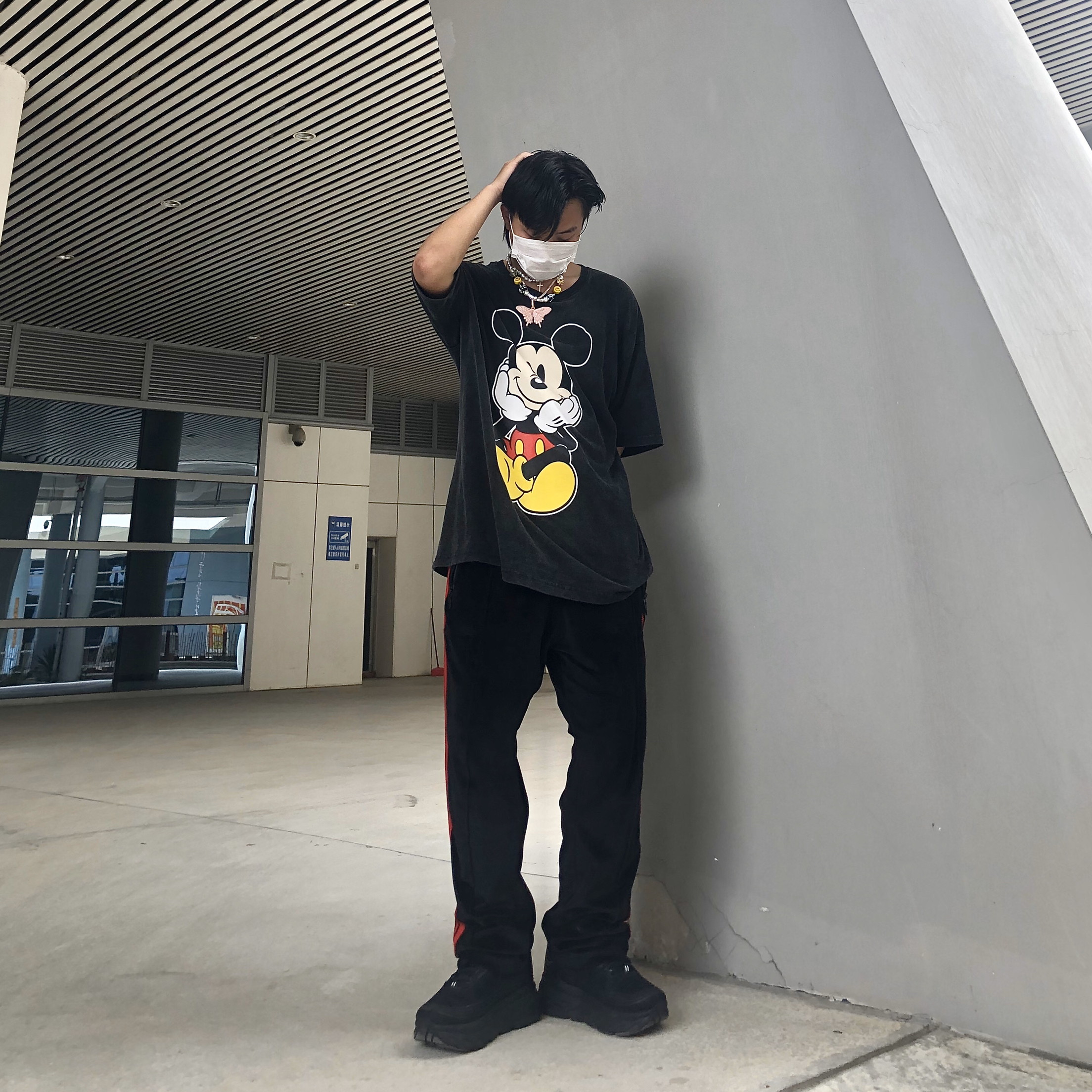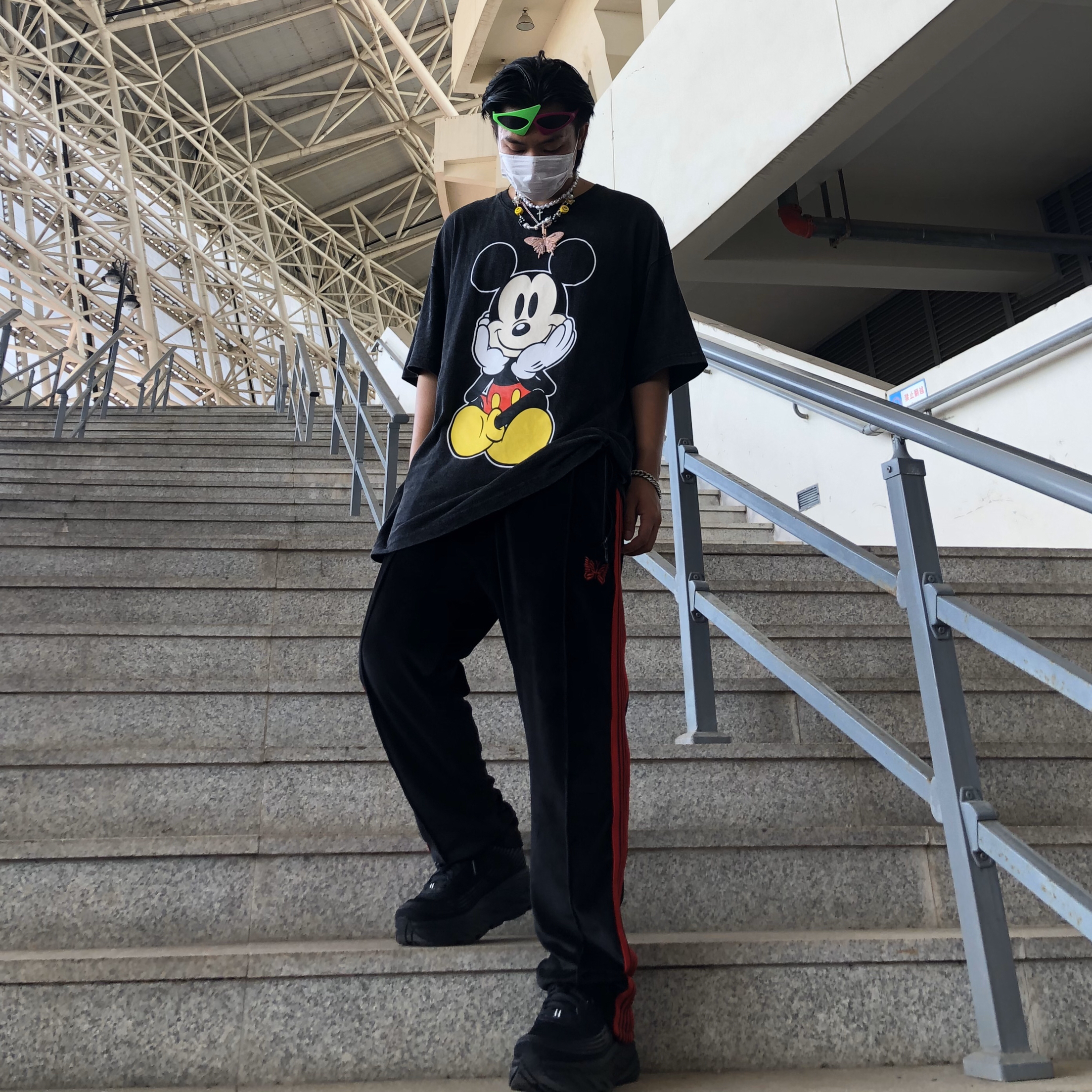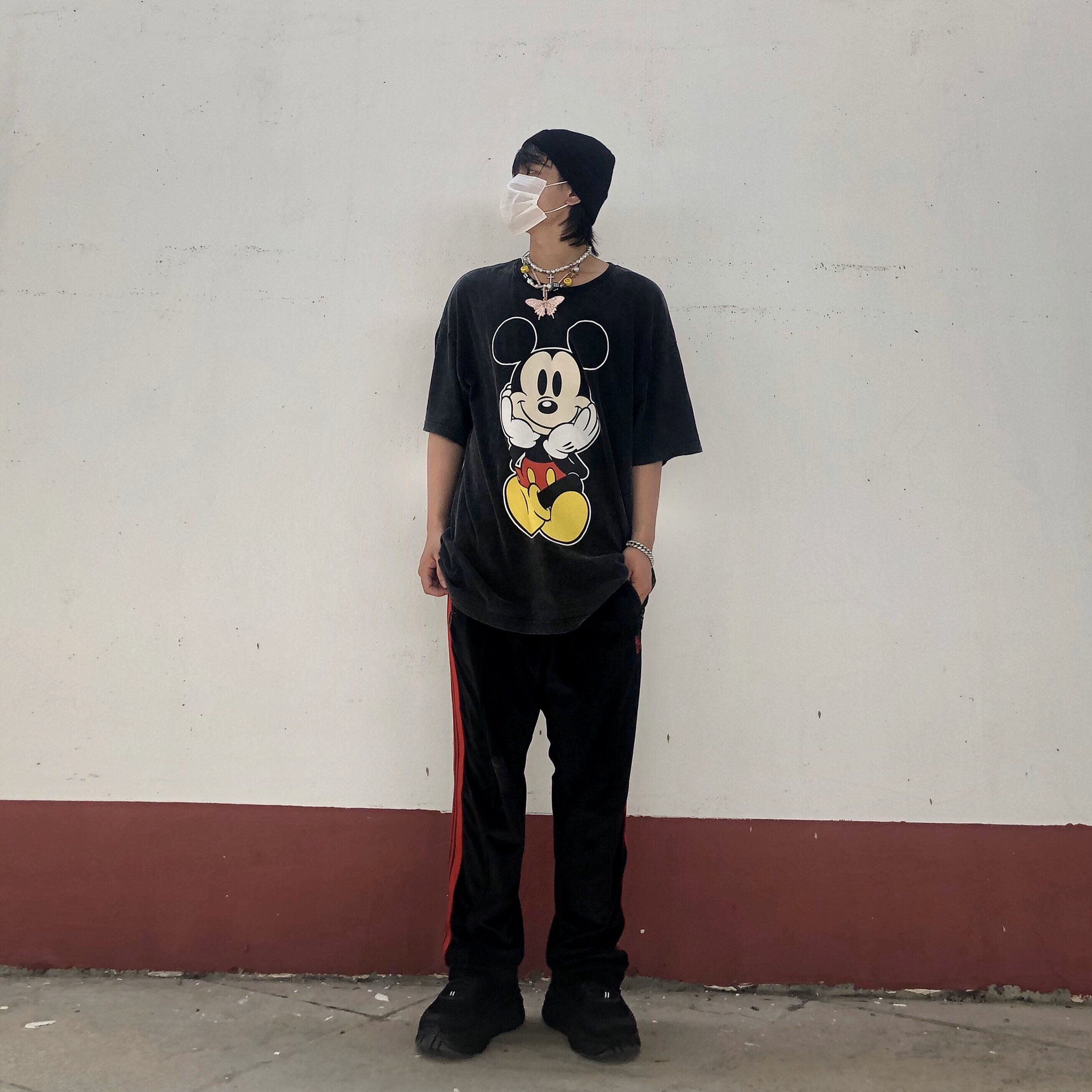 帽子🧢:纯黑针织帽 衣服👔:做旧水洗米奇印花T恤 裤子👖:needles 鞋子👟:hoka 今日搭配整体黑色系为主色调,搭配上项链配饰更能呼应出很多小细节,T恤印花米老鼠又带有一丝不同的感觉,hoka这双鞋子无论搭配什么 基本上都是百搭的,其实也没有什么搭配心得,随意搭配出自己喜欢的感觉就好。