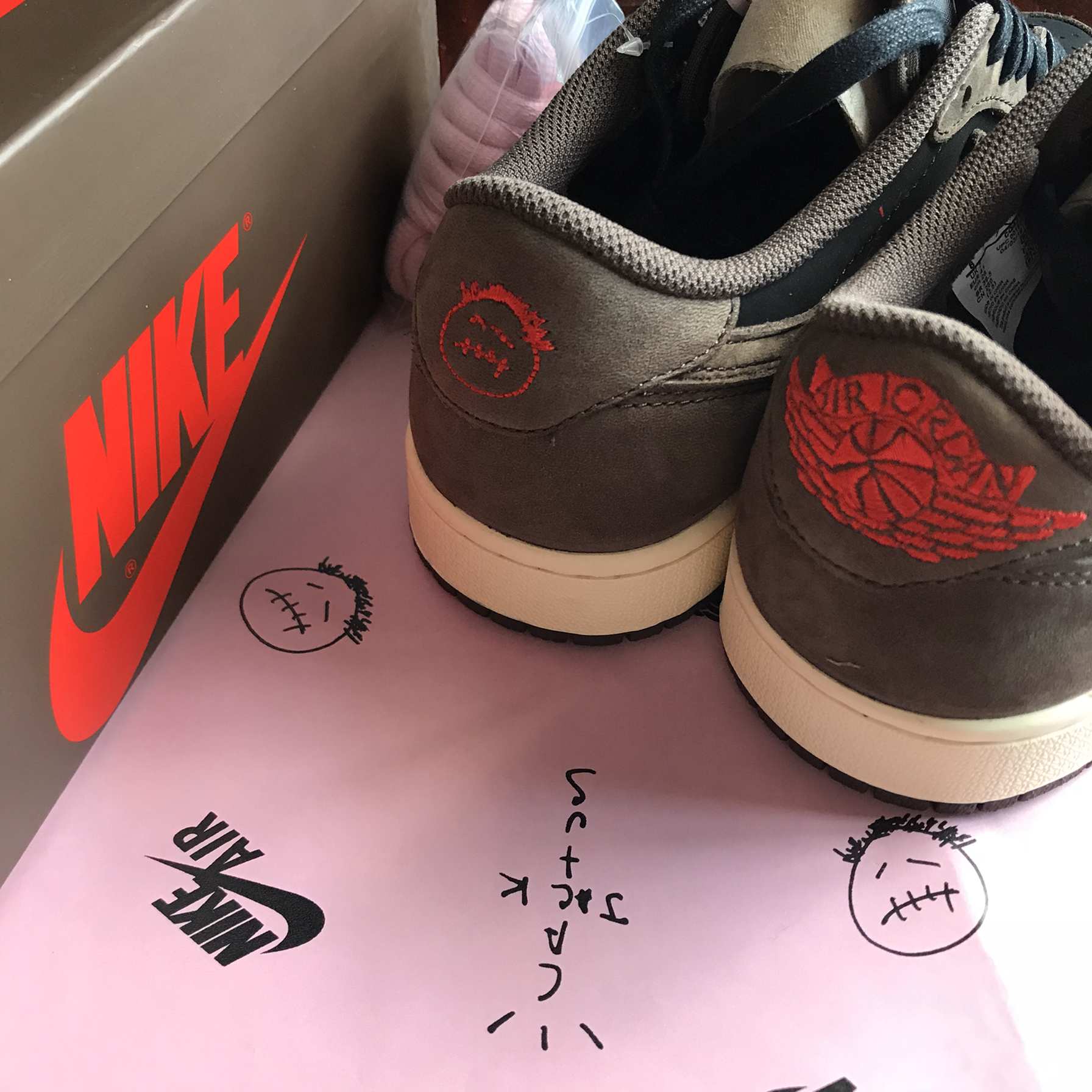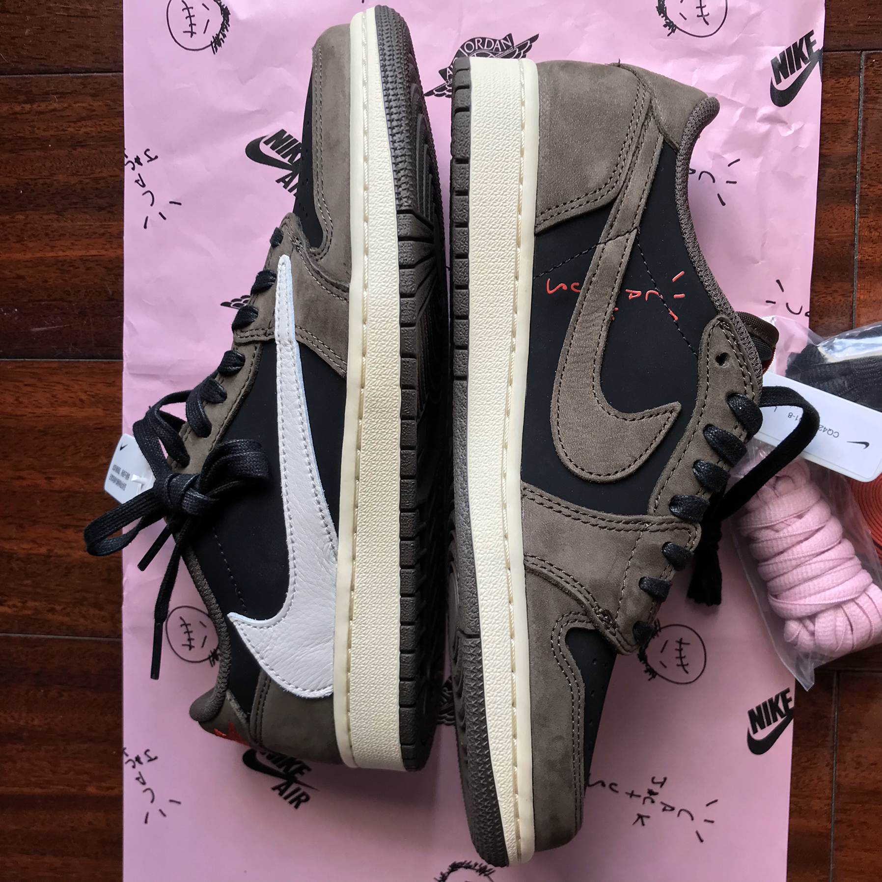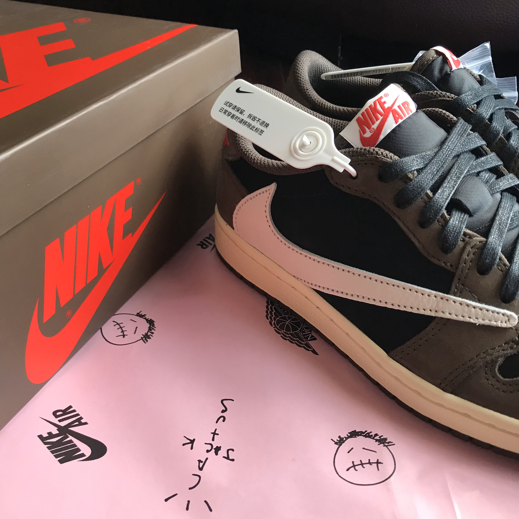 来辣来辣 终于轮到我辣 感谢nike让我入手一双原价倒钩 圆梦啦🤪 🌟开箱第一眼看到的就是印有TS鬼脸logo的衬纸 粉色的很可爱 鞋子附赠有三幅鞋带 一共是4⃣️幅 在低帮鞋里面来说可谓是顶配了👍 粉色鞋带是我最爱的 因为鞋身本身是低调的棕黑色搭配 如果加一幅粉鞋带就更能吸睛 外侧的白色倒钩也是非常的炸 内侧swoosh是棕色🏾串有TRAVIS SCOTT的红色logo 细节十足 后跟左脚则...