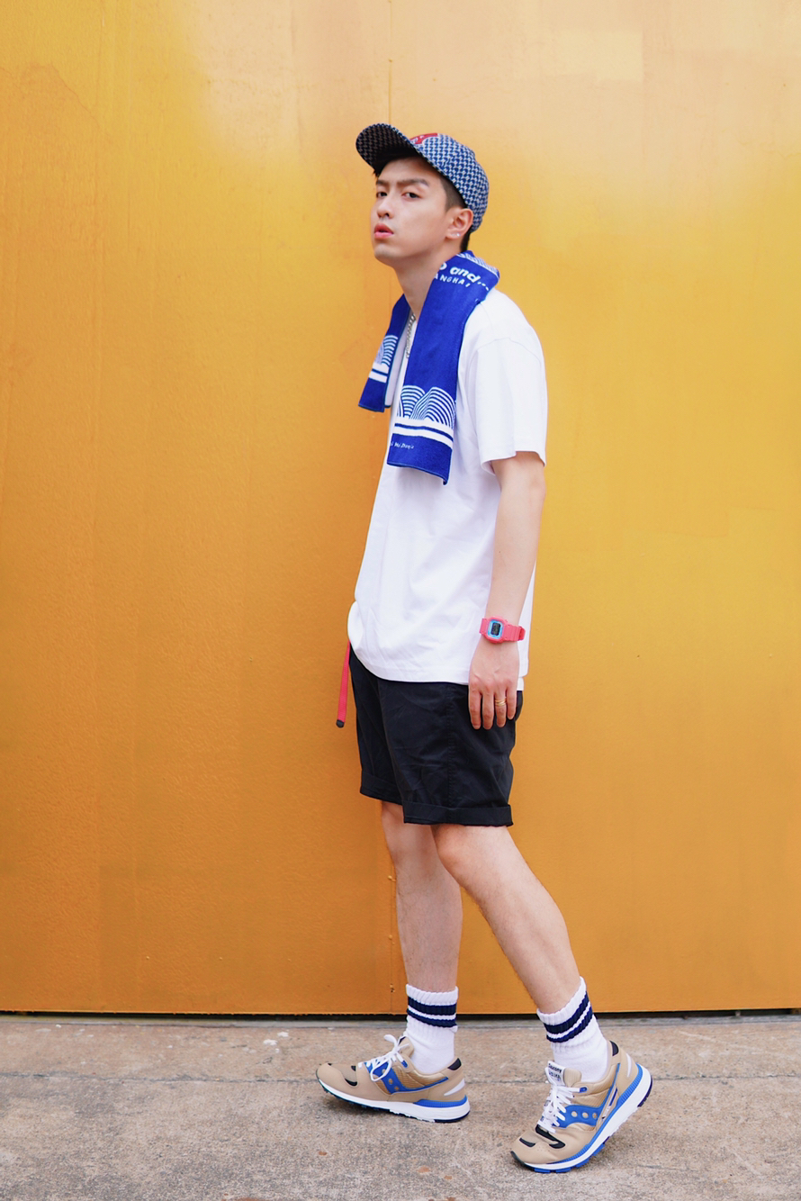 上身:Airwalk的白T,一般我挑选白T会首先看领口的细节和面料,领口不能太宽,面料要厚实些,这样抗变形能力高,视觉质感也更好。 下身:优衣库黑色工装短裤,黑色是常用的搭配Look,白T和黑裤自然是绝配。 鞋子:索康尼的AZURA经典复古鞋款,棕黄蓝的配色,外加从足跟延伸至前掌的稳定条,重现80年代专业跑鞋科技。300块不到的价格真的太值了。 帽子:整体造型精简的同时可以适当运用帽子这个配...