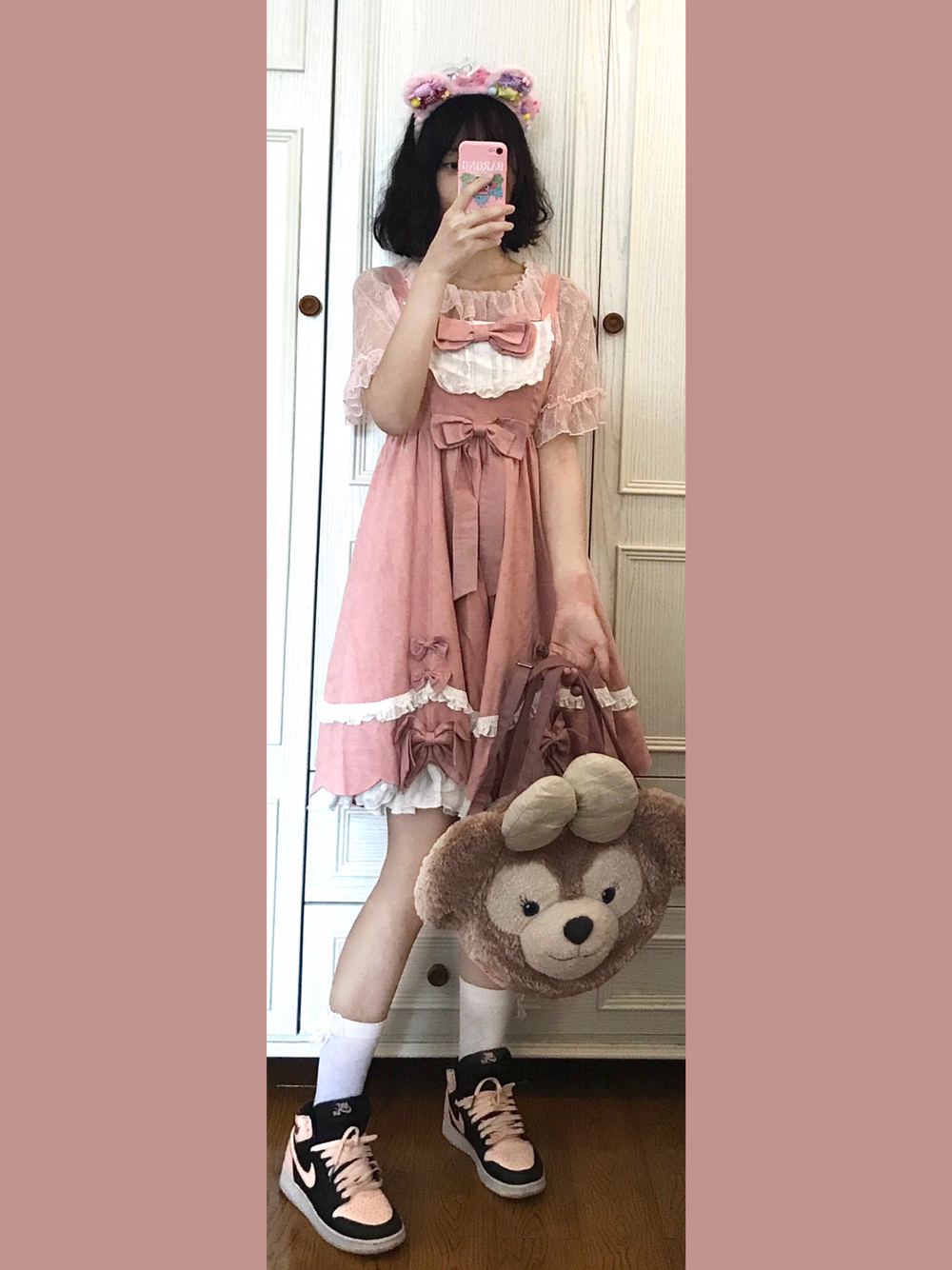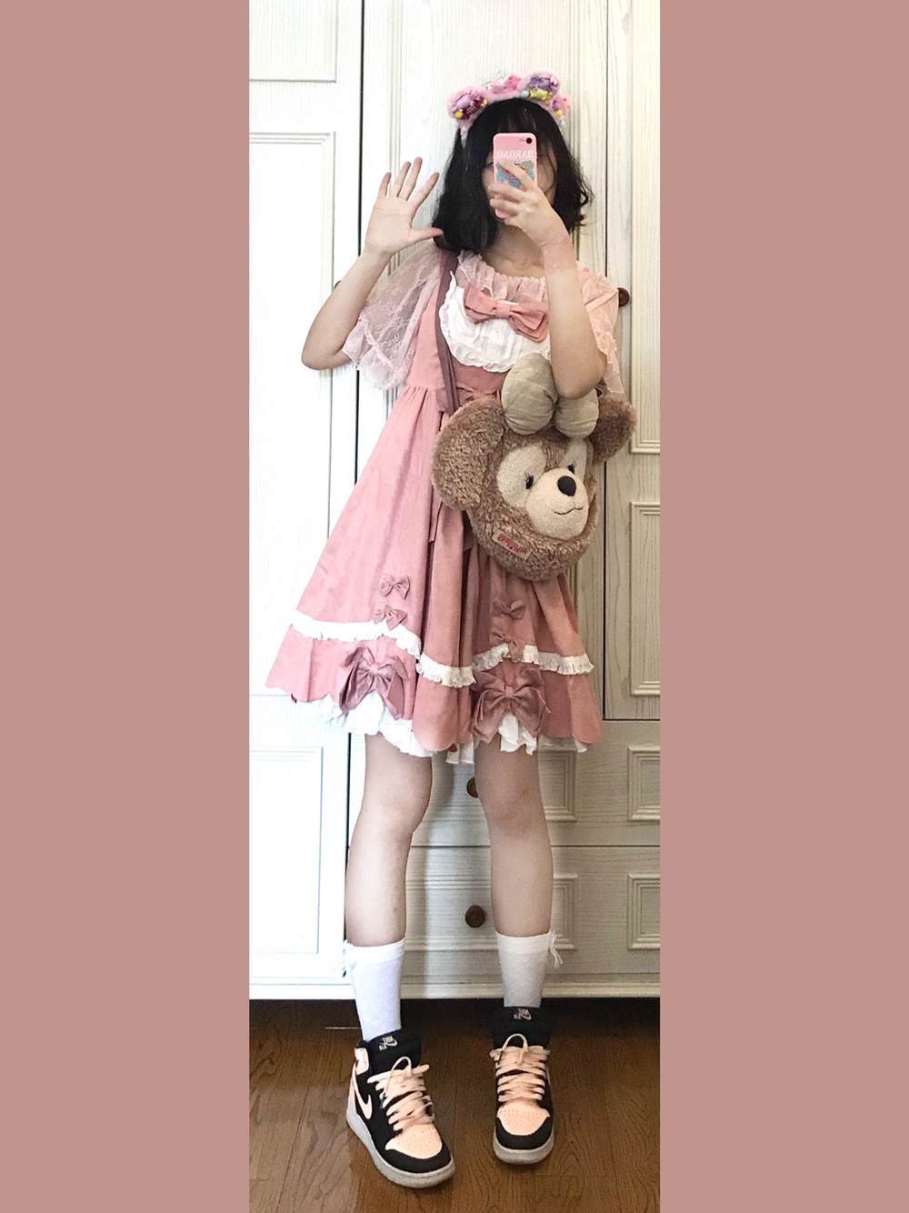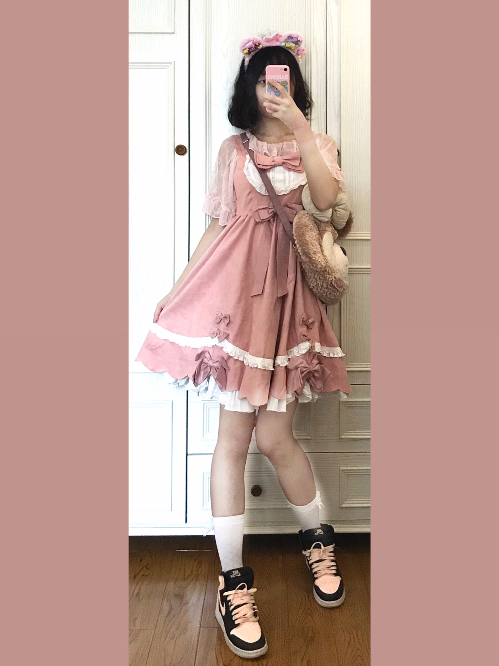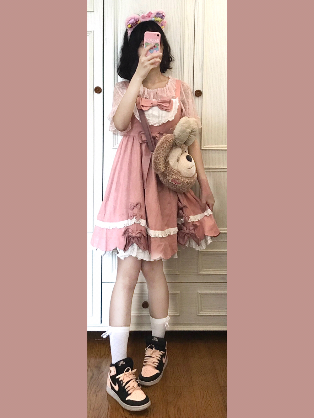 💖穿搭灵感来源🌙 女孩子👧🏻谁不喜欢可可爱爱的lolita呢!大面积的粉色蝴蝶结色块产生颜色联系~ 💖单品配饰如下🌙 👚没烦恼很幸福 内搭蕾丝短袖 不会很扎~穿一天出去玩拍照📸啥的基本木有问题!重点是搭配小裙子真是不会出错系列~太好看啦 👗光学水母福袋jsk 一大堆蝴蝶结在裙子上好满足哦😇👼🏻裙子也很有分量~秋冬换成长袖内搭穿也不怕冷~转个圈太公主👸🏻了吧!! 👟Air Jordan 1 黑粉脚趾...