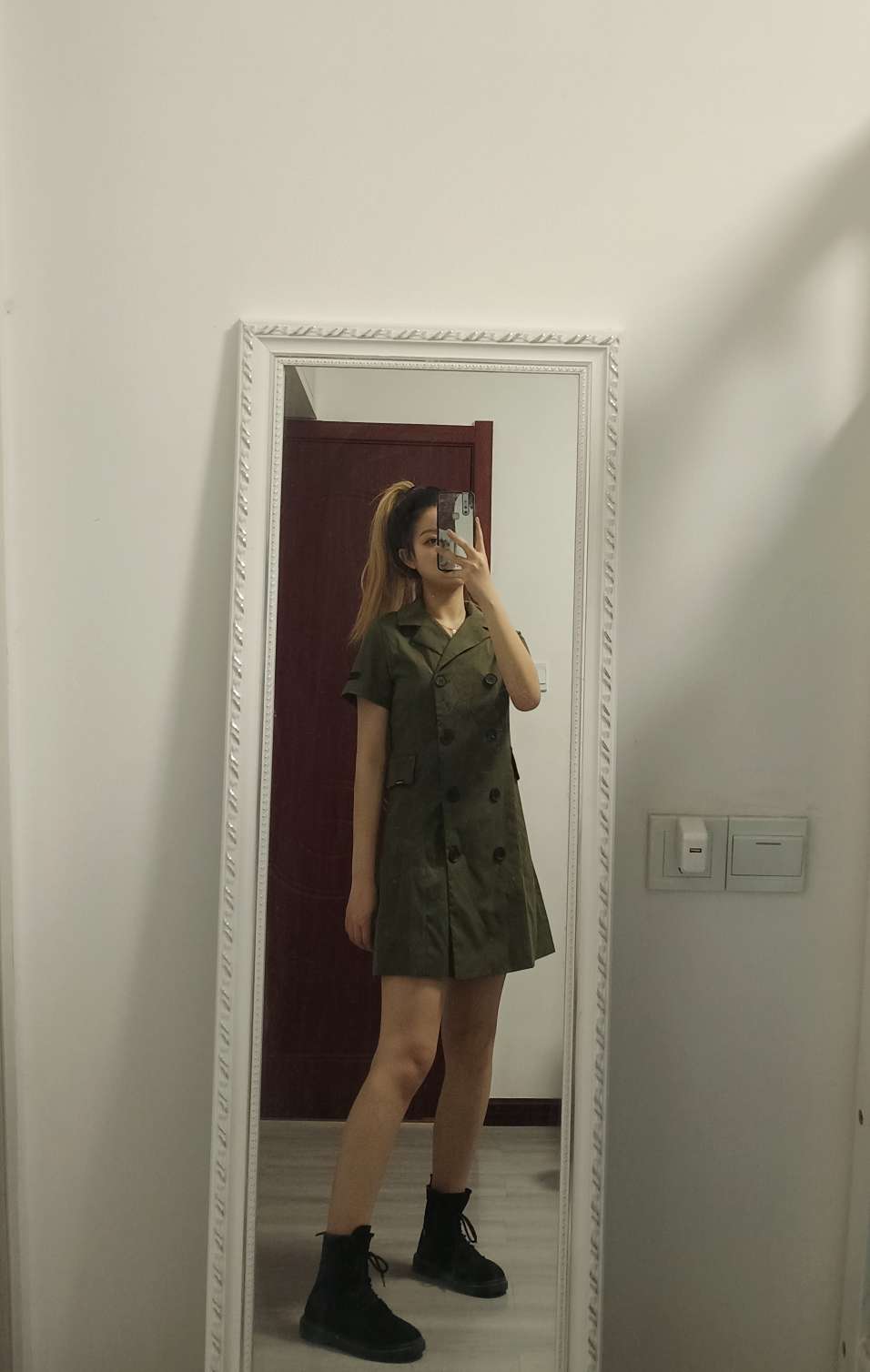一套拽酷的穿搭分享٩(⑉Ծ^Ծ⑉)ᕗ 👗: 军绿色双排扣连衣短裙,穿上它你就是拽姐本姐,辣妹本妹👍🏻🐮,图片一张是系了腰带一个是没系腰带的,版型蛮不错的(据说是泫雅关晓彤同款🤭) 👞: 黑色绒面靴子👏🏻 [ ps:这一身搭配➕高马尾真的超飒 ] 姐妹们给我拽起来🤓~