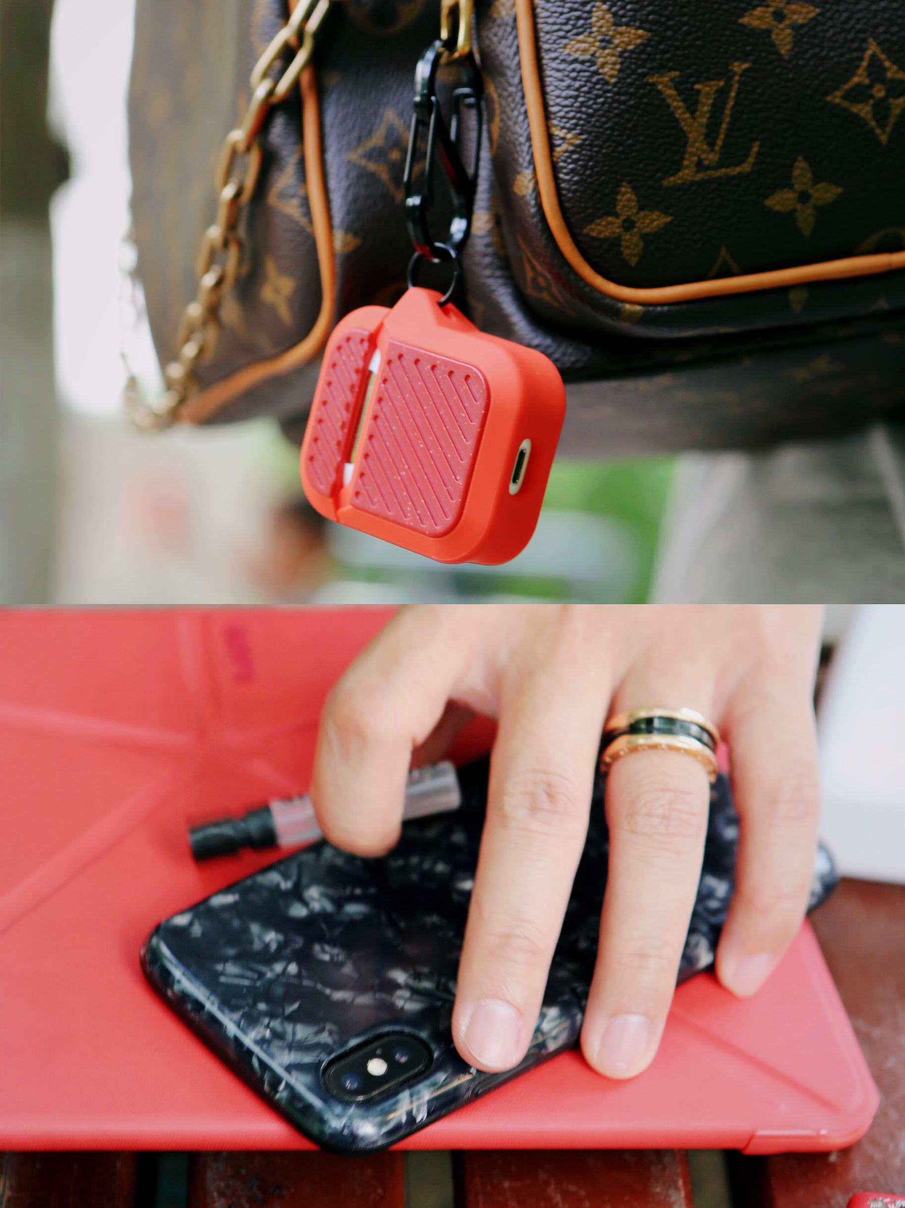 Airpods的外壳也是,特别紧实!尤其是上盖,用力也不会脱落!厚实的外壳,不怕掉落,金属件也很有质感,挂在包包上非常心安。