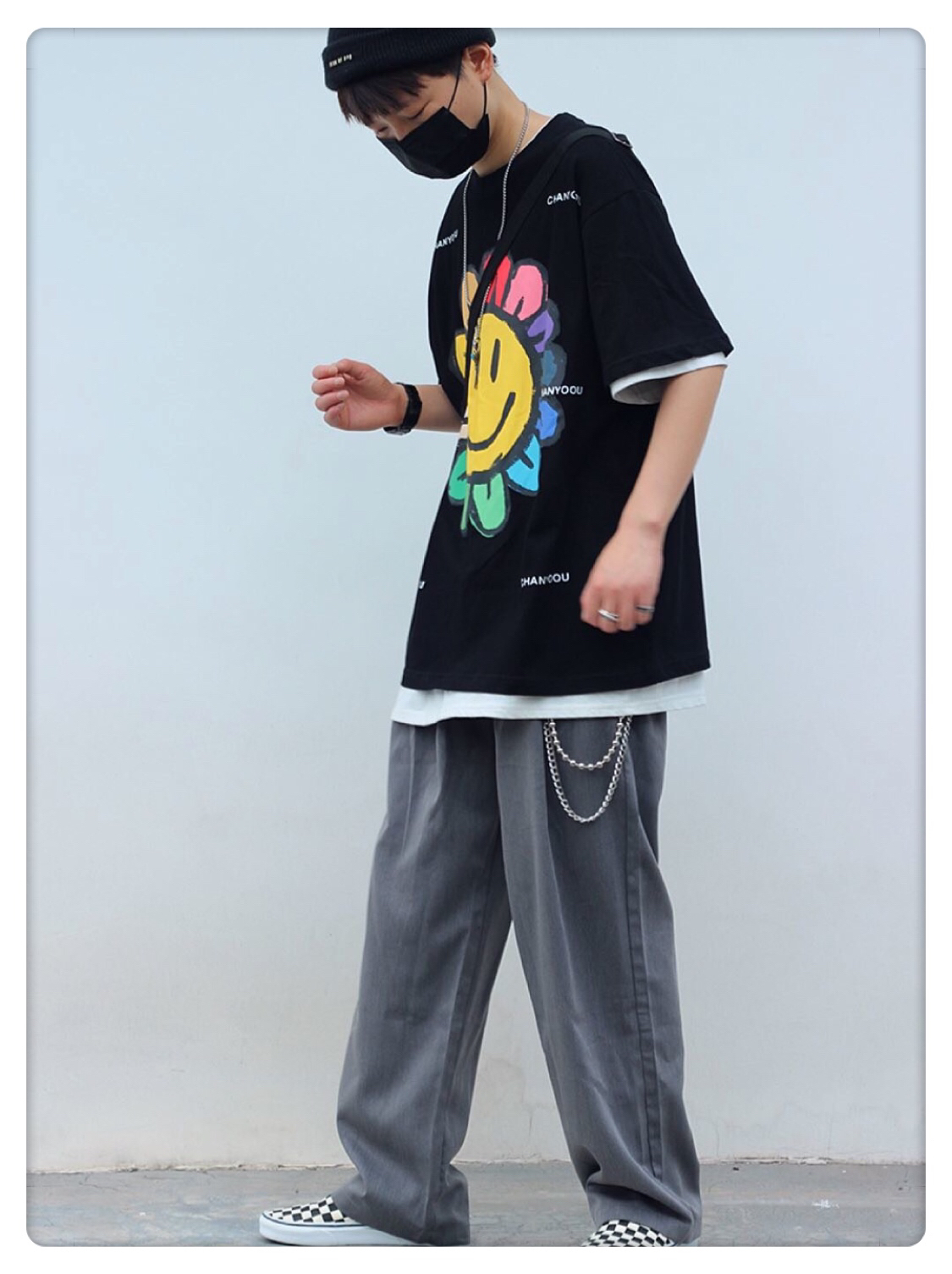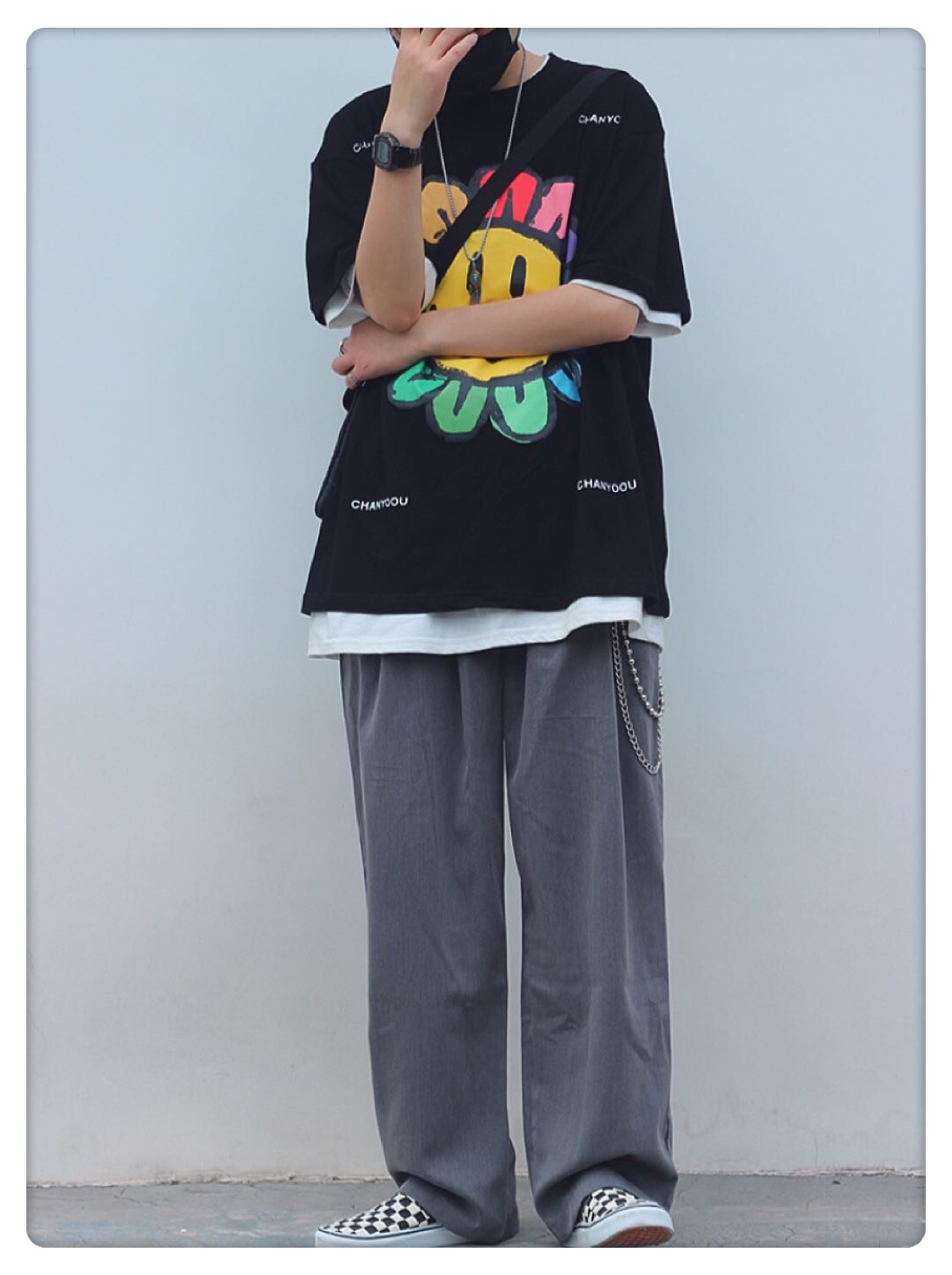 👕:T恤是太阳🌞花的印花设计、领口不大、面料舒服、内搭一件白t、穿出叠穿的感觉、上身效果很赞。 👖:西装面料、上身效果很显高、垂感很好、面料很舒服、夏天穿也不会热、外搭一条裤链、非常好看。 👟:vans棋格一脚蹬 很好搭、值得推荐