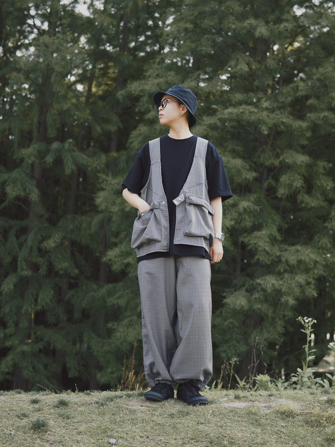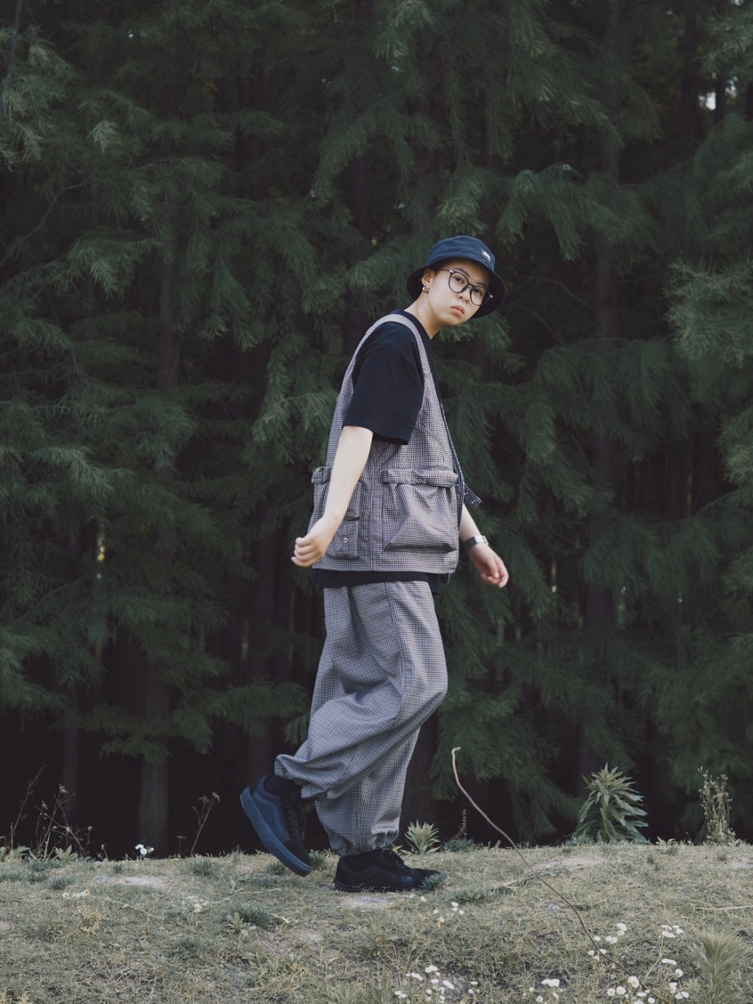 👔:Supertofu 千鸟格马甲,很特别~最近特别喜欢千鸟格。有很多多功能口袋,比较便捷。最重要的是很好看!质量也很好 👖:Supertofu 与上衣一样,也是千鸟格,垂感很好!裤脚还有抽绳,可以阔腿也可以束脚。质量不错,版型很好。 👟:VANS 黑武士