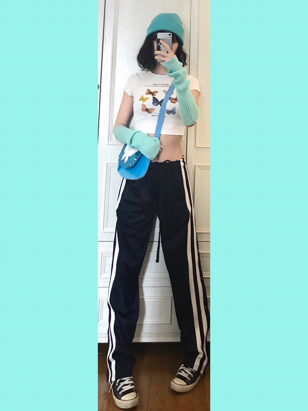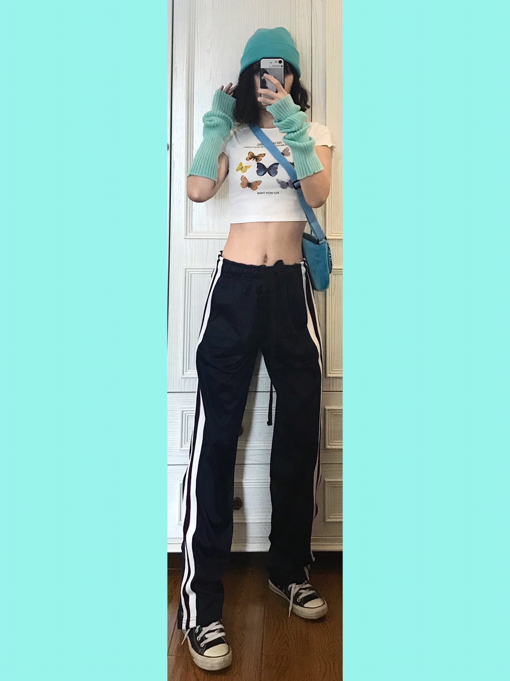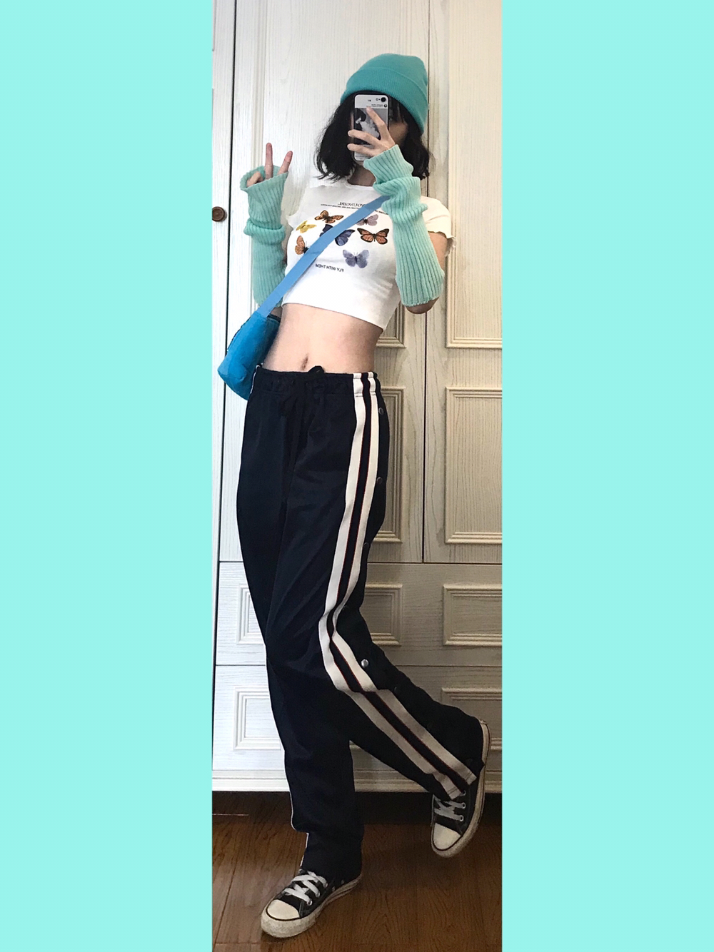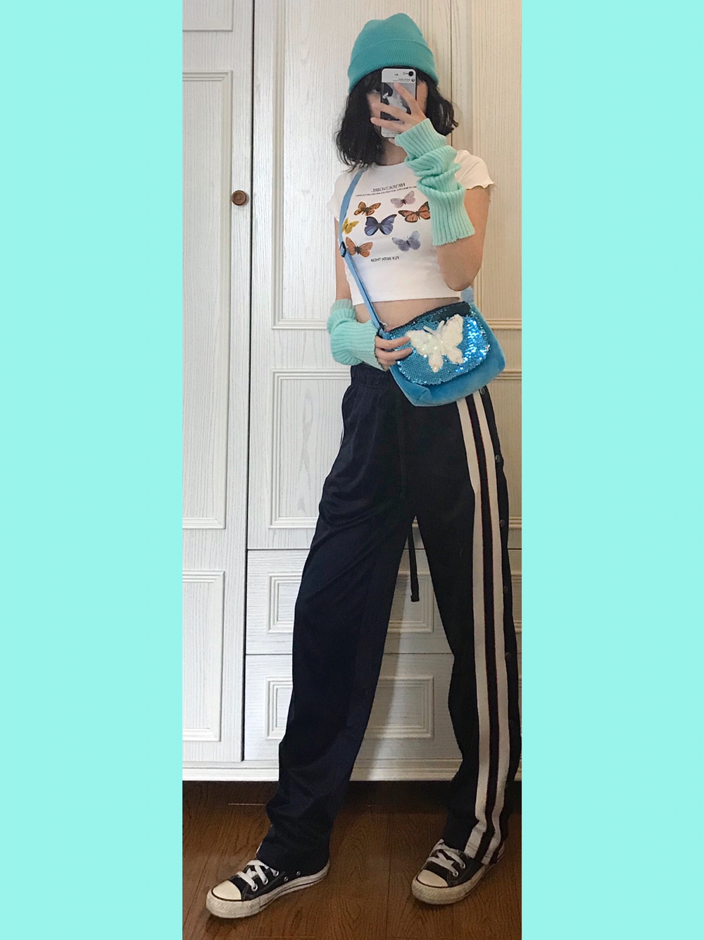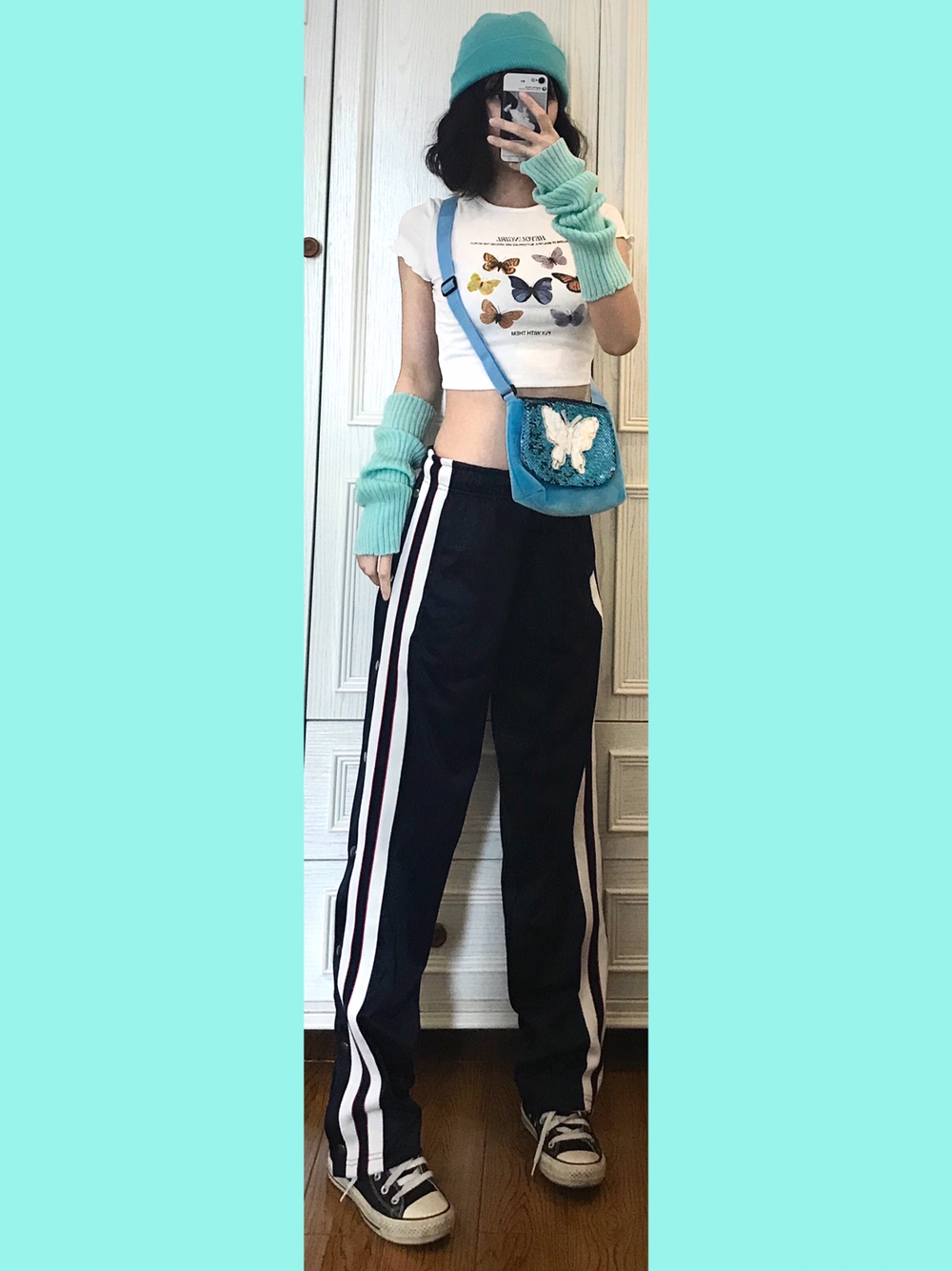 🍭穿搭灵感来源🌙 上衣🐻前有各种颜色的花蝴蝶!我选择了一个大色块来做其他的搭配~又能呼应又不会出错~ 🎵Bgm:Chace-Cradles Song 🍭单品配饰如下🌙 👚随便🍑滴露脐蝴蝶短袖 蝴蝶元素的真的看到一件就忍不住剁手哈!配饰项链包包啥的我也都忍不住想拥有…… 🎒蓝色系刺绣珠片蝴蝶斜挎包 看着蛮小的包~做工其实蛮不错滴!毛茸茸的质感很舒服~秋冬背也木有问题 💁🏼薄荷绿袖套 本来想用黄色袖套...