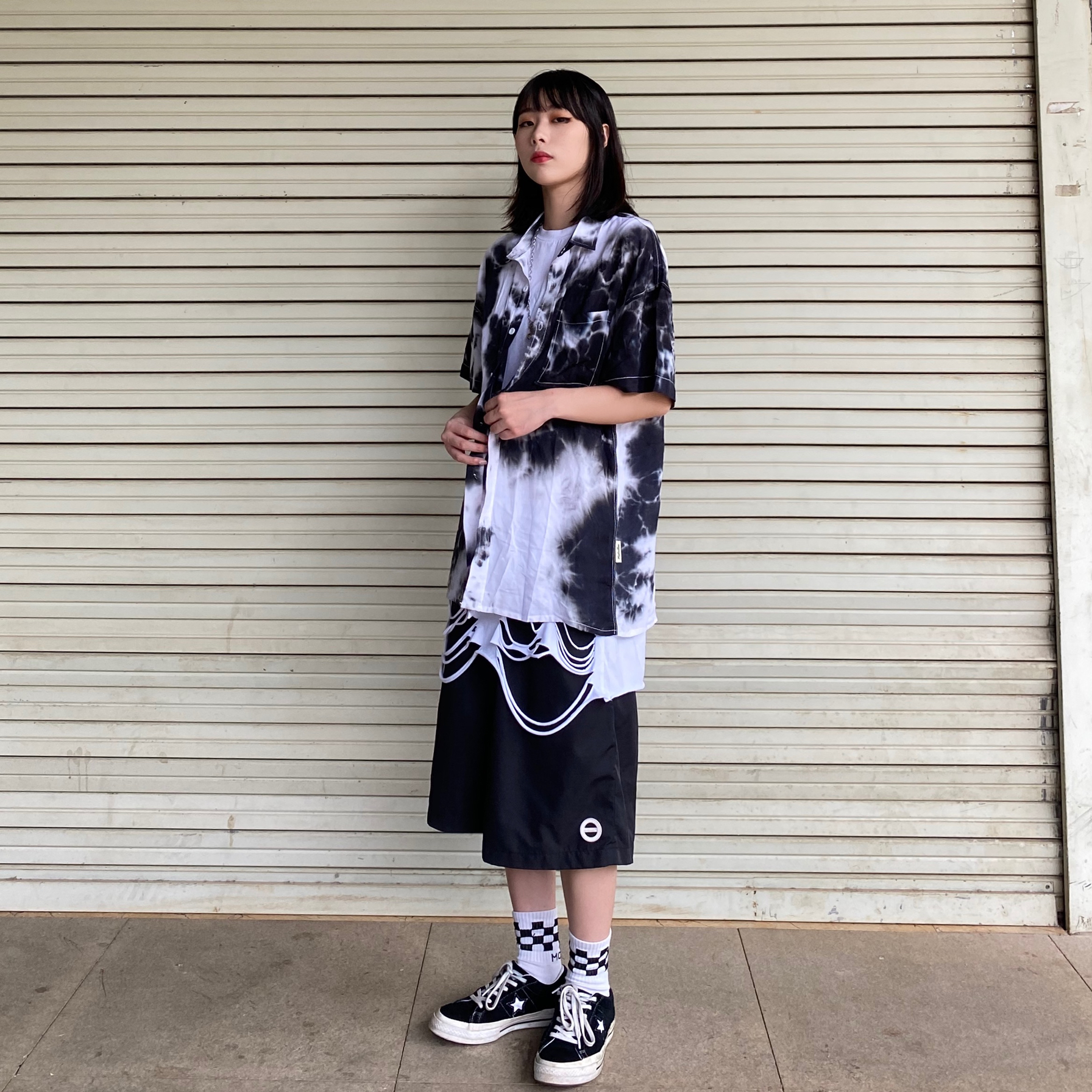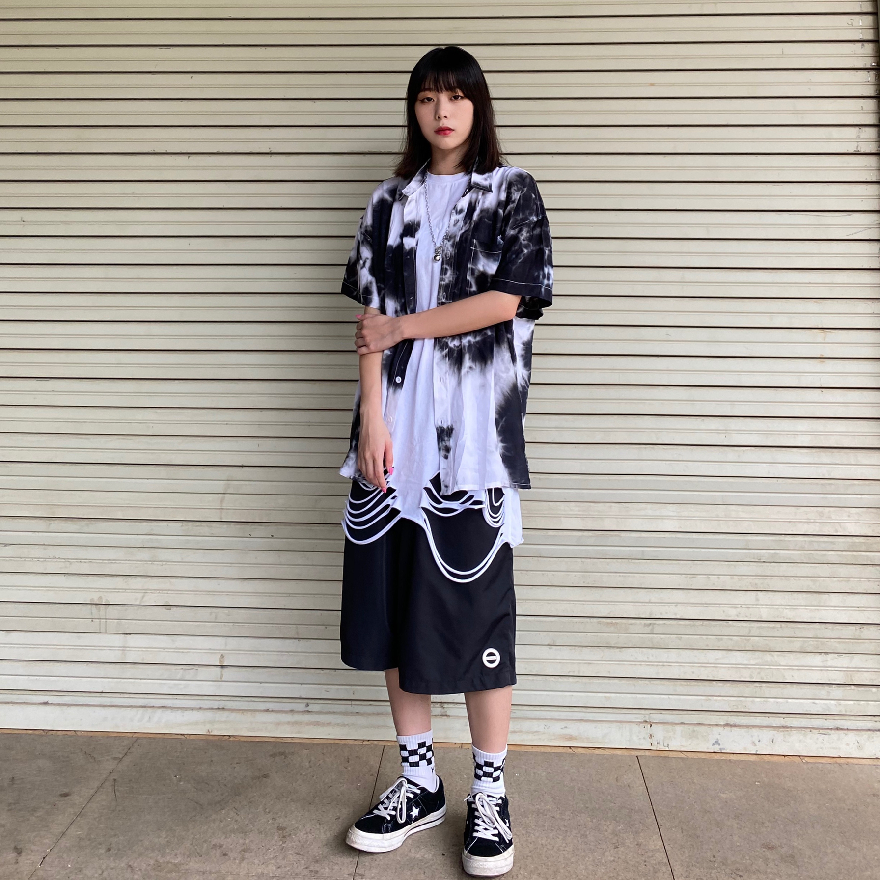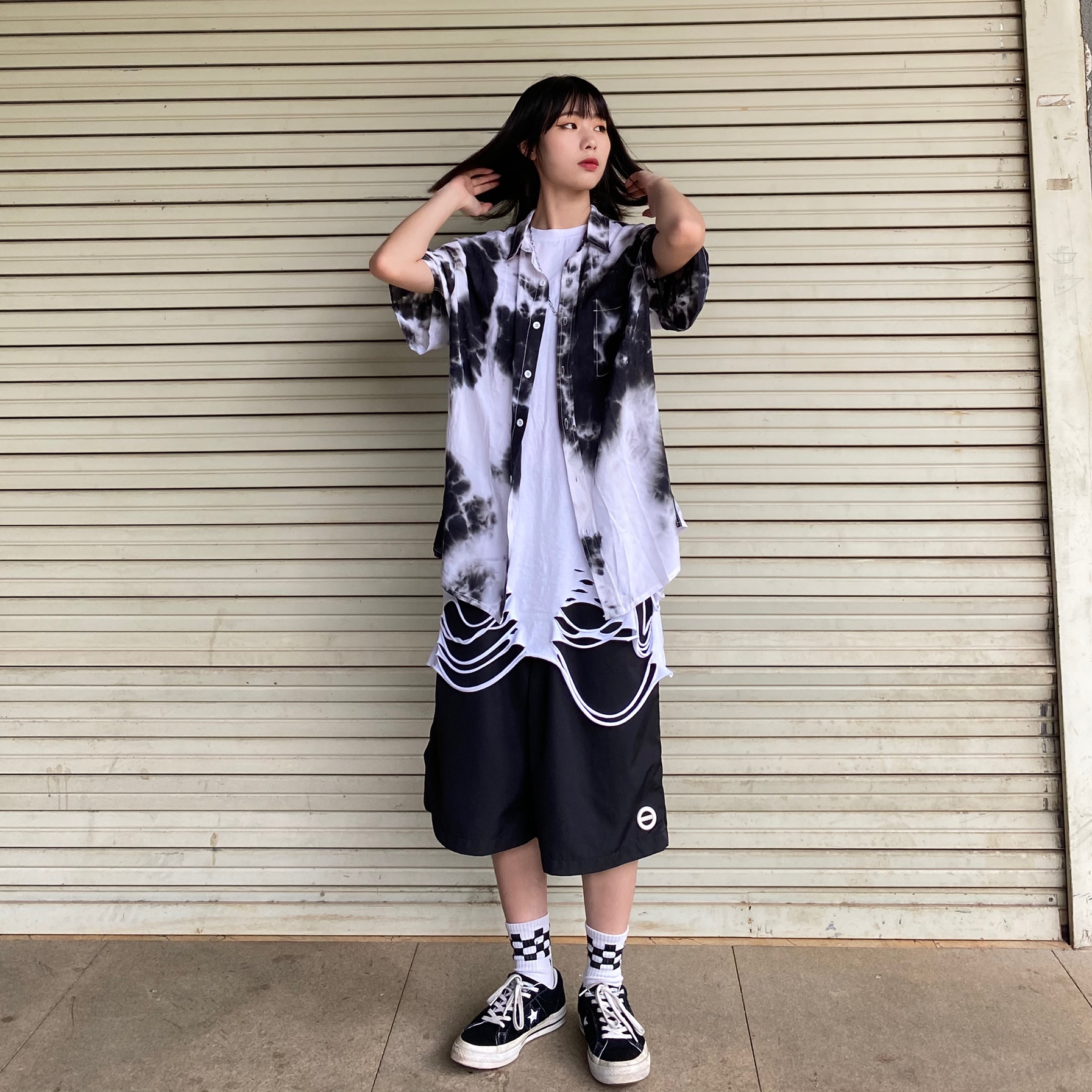 衬衫:MASTERBLESS 扎染短袖衬衫,不规则的扎染设计高街感满满,最喜欢的是它的面料,超软超透气,这个面料夏天穿太赞了,里面搭配个小背心完全不热 内搭:破洞背心打底 裤子:No-bundle 这条七分裤搭配高街感的衣服和谐又好看,裤腿反光的logo增加细节很有质感,面料光滑,穿着不闷热 鞋子:Converse One Star 百搭的板鞋