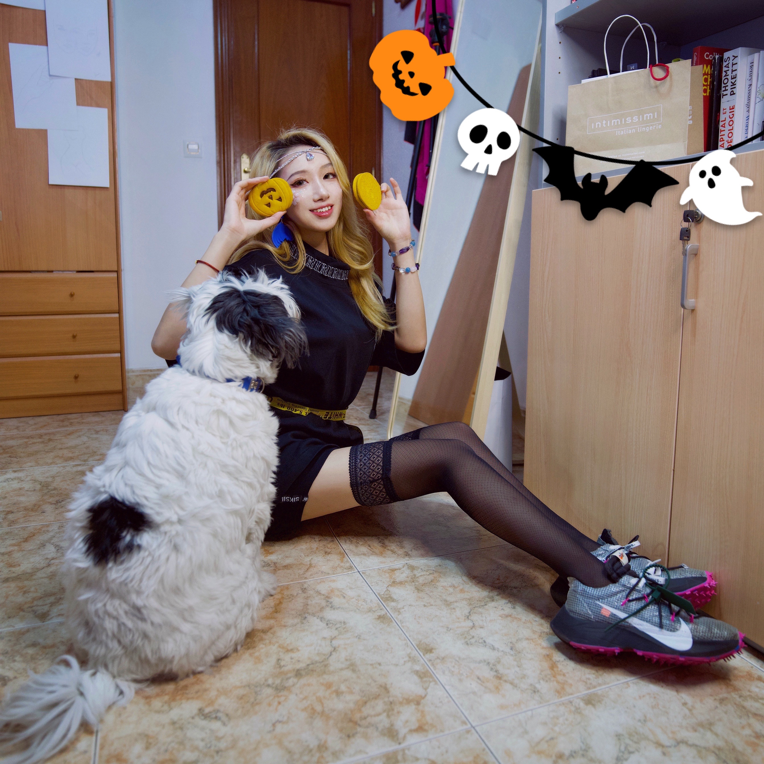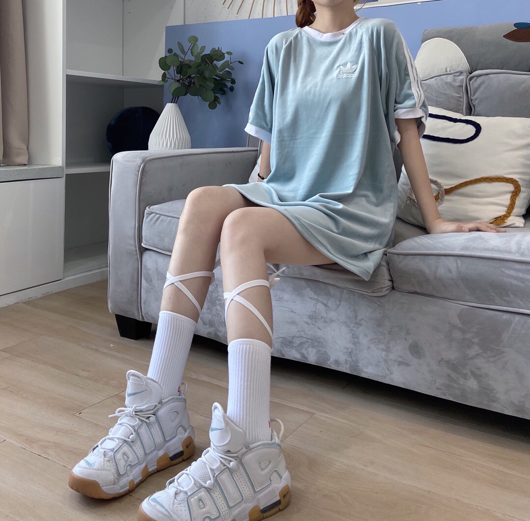 上身:Adidas拼接撞色裙子 雾霾蓝的颜色简直为夏天量身定做 很小清新很显白的一款 长度也刚刚好 超级好看~ 下身:搭配了一条短裤 袜子是最近很🔥的交叉绑带袜子 很显腿长!上身效果很不错