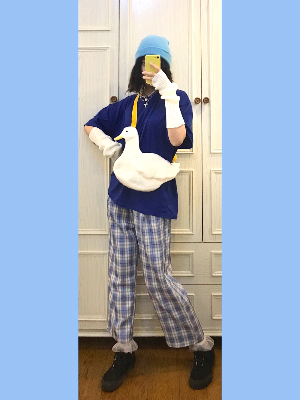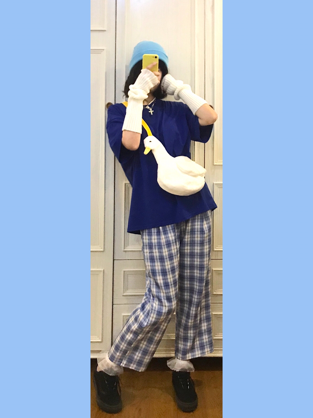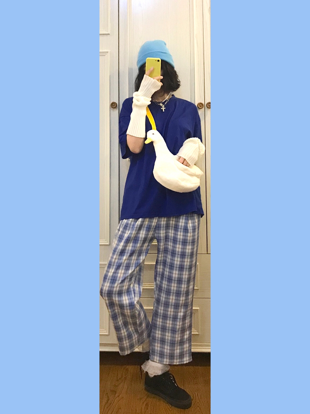 🐳穿搭灵感来源🌙 Bm风格子休闲裤舒服又百搭~一点都不会像睡裤!还显得人特别滴年轻嘿嘿😂 🎵Bgm:xxxtentacion-whoa(mind in awe) 🐳单品配饰如下🌙 👚随便🍑滴18💰短袖 实不相瞒我入了将近全部配色的oversized大短袖上班穿!舒服就完事! 👒淡蓝色绒线帽 什么颜色的裤子就搭配什么颜色的帽子!🐻弟🚪懂了🐴!颜色一样就是最机智滴 🎒毛绒鸭鸭斜挎包 🌟肩带颜色莫名的和...