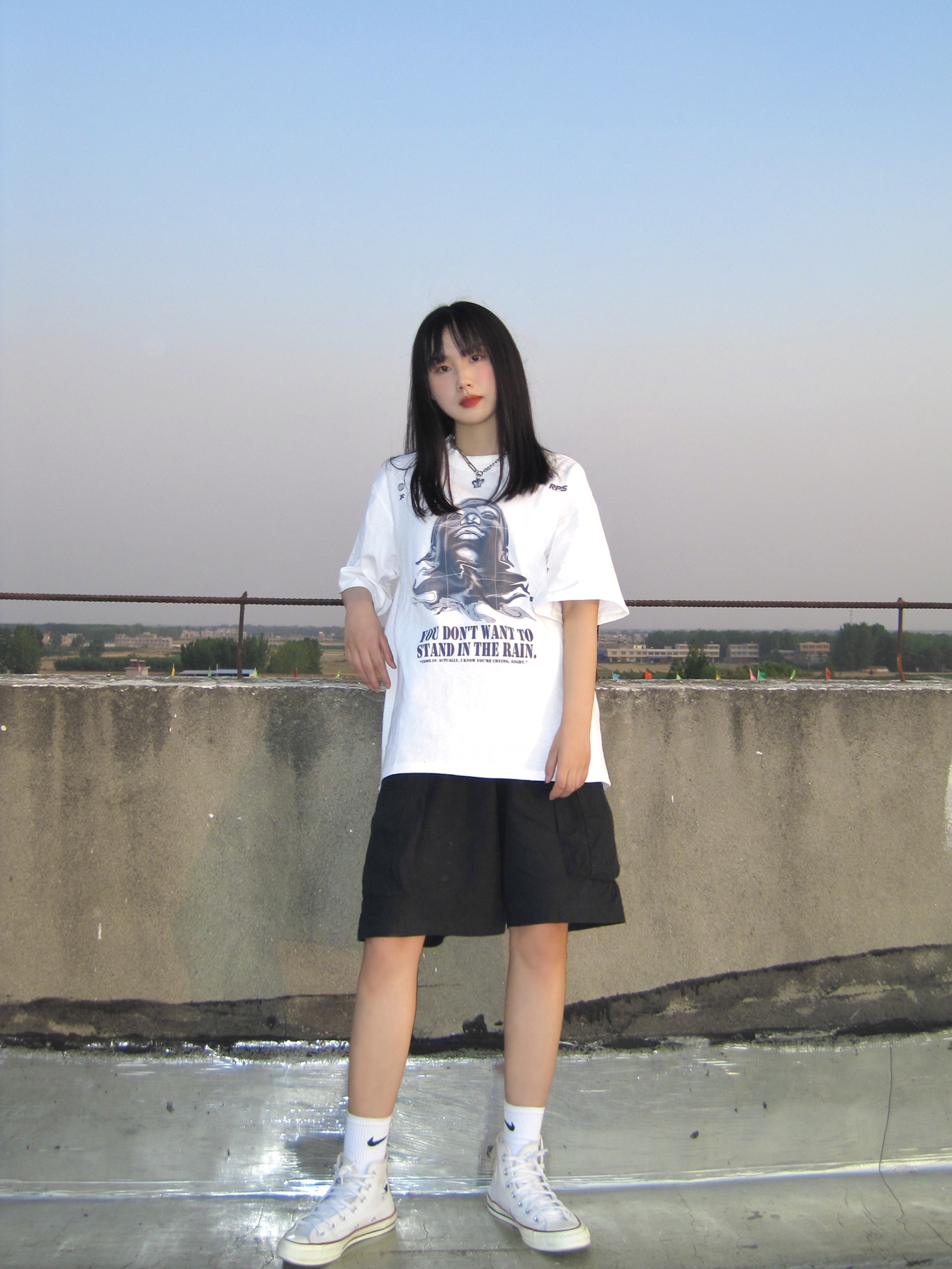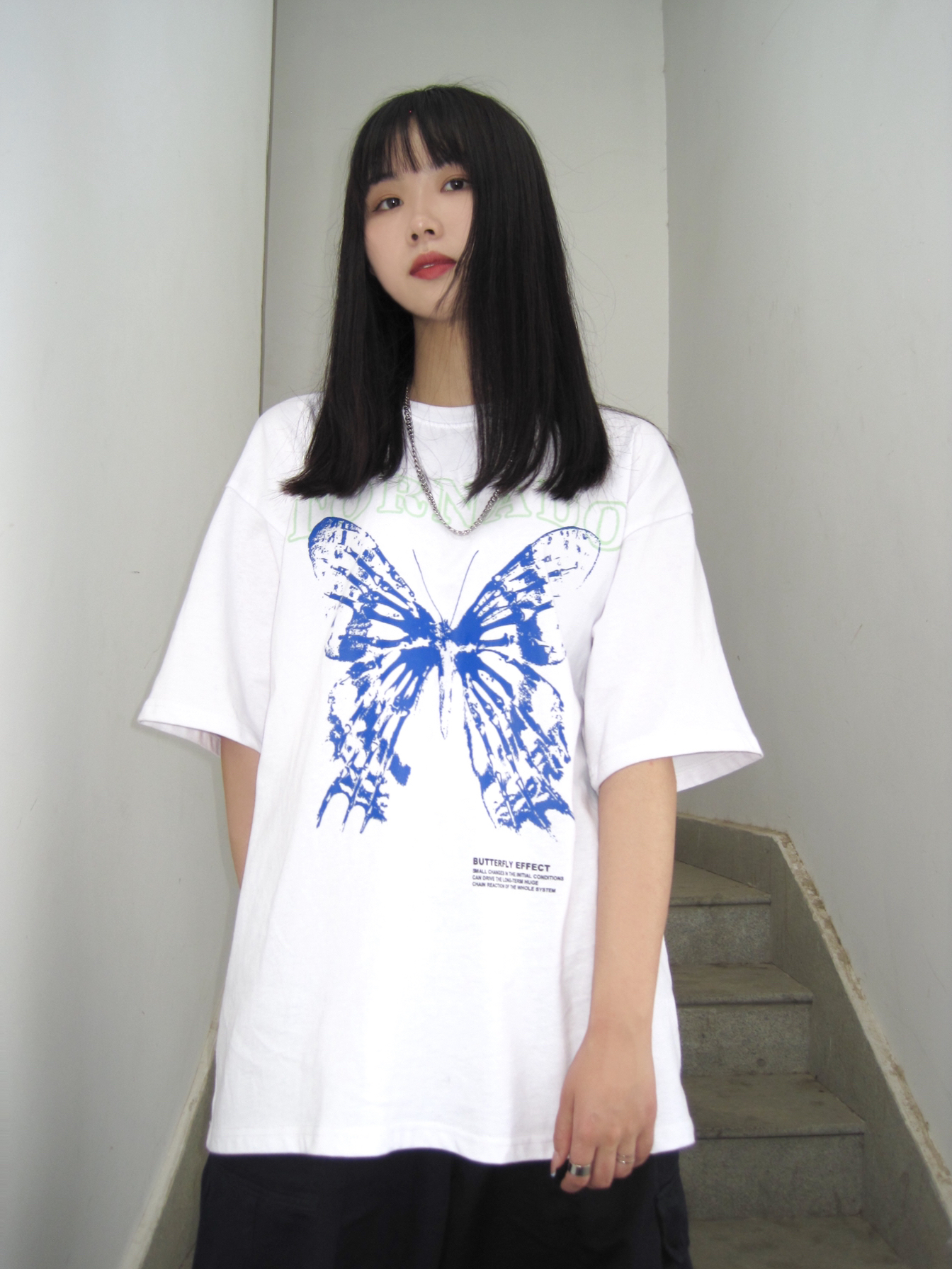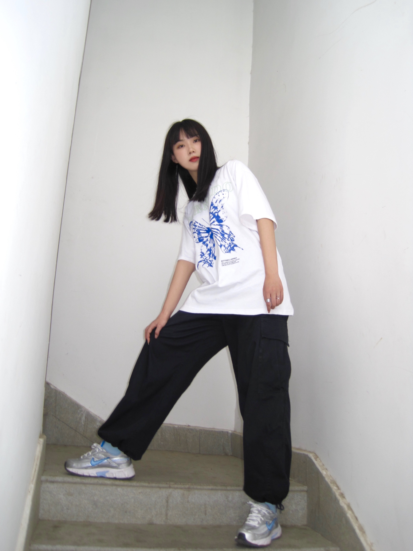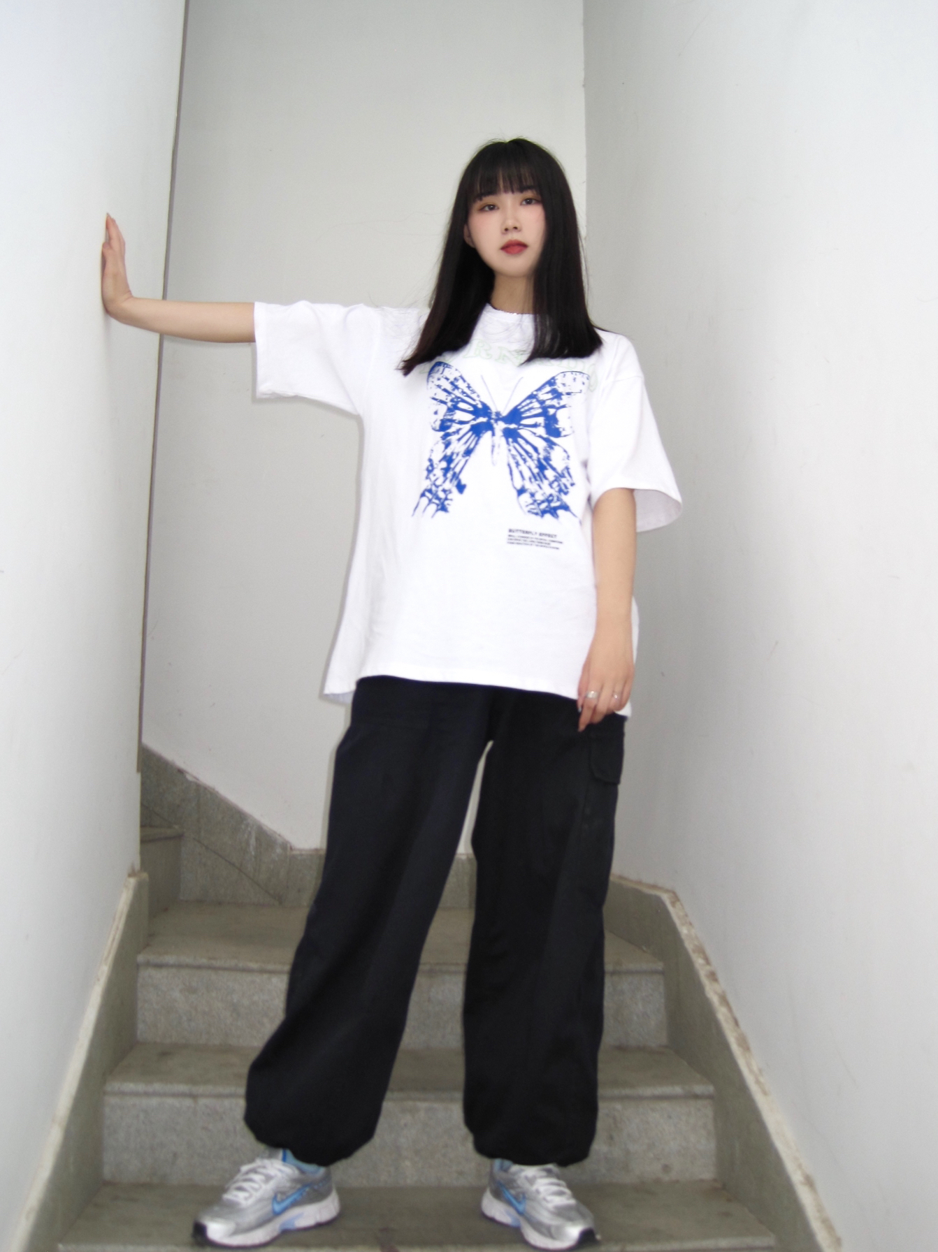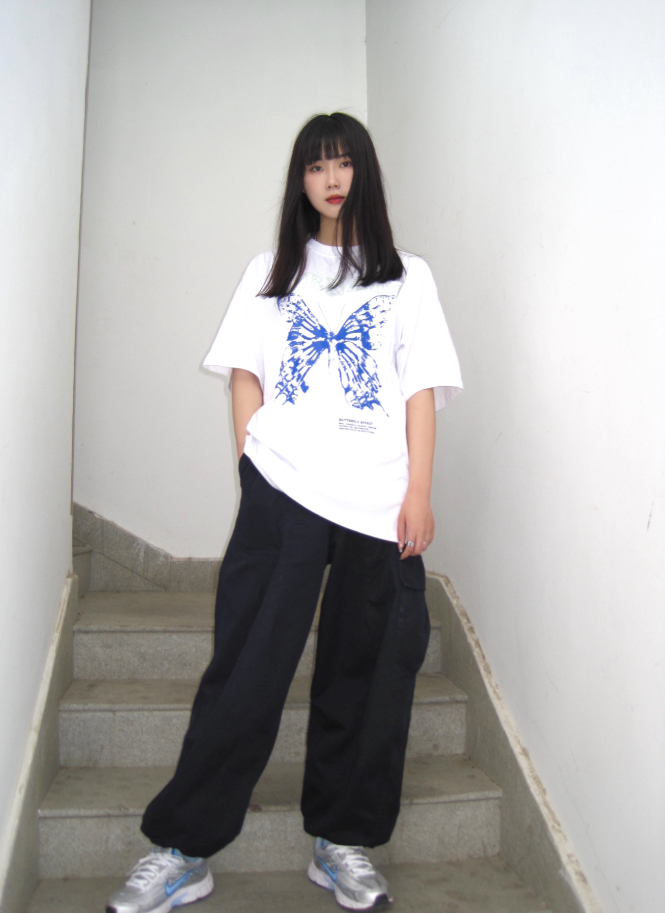 这条工装裤我真的太爱了 上衣是oversize风 图案是今年风很大的蝴蝶元素 炒鸡好看! 裤子如果搭配宽松T恤是工装风 高腰的设计 如果搭配紧身短T还可以穿出大长腿 显高显瘦 下面的抽绳可以调节 解开也很好看