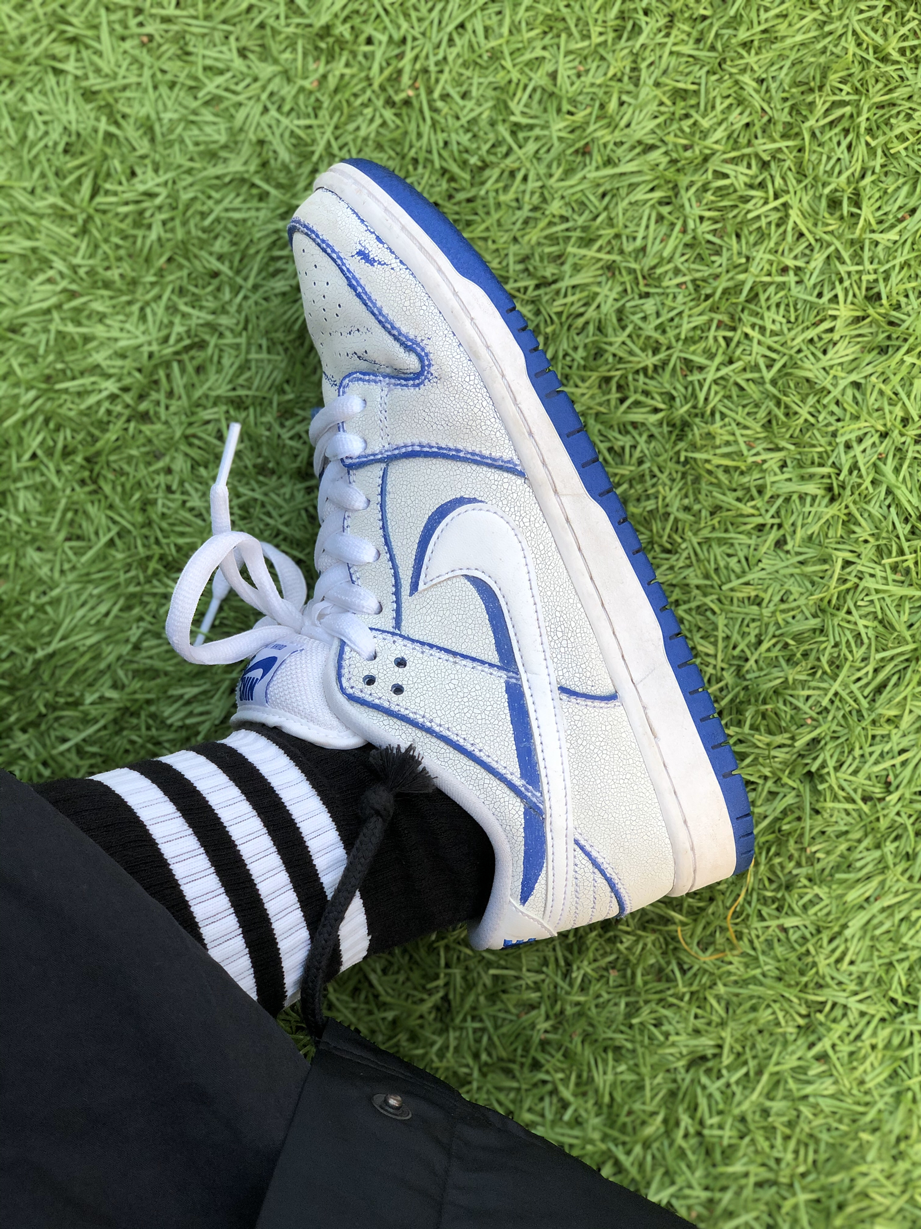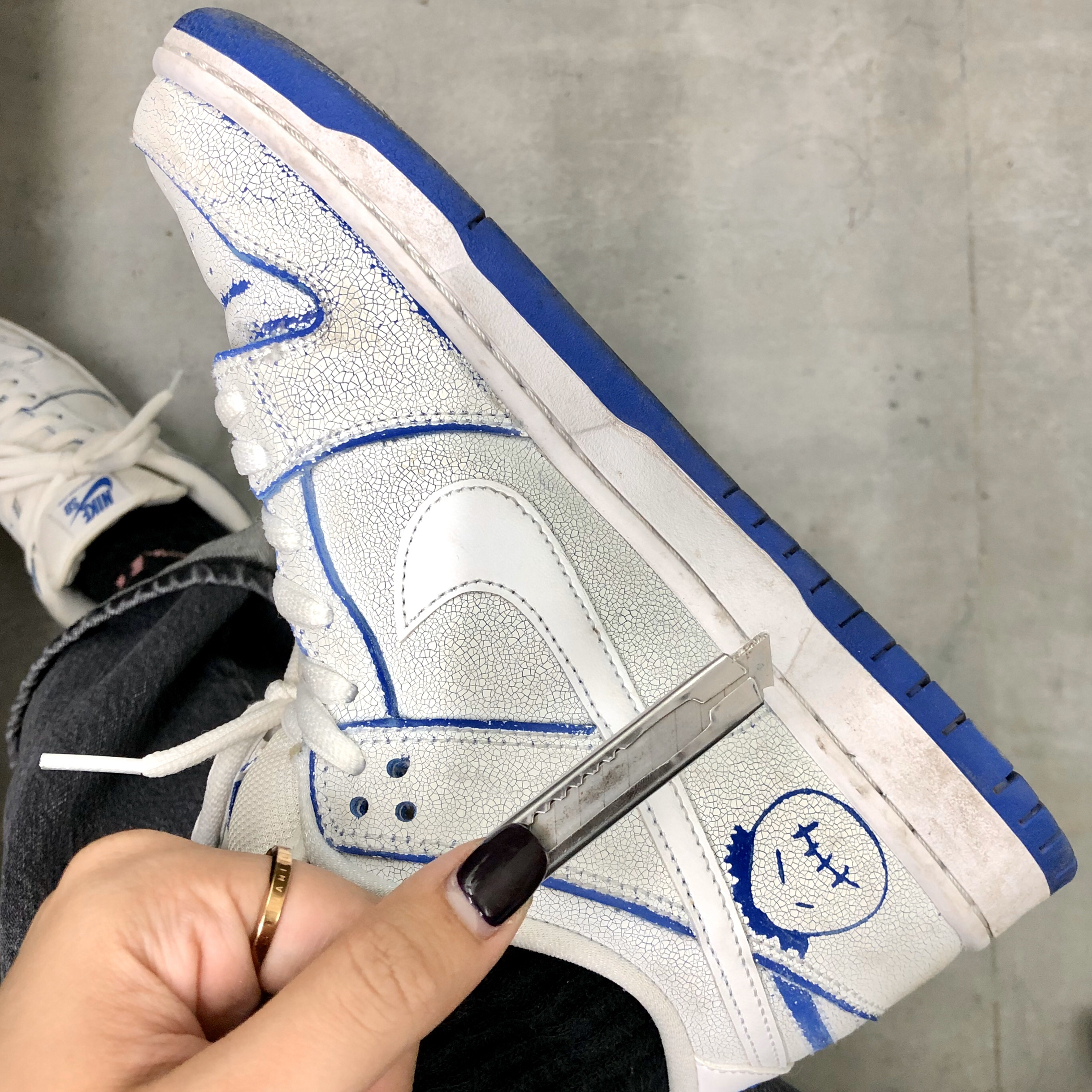 一双让人沉迷的SB DUNK OG鞋型配上自己的手工 每双鞋 都是独一无二的 鞋身裂纹白搭配鞋底蓝 穿一阵子“小白鞋” 然后再去创作也没问题 比起刮刮乐的名字 我觉得更该称为扣扣乐 毕竟鞋身真的得用扣的 花了好长时间