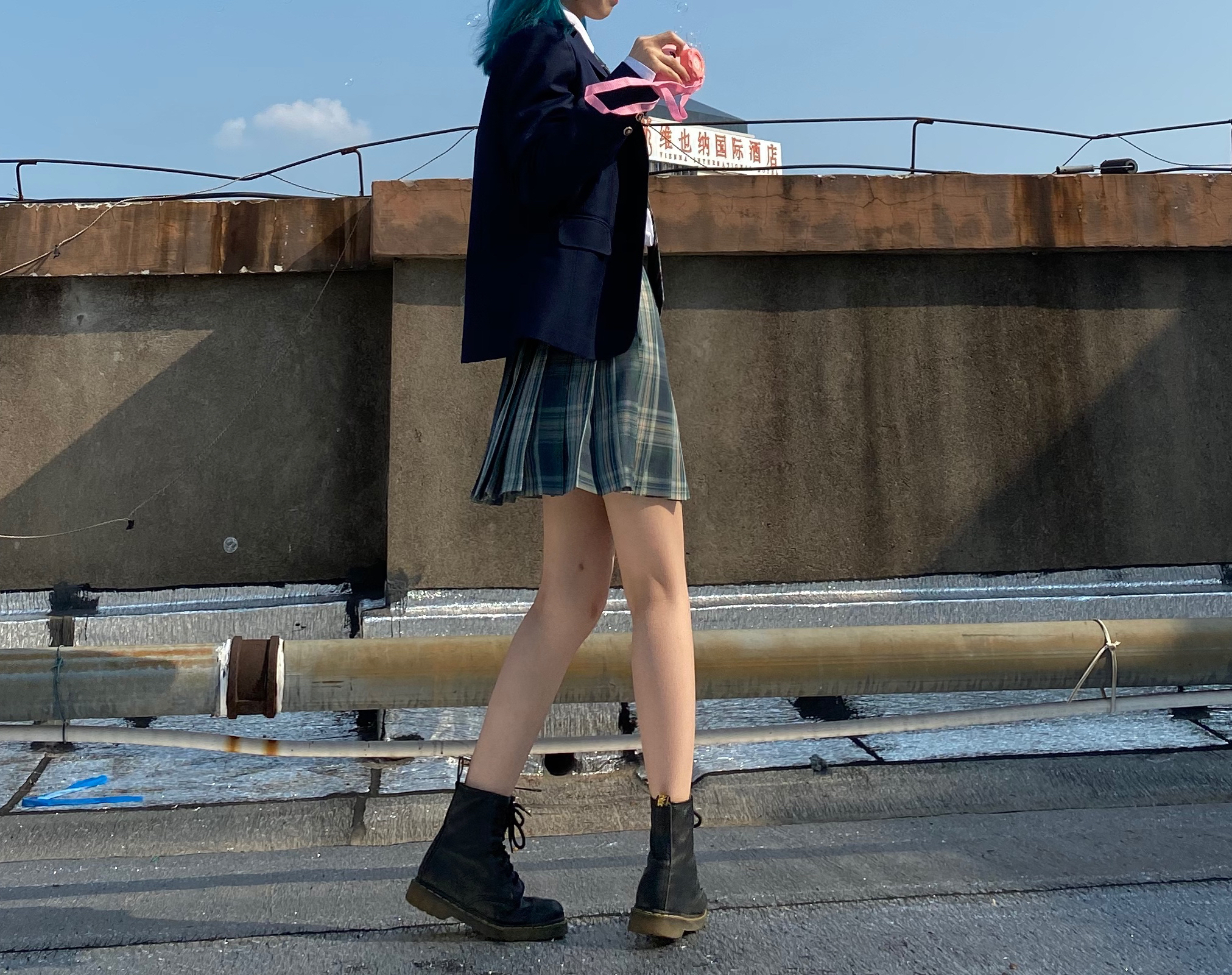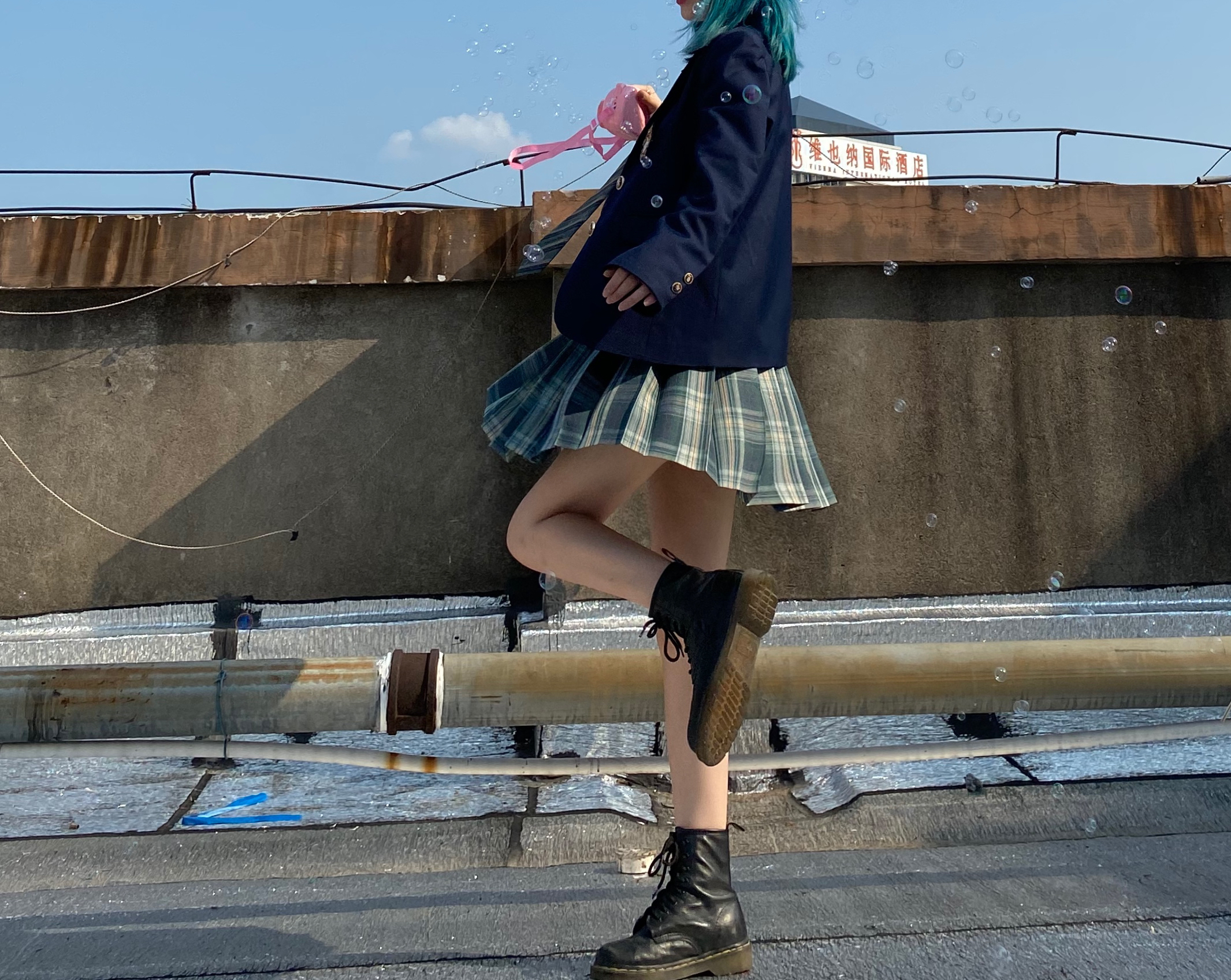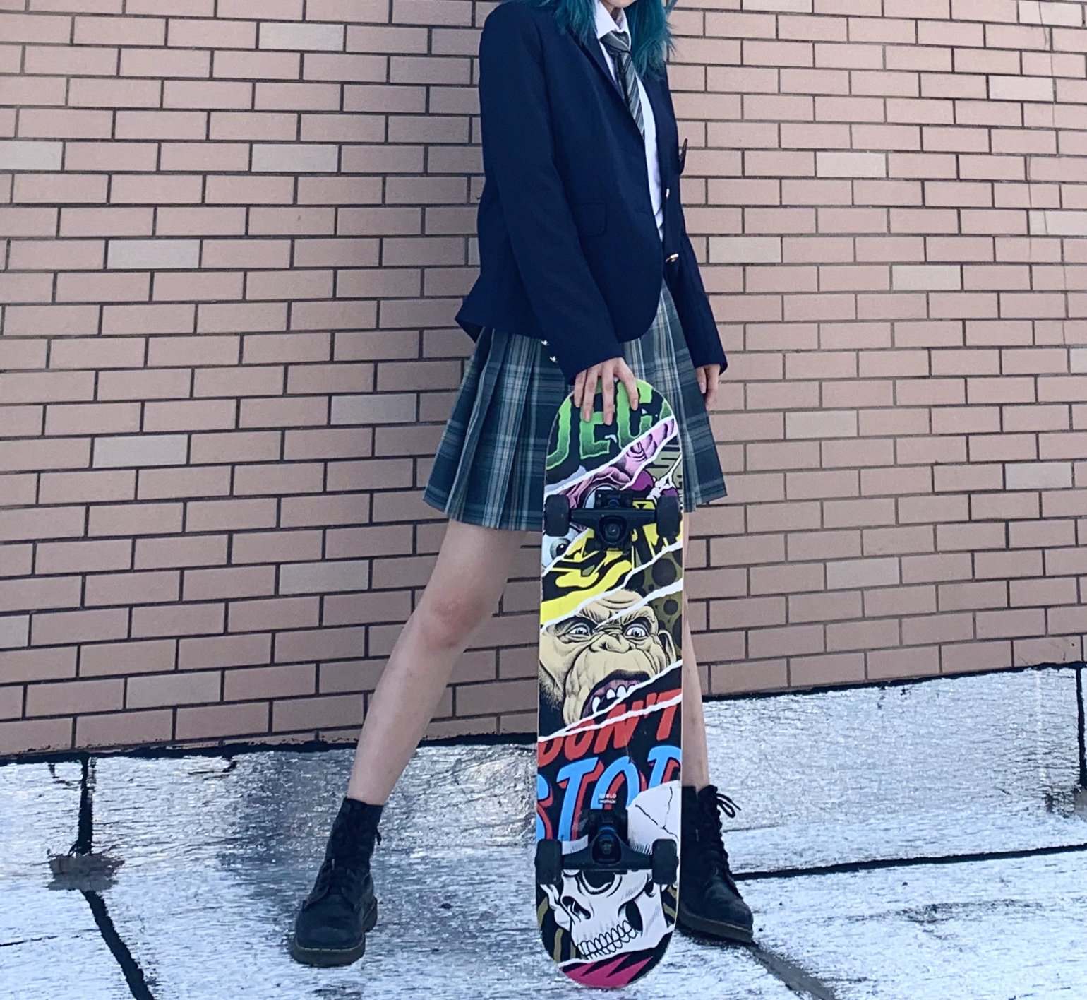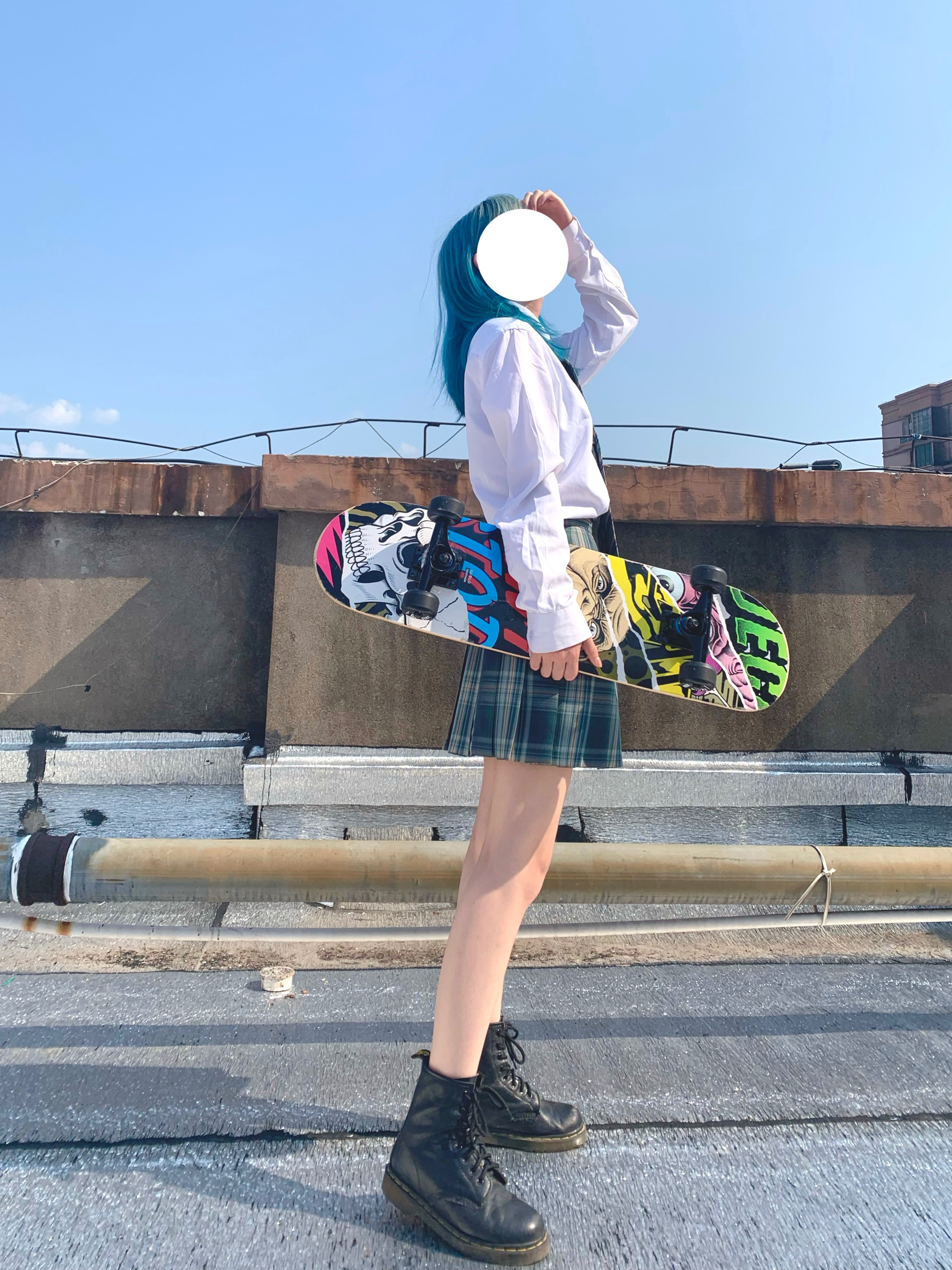 jk不一定是软萌软萌的,森林来信也可以穿出cool girl的感觉 常规制服搭配小裙子,配上dr的马丁靴,不仅腿立刻变得修长,气场也完全不一样了,再拎上一个“画风清奇”的滑板 一个字:绝 👔:雨你无瓜jk 👗:兔缝缝 👟:dr.martens