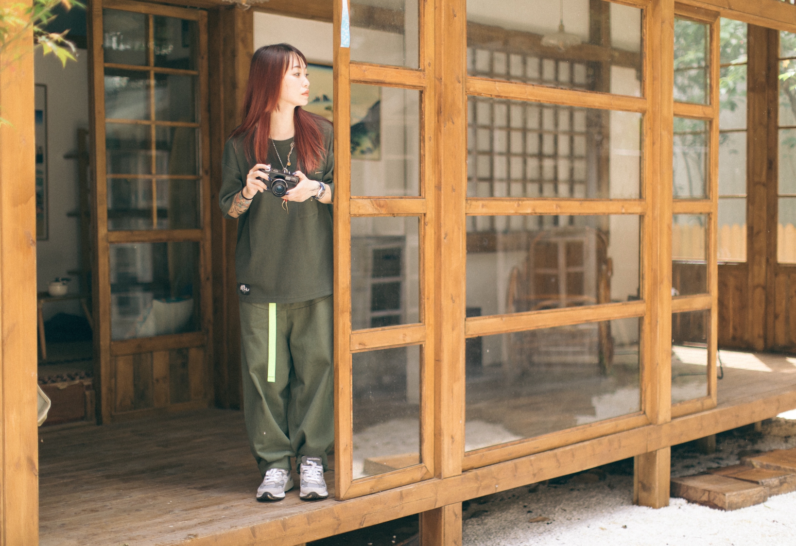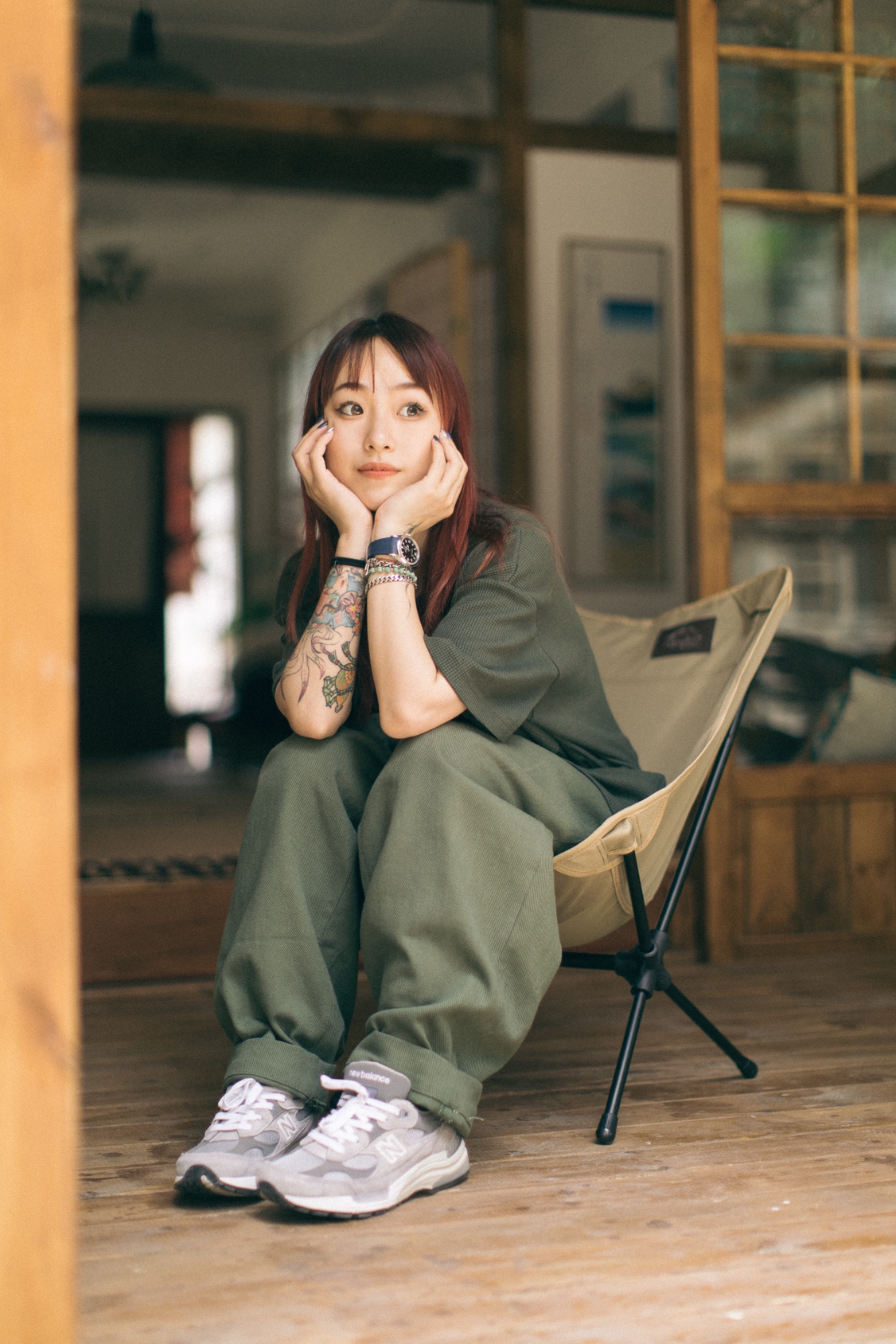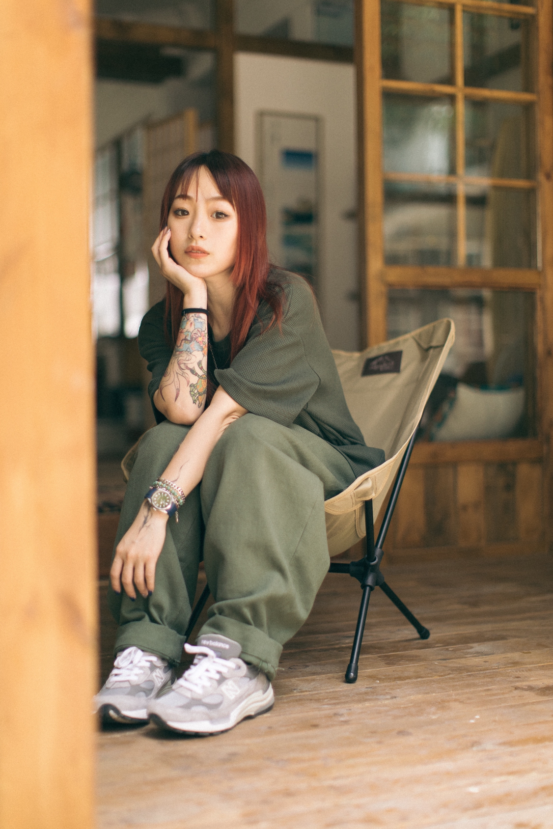 军绿色同色系搭配,工装裤搭配NB992元祖灰!清新又舒服😌! 图1由识货插画师@imairyoung创作