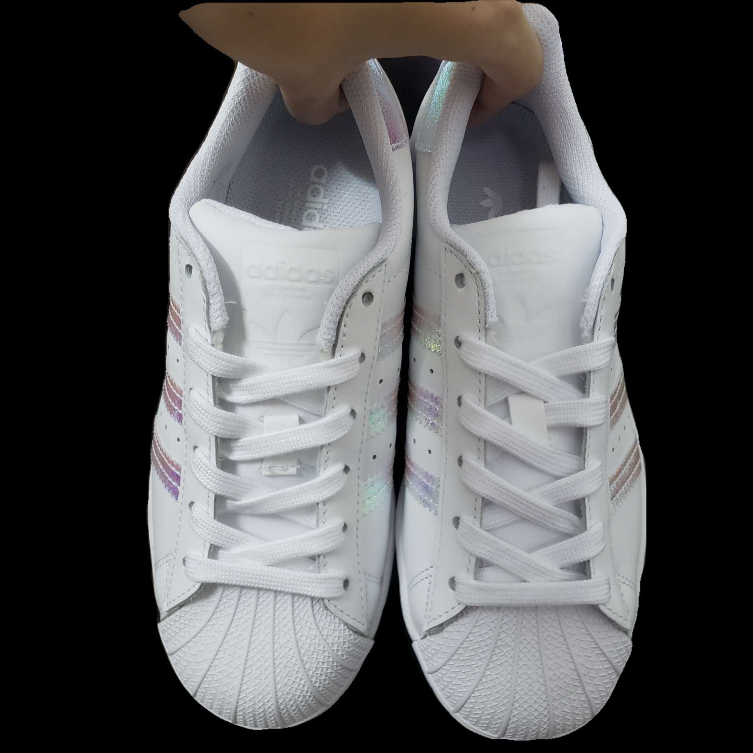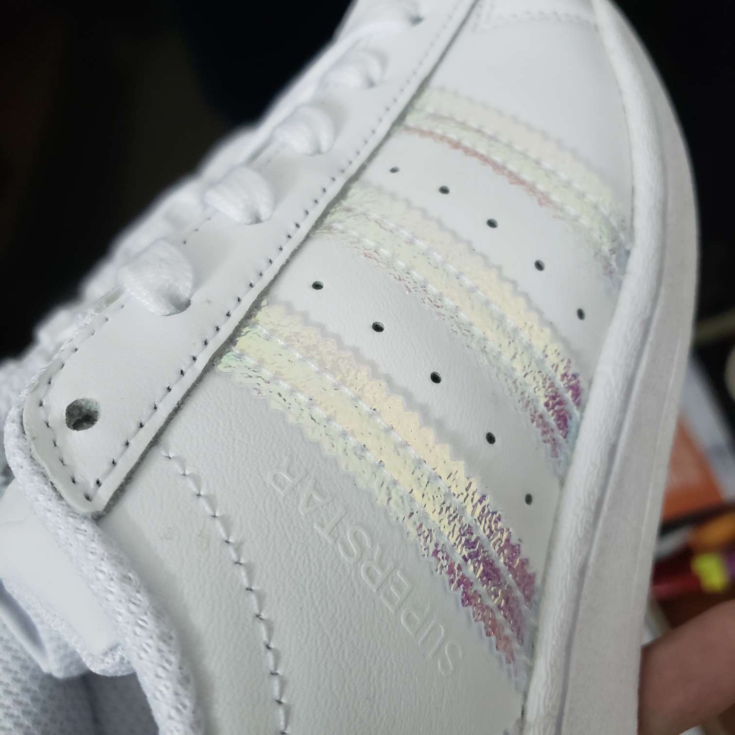 今天开箱这双只有女码的adidas originals superstar镭射。 鞋盒就是普通的蓝色鞋盒。镭射炫彩的侧边三道杠,后跟的一整块也是镭射设计,穿上就有一种时尚感,招牌橡胶贝壳头设计,永恒的经典。贝壳头的穿上就是舒适,它不软,但绝对不硬,刚刚合脚那种感觉,而且百搭,适合所有天气。 最近打折所有尺码价格都是270左右,对于一款经典且百搭的鞋子来说价格可以说非常低,喜欢的这款鞋的女生就别...