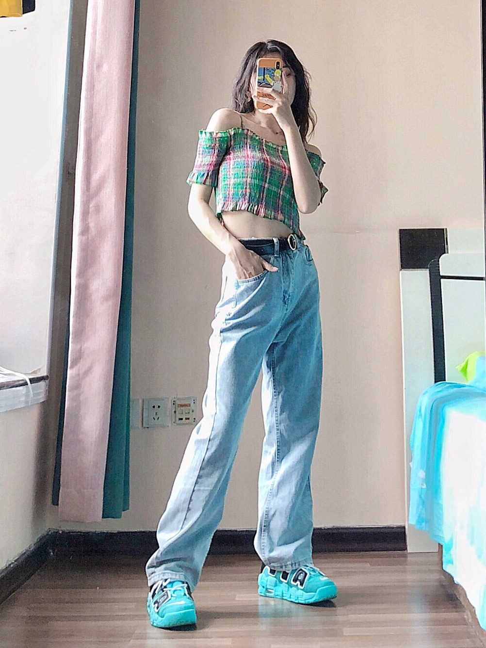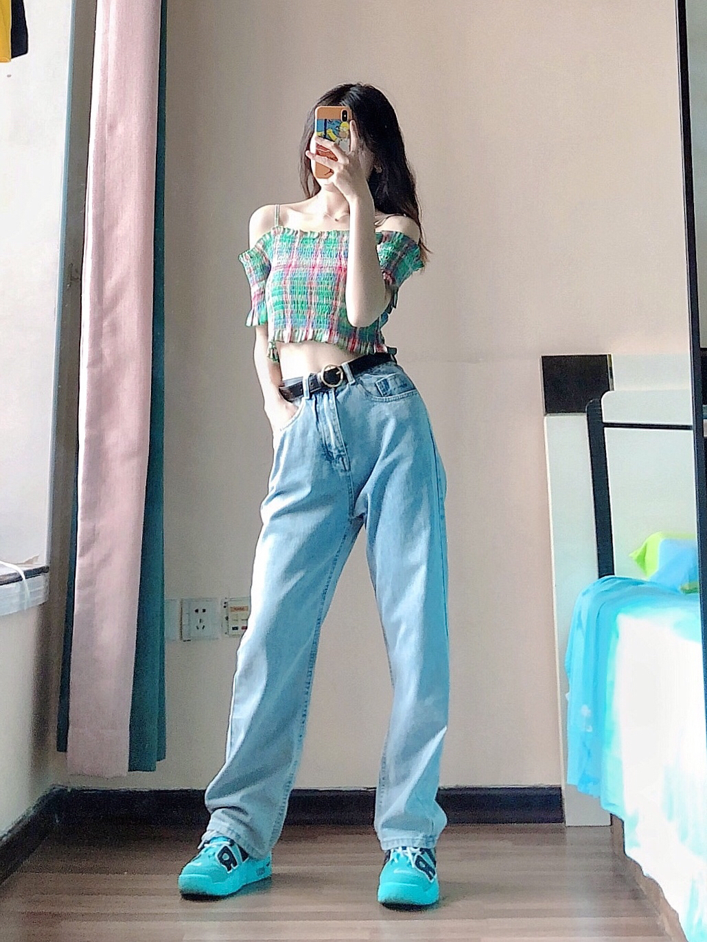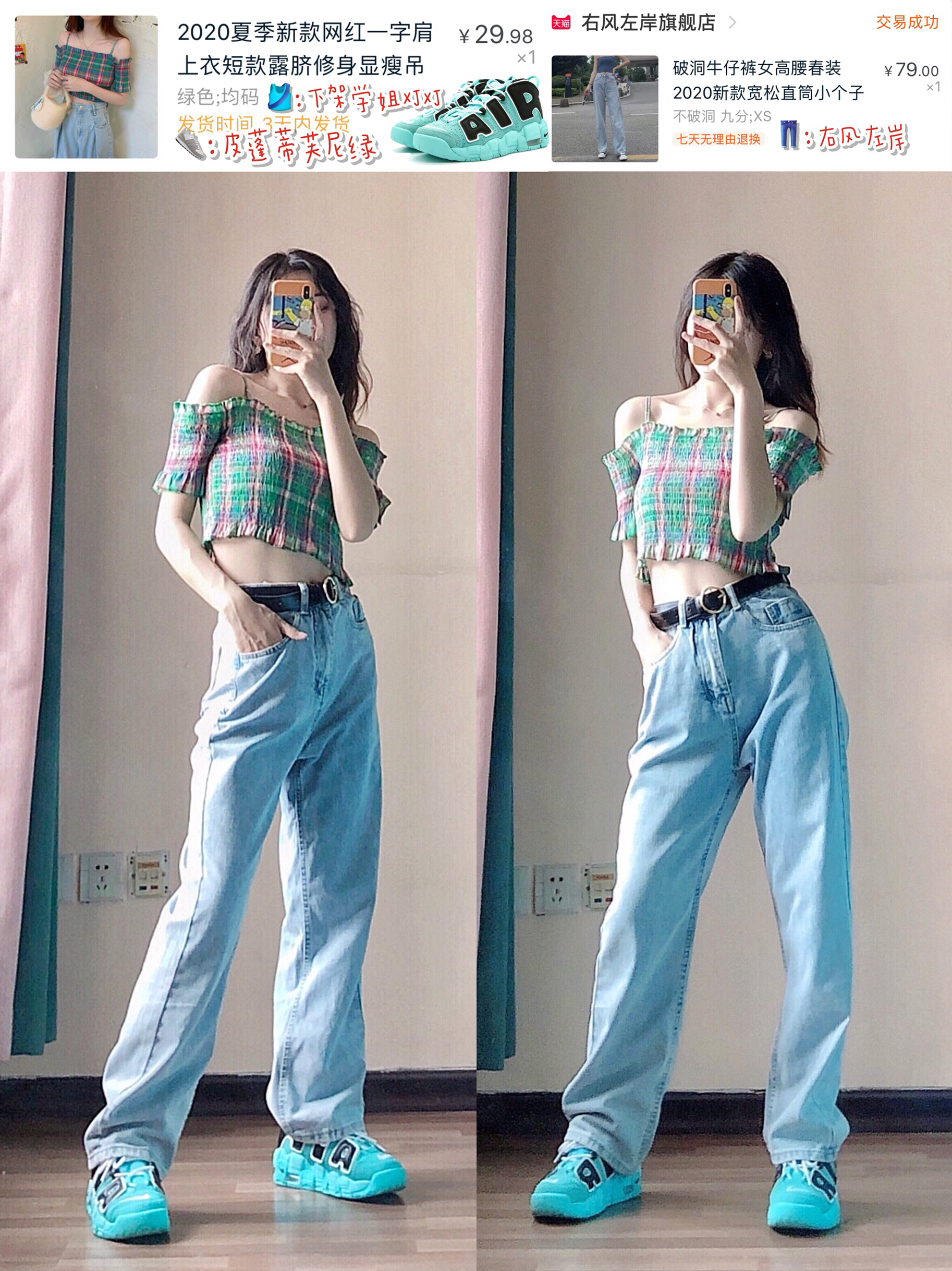 👧🏻:熙熙 小个子姐妹,梨形身材,小腿略粗 身高:155cm 体重:82斤 鞋码:36码 胸围:74cm 腰围:60cm 臀围:84cm 肩宽40cm 大腿围:42cm 小腿围:30cm 💕:熙熙拍照绝不拉腿不瘦腿,150-160身高的老铁都可以借鉴 🛒:穿搭细节都在图上,记得仔细看图哦 —————————— 👚:绿色一字领短上衣—下架学姐XJXJ 这款绿色短款吊带上衣,重点在于他的一字...