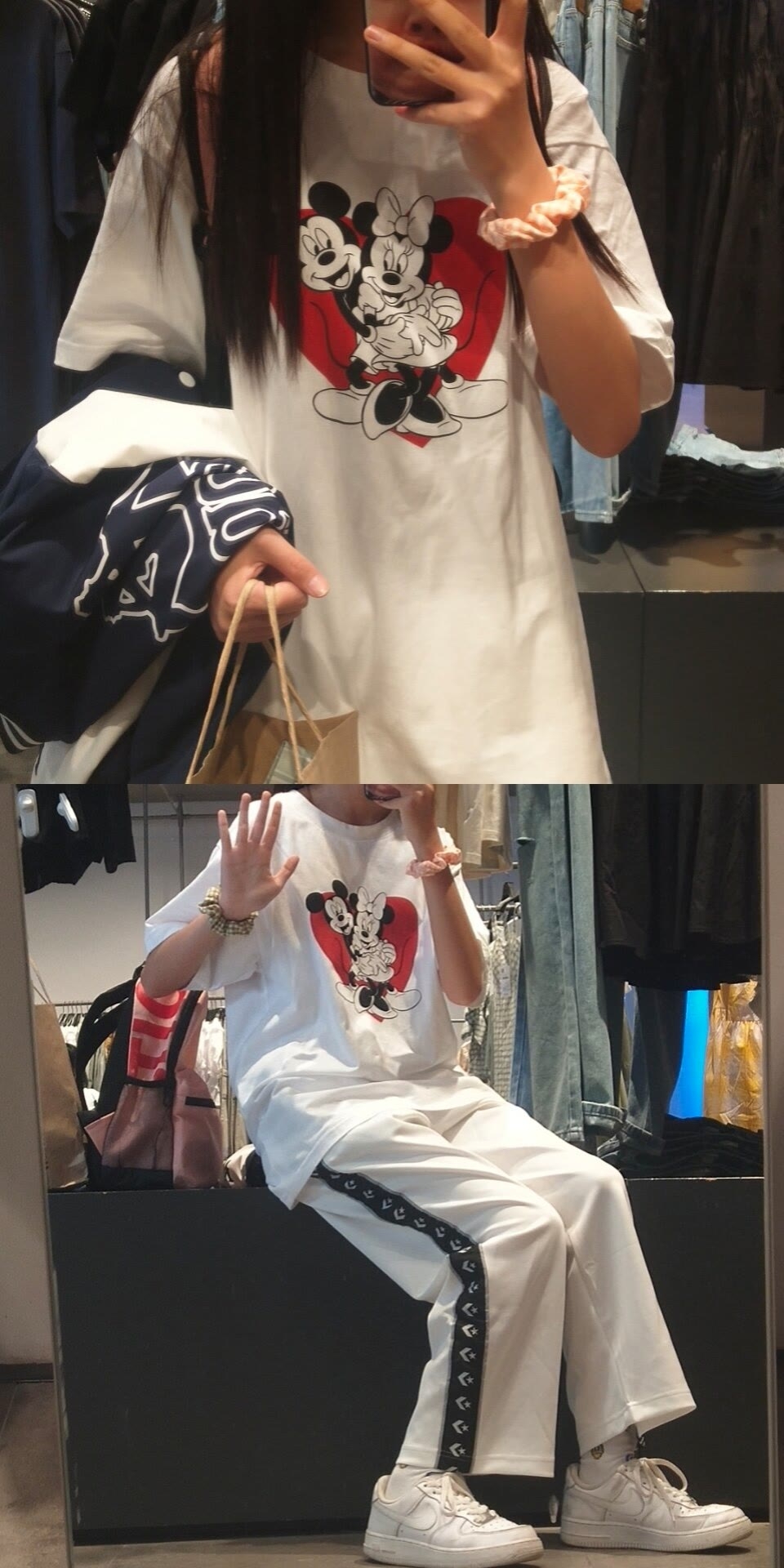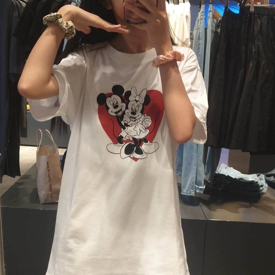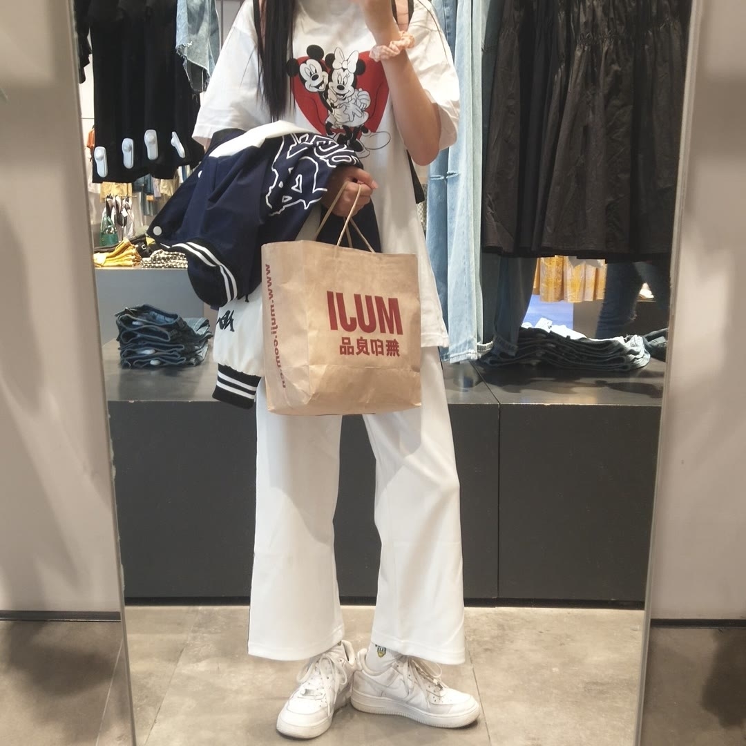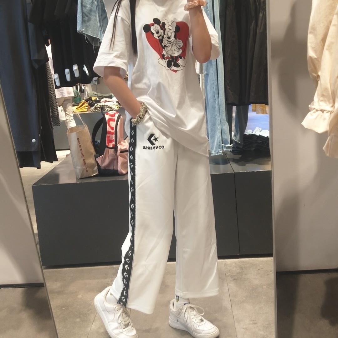 👚:白T恤米老鼠百搭款 👖:匡威的特别容易脏显胖 👠:万年百搭款空军一号 穿搭评分七分因为裤子穿着真的超级显胖