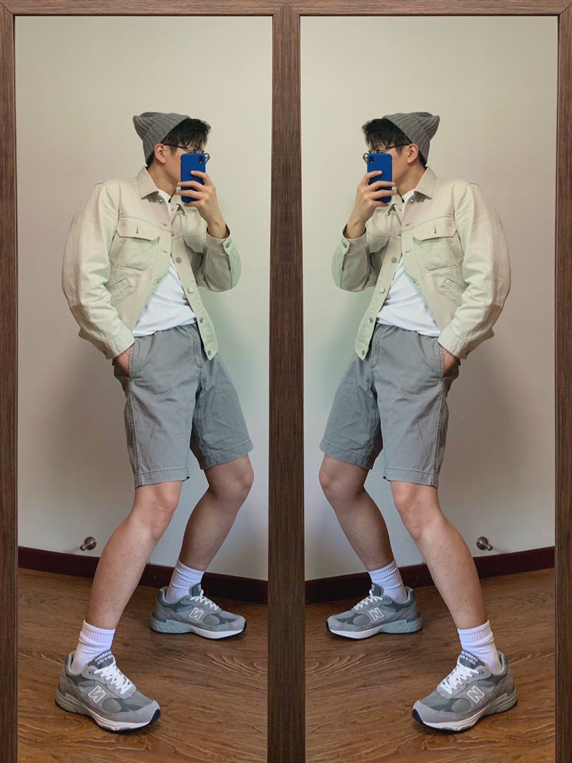夏天如果想穿出与众不同,叠穿是首选,上衣利用T恤和长袖薄外套的叠搭,不仅可以增加层次感,还优化了头身比例! 冷帽:H&M 外套:Uniqlo 短裤:Timberland 鞋子:New balance993