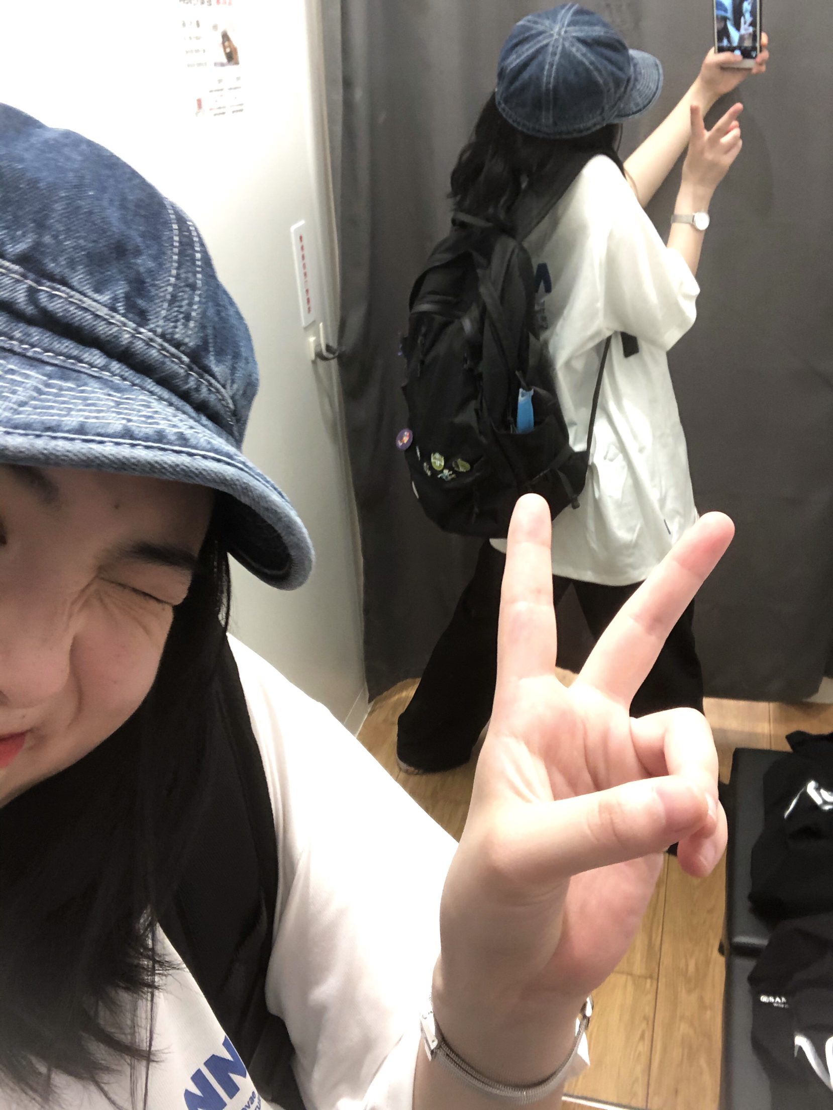 可戴与衣服印花相同色系的帽子 我衣服是蓝色印花所以我戴了一个同色系的牛仔帽 搭配黑色书包和宽容西服裤 ☑️