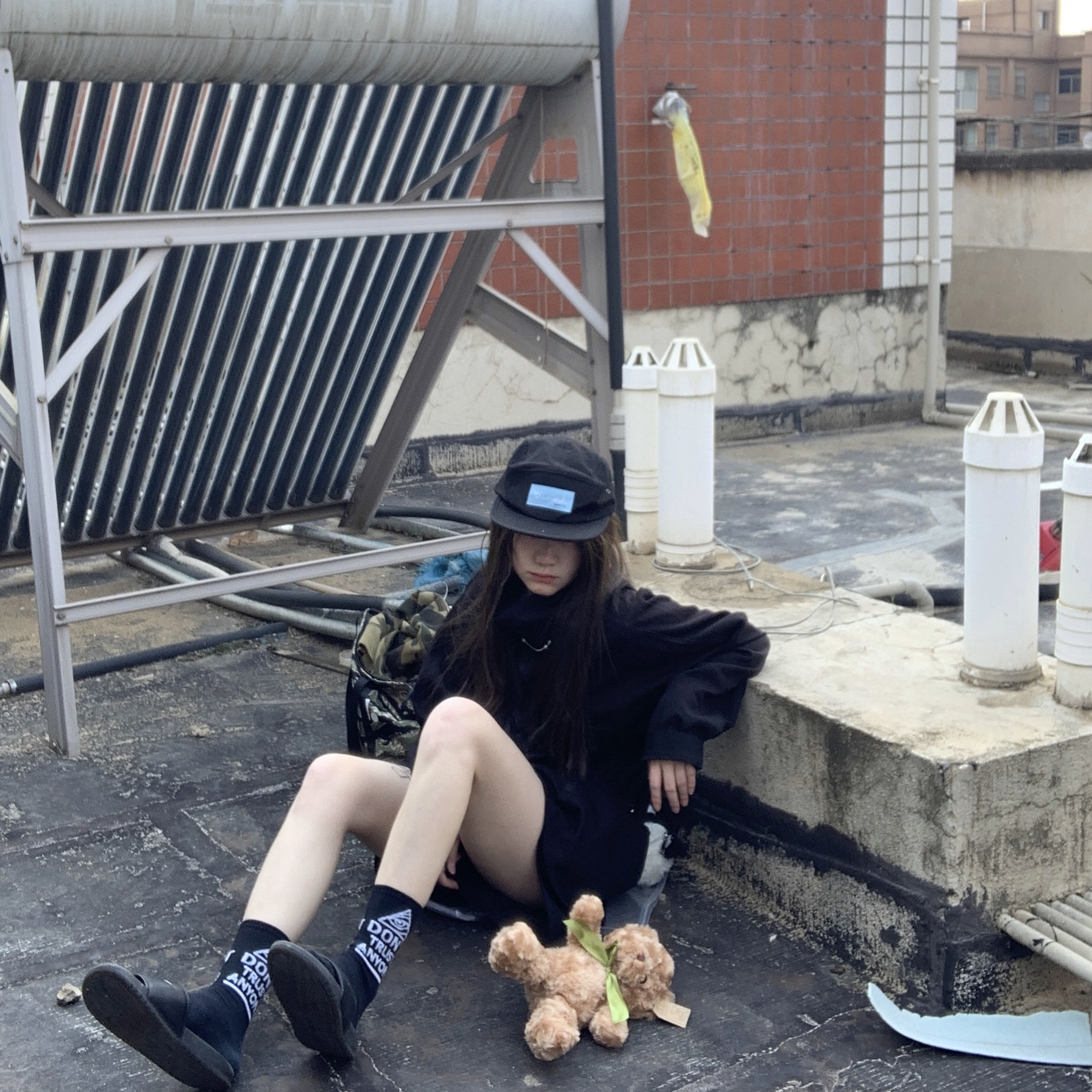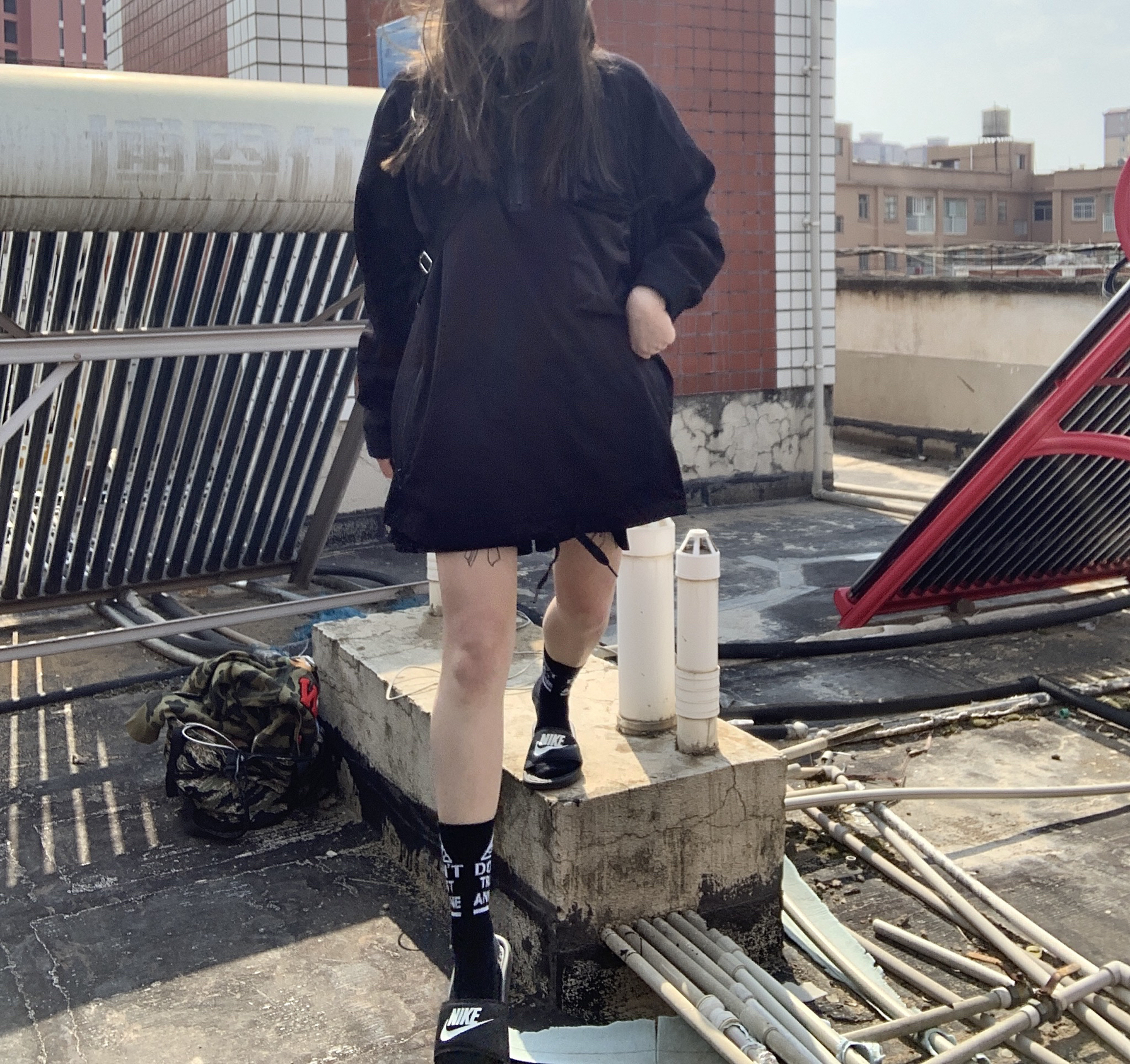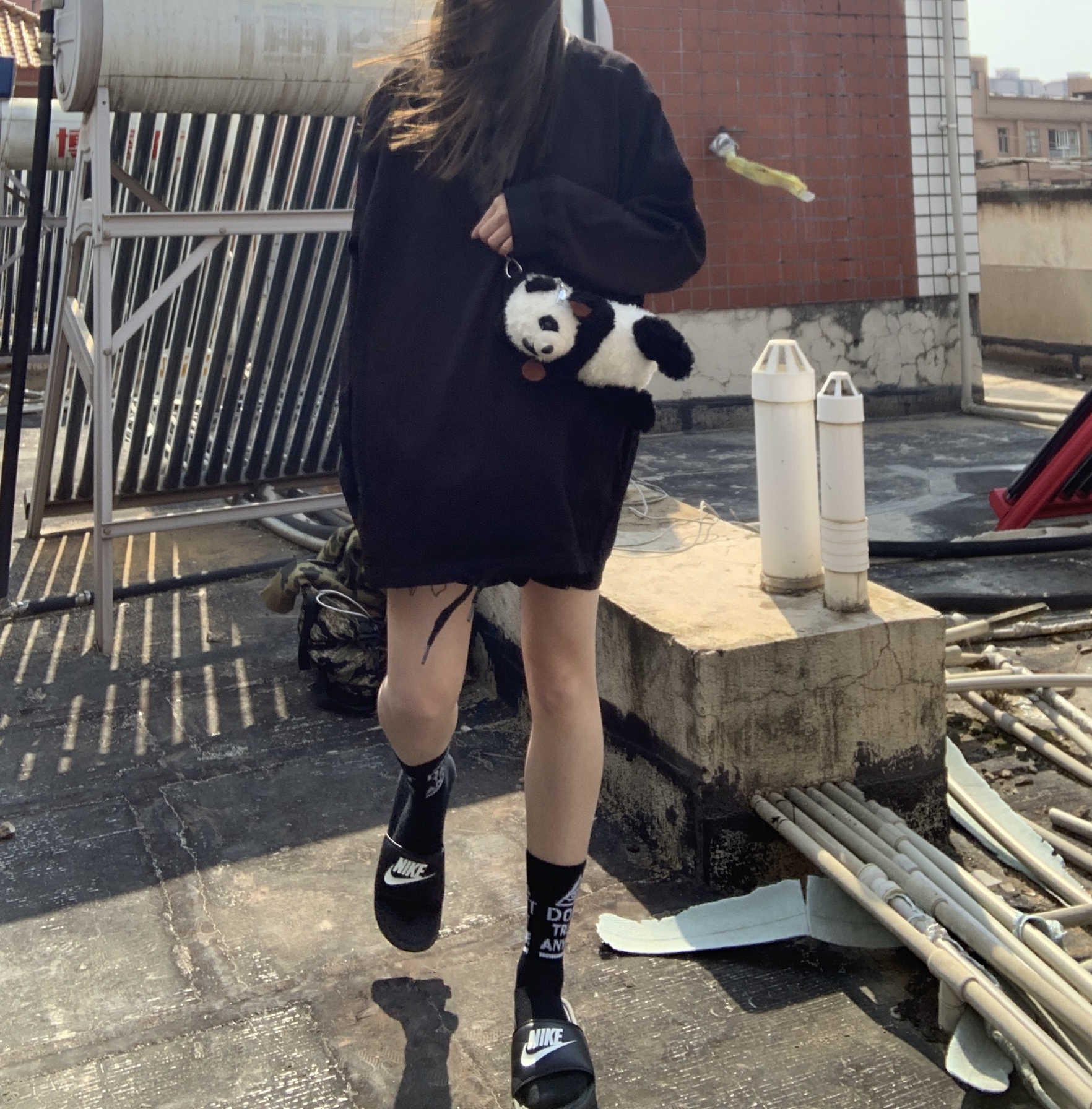 👔:怎么都找不到链接的黑色卫衣 👖:黑色五分裤 🧦:原宿街头潮牌嘻哈BF风字母长筒棉袜 👟:nike 一身黑搭配 是常态 袜子配配拖鞋也很酷哦