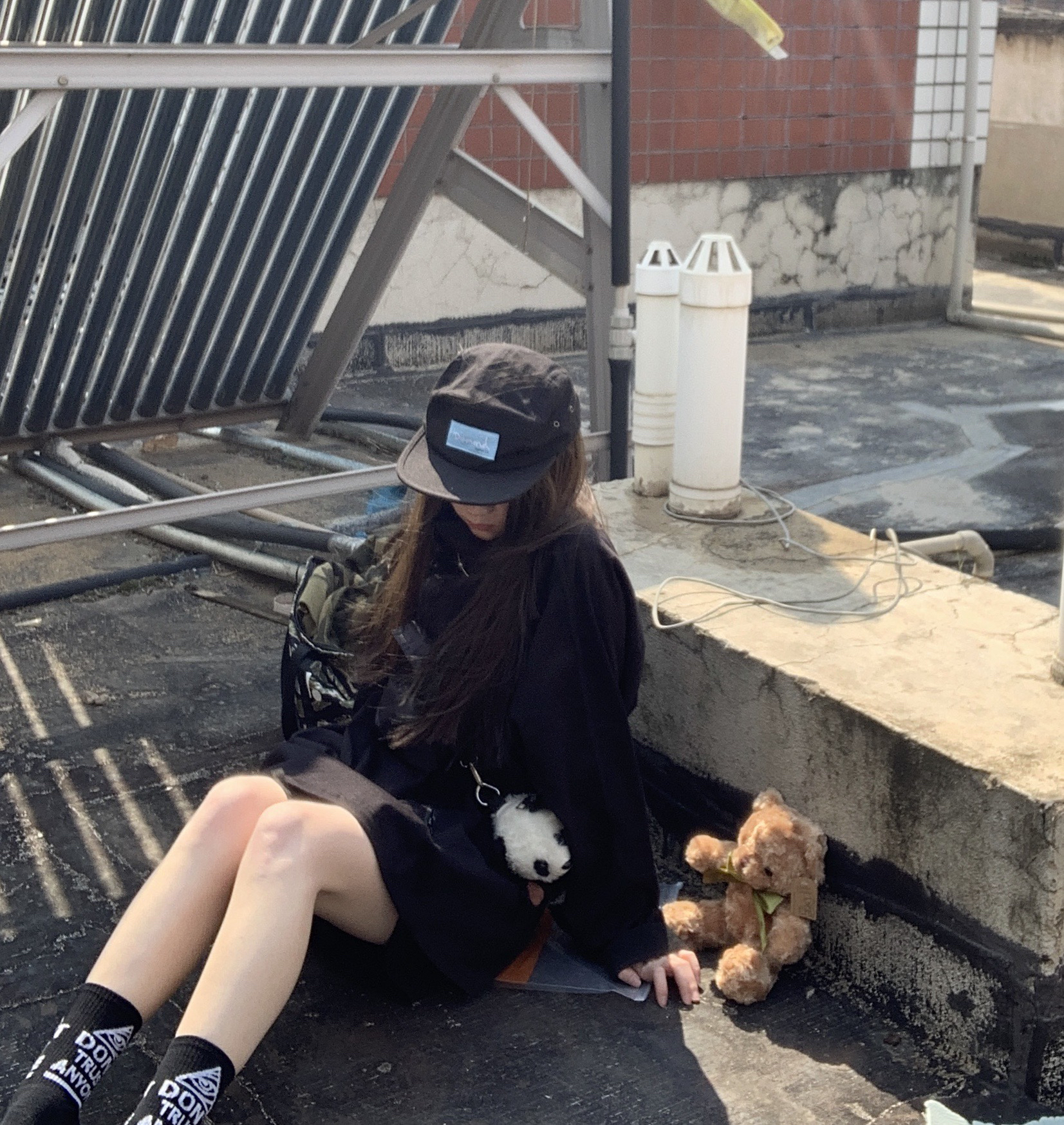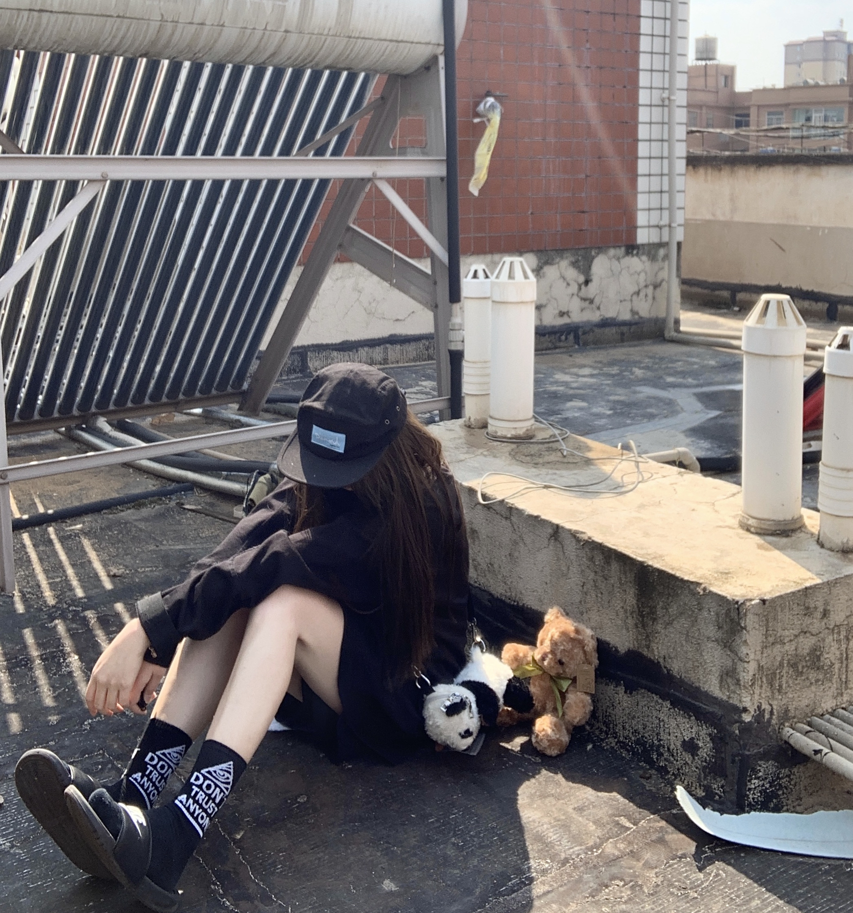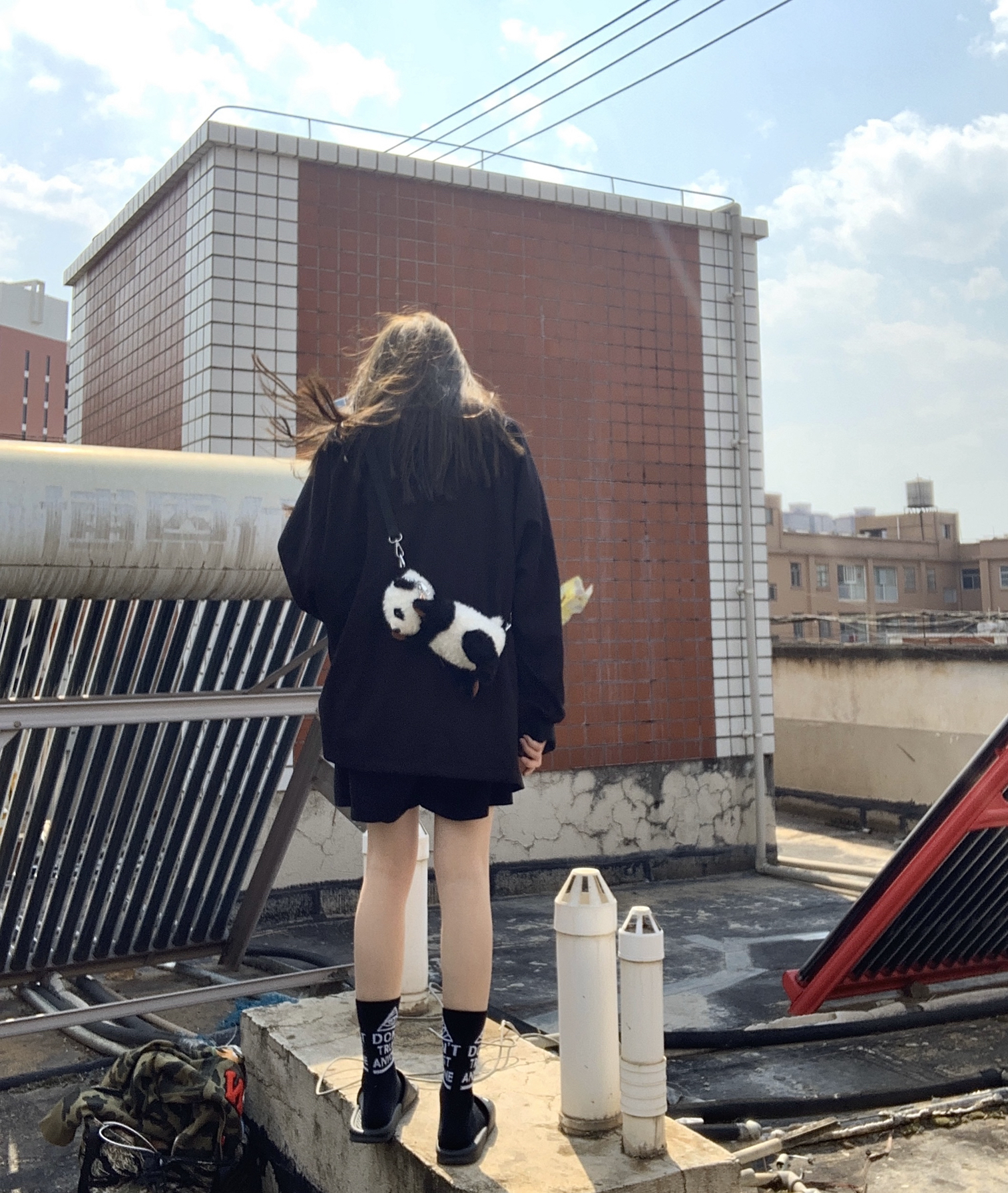 👔:怎么都找不到链接的黑色卫衣 👖:黑色五分裤 🧦:原宿街头潮牌嘻哈BF风字母长筒棉袜 👟:nike 一身黑搭配 是常态 袜子配配拖鞋也很酷哦