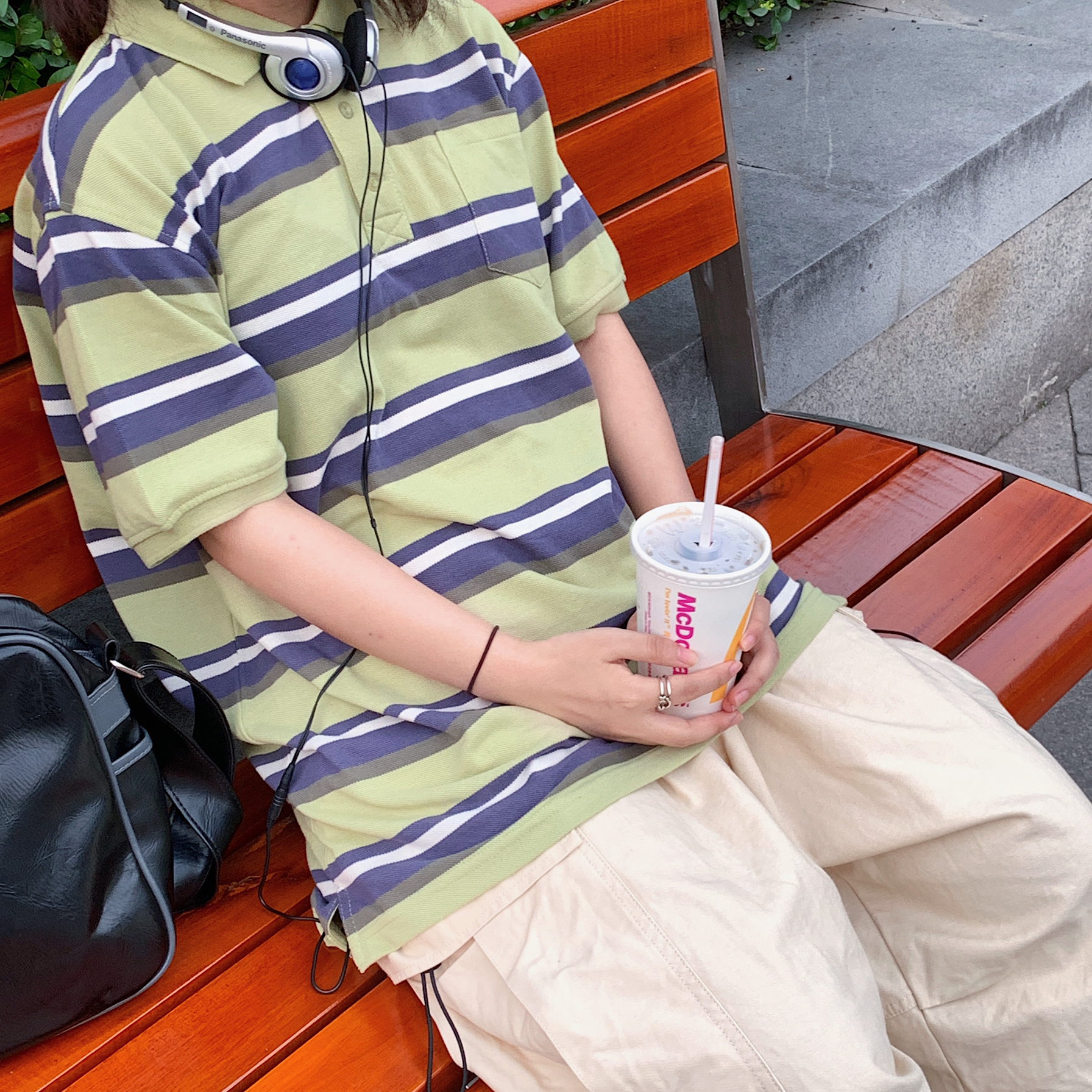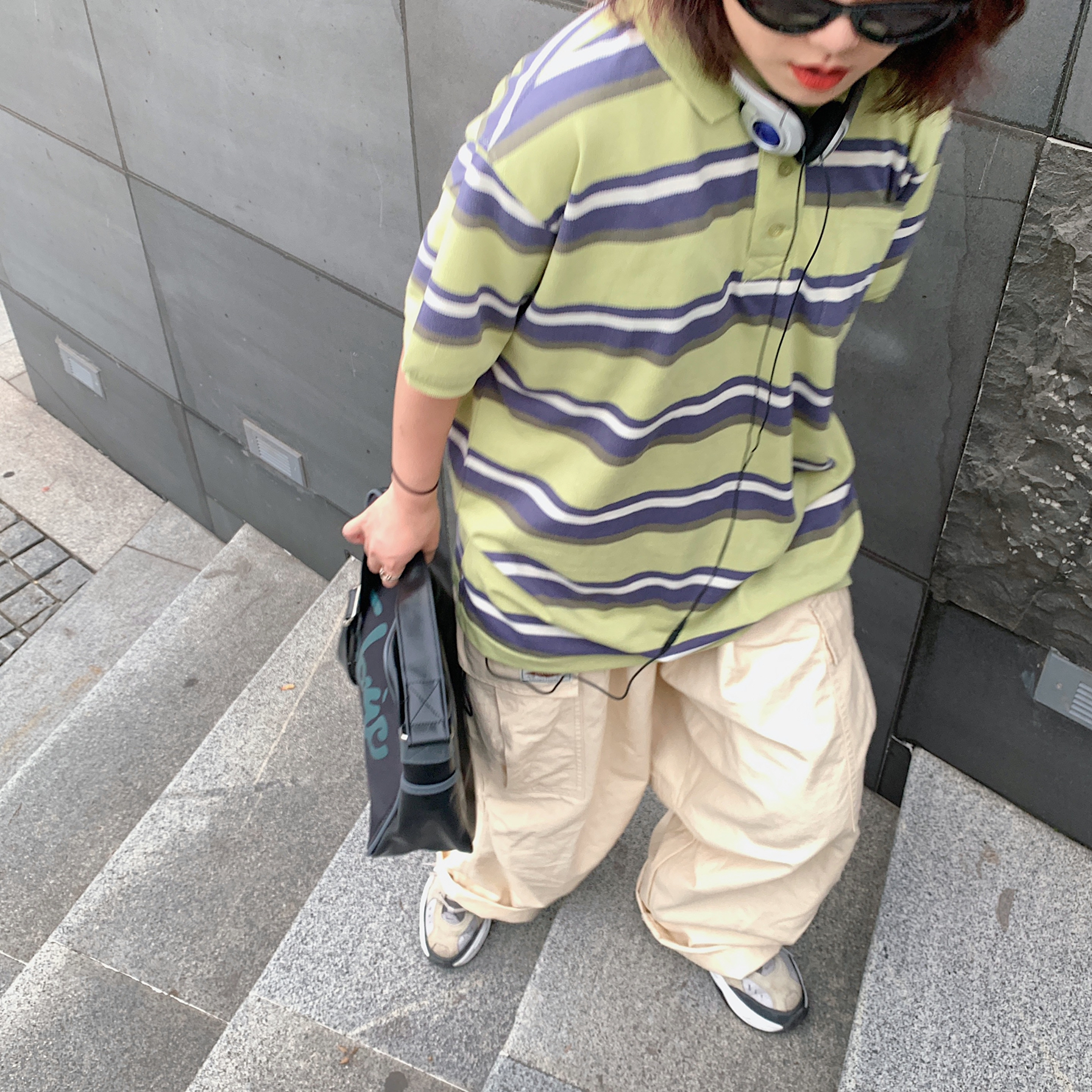 💥天气真的越来越热了 淡色单品穿起来8⃣️ 绿色条纹polo衫👕干净又简约 条纹怎么搭都不会出错❕ 🐾黑色裤子看腻了 米白色工装裤换一换感觉🌵 👟搭配Nike M2K