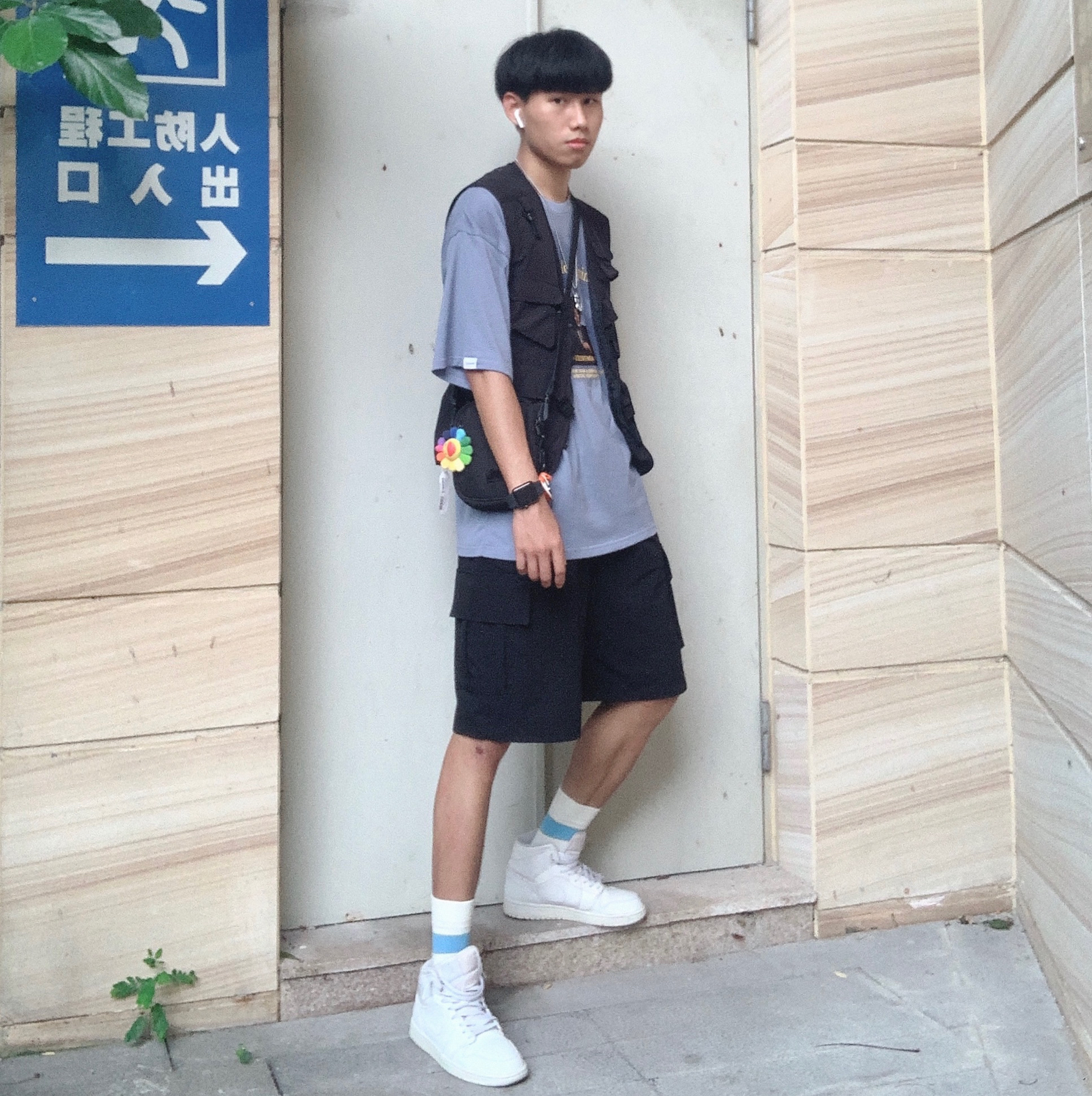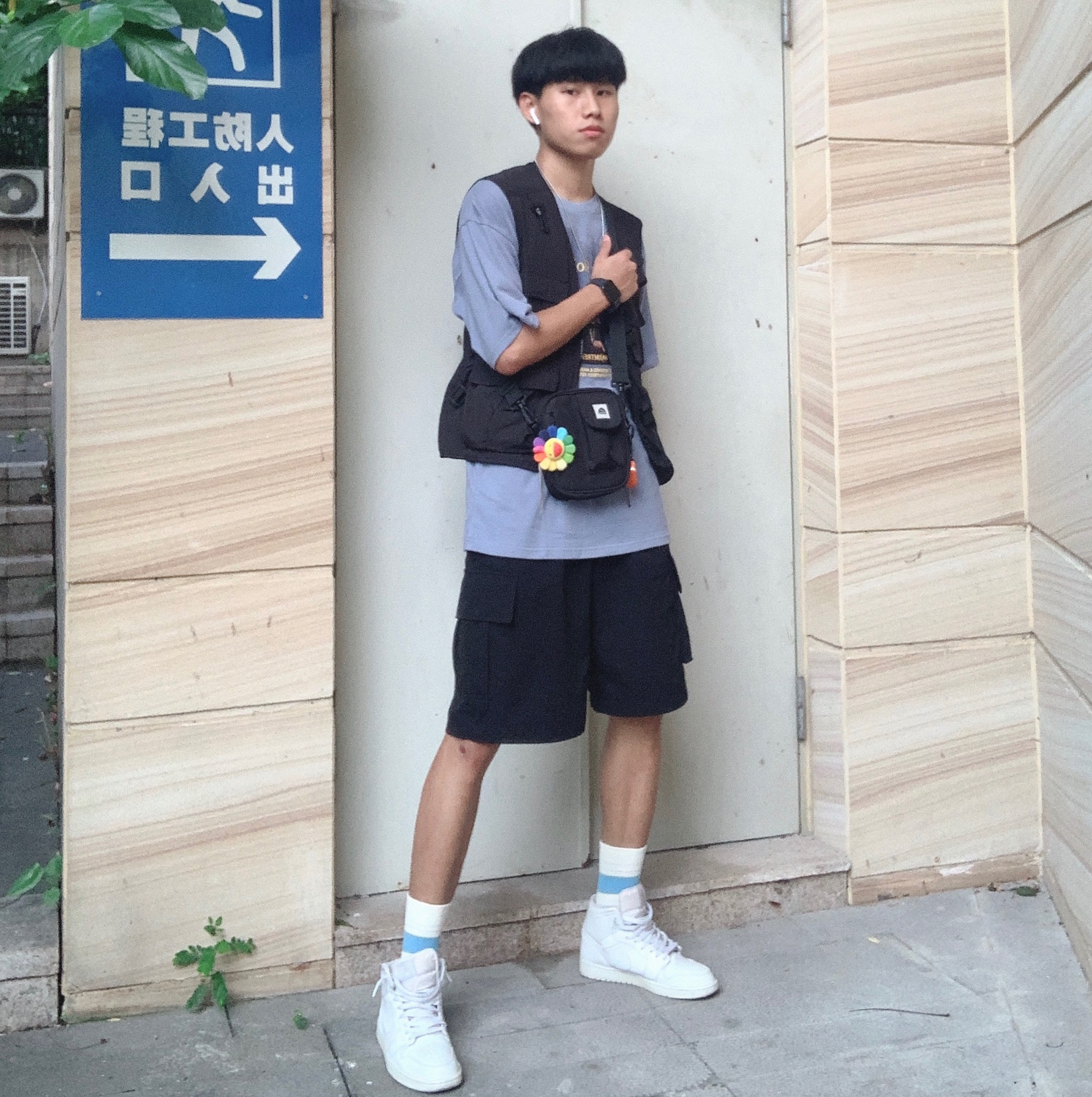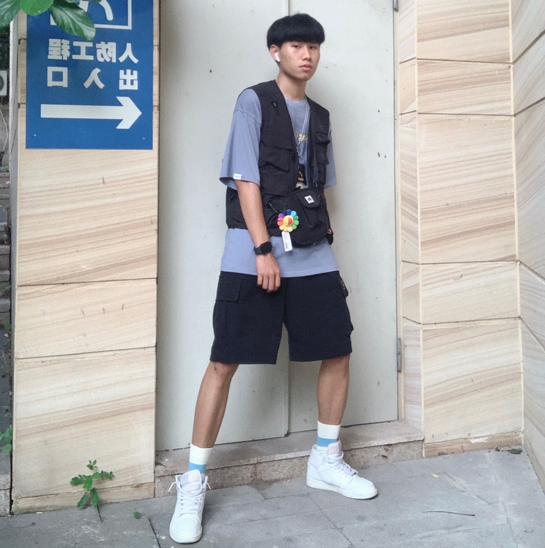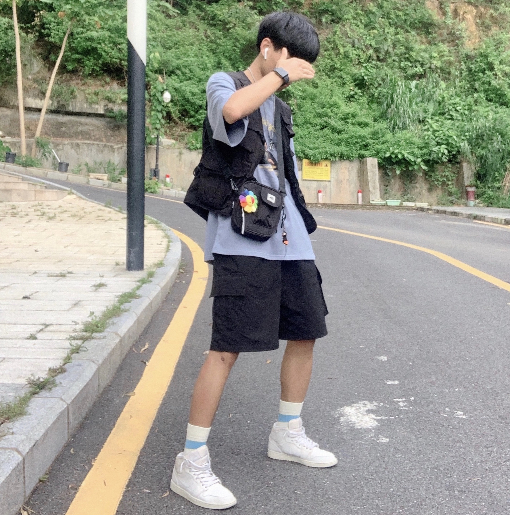 上衣:WARMTREES 马甲:FOLIECITY 19S/S 裤子:PUNIAMA 鞋子:aj1纯白 非常酷的一套工装穿搭,一件雾霾蓝色T加上百搭工装裤,没有什么比这个更酷,雾霾蓝色非常好看!雾霾蓝短袖外加马甲外套,使整体不单调,裤子选用黑色工装短裤,与马甲相呼应,鞋子也是比较百搭好看的aj1纯白,经典又百搭,帅气出街没毛病。