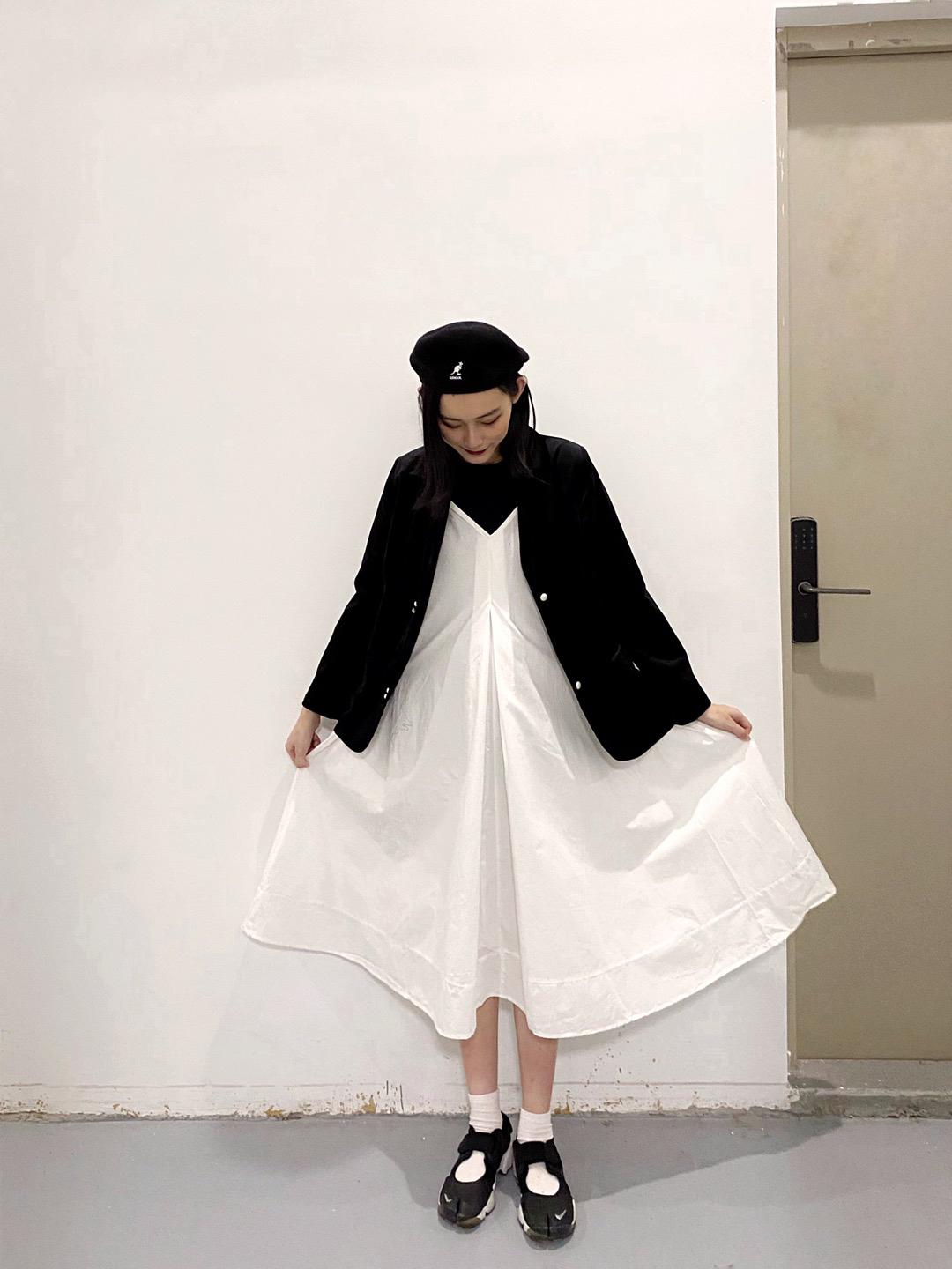 最爱黑白色系穿搭来啦 甜甜的白色裙子单穿适合外景拍照 日常穿搭可以里面搭Tee或者外面搭配外套 配上复古贝雷帽+分趾鞋即酷又适合拍照 帽子:Kangol Tee:优衣库 背心裙:淘宝 外套:子子非 鞋子:Nike Rift